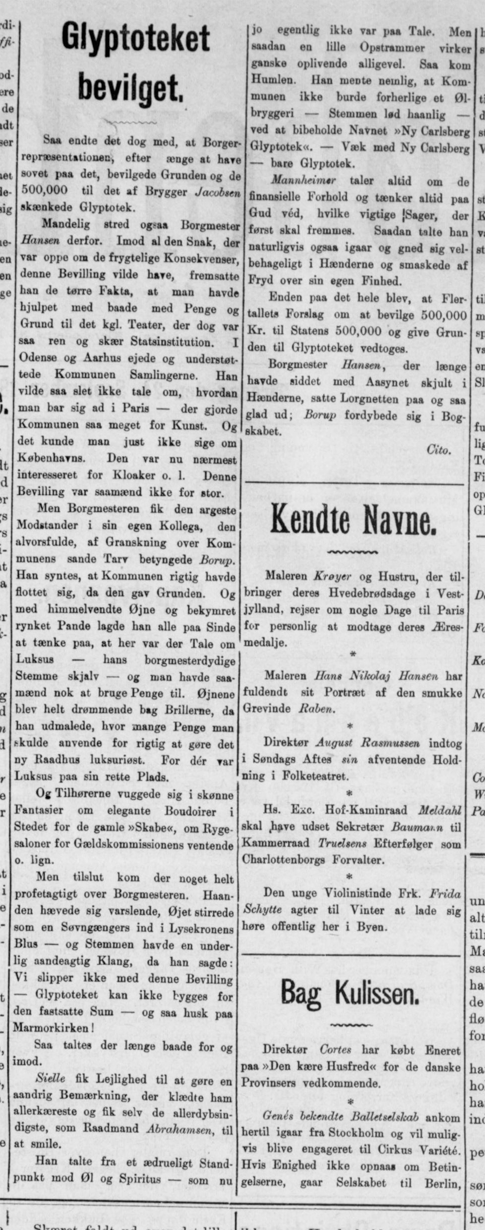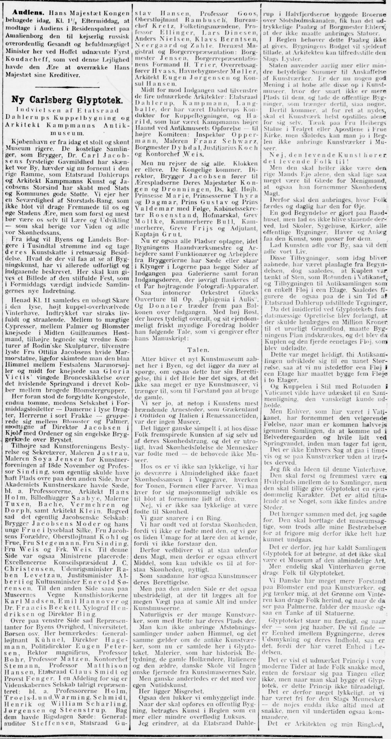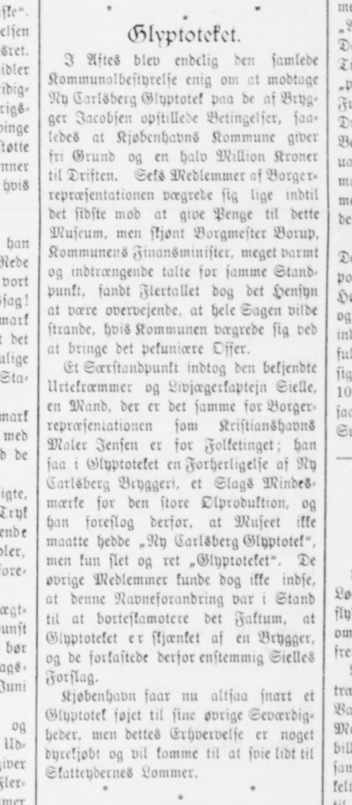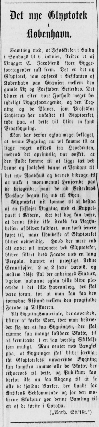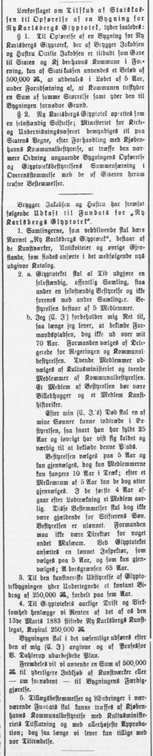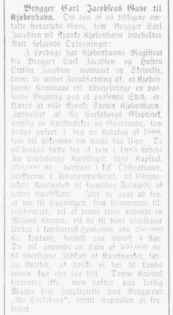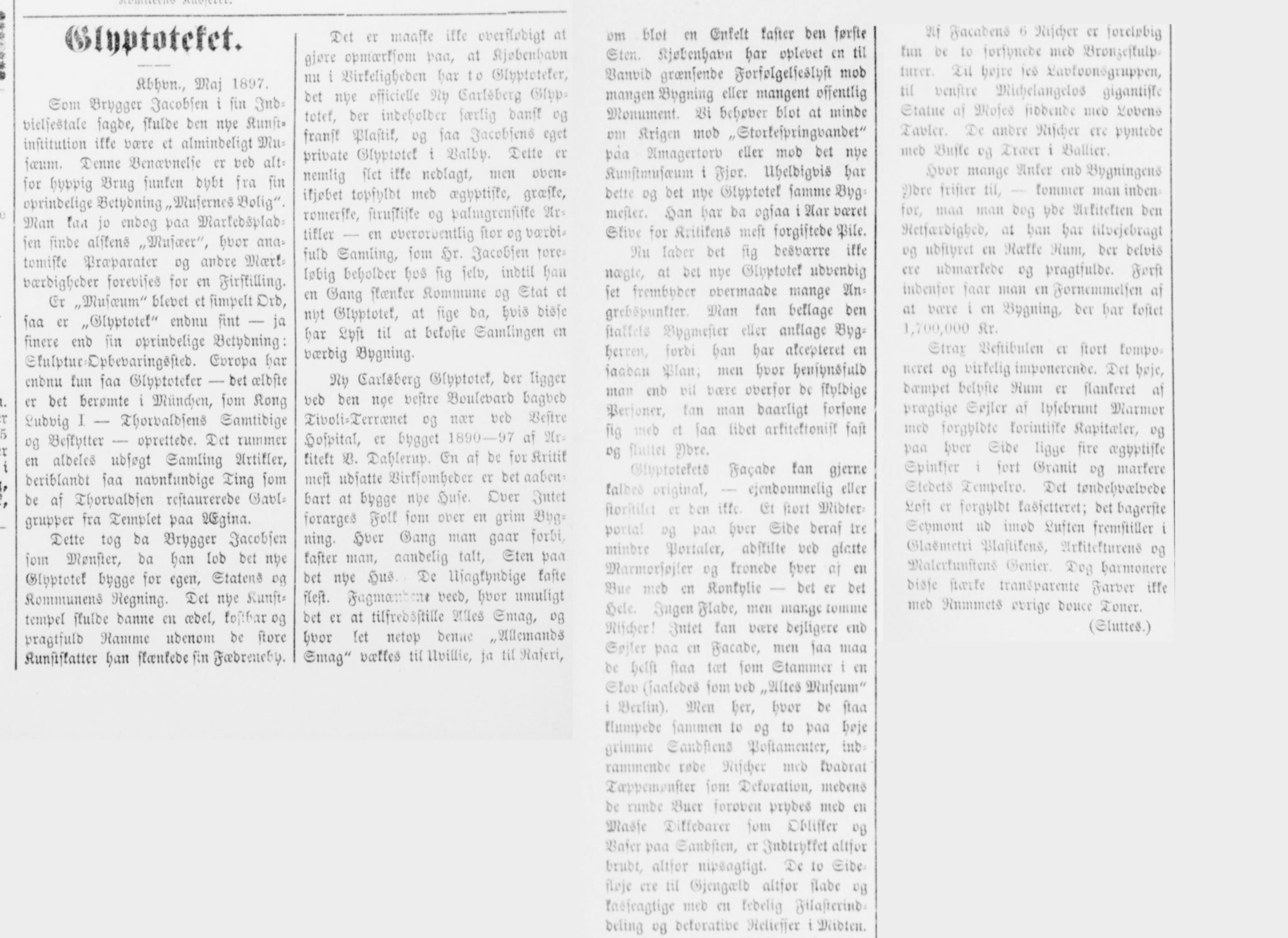 1888 article on Jacobsen's gift in Aftenbladet, Mediestream Det Kgl. Bibliotek | 1889 article in Østsjællands Folkeblad on the debate in the city council | 1889 article in København expressing incredulity at the council's delay in voting to build a museum for the gift | 1889 article in København about the council voting to give the land and the money to build Glyptoteket, Mediestream Det Kgl. Bibliotek | 1890, illustration of Dahlerup's planned building, Wikimedia Commons