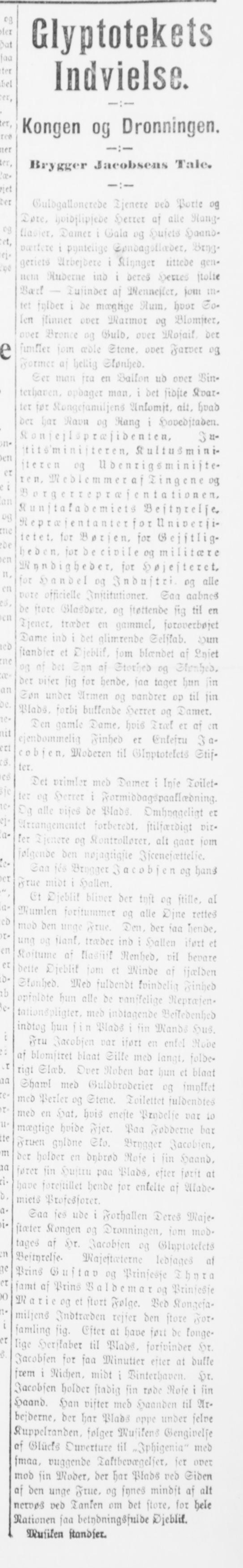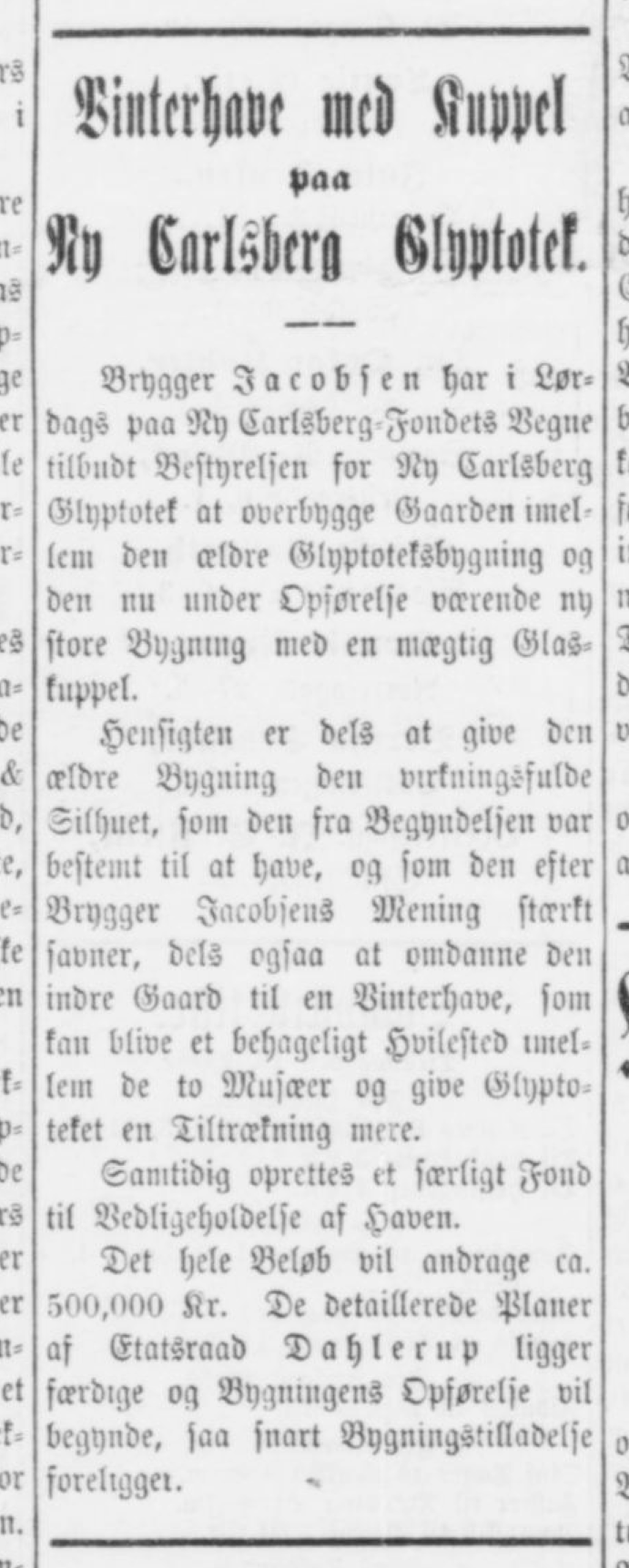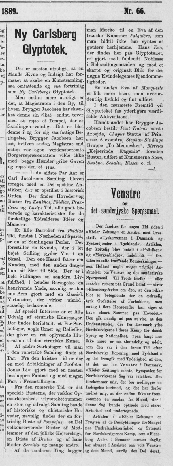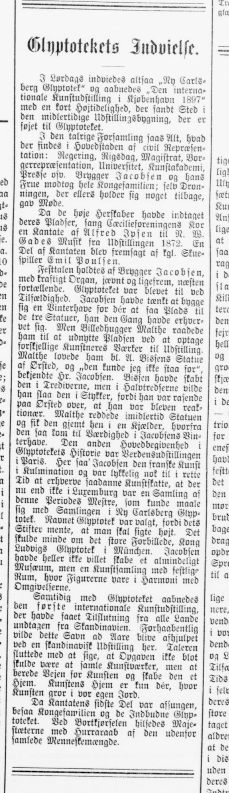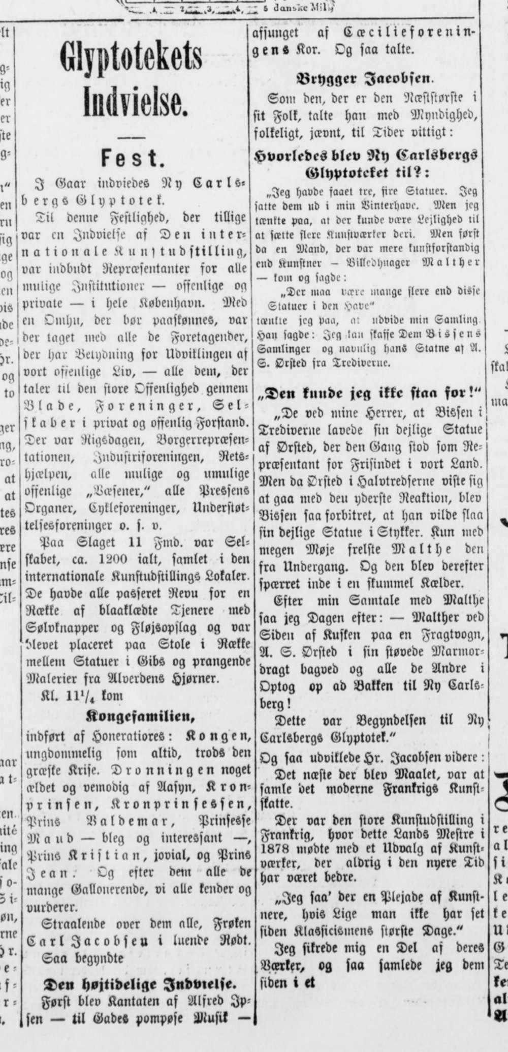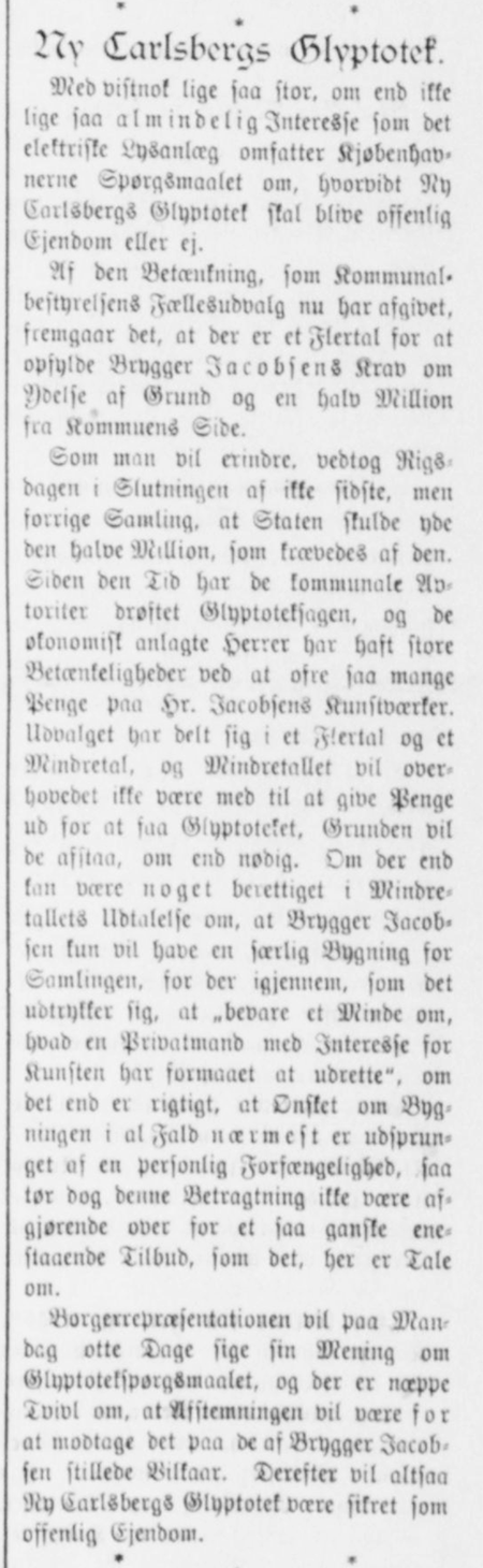 1888 article on Jacobsen's gift in Aftenbladet, Mediestream Det Kgl. Bibliotek | 1889 article in Østsjællands Folkeblad on the debate in the city council | 1889 article in København expressing incredulity at the council's delay in voting to build a museum for the gift | 1889 article in København about the council voting to give the land and the money to build Glyptoteket, Mediestream Det Kgl. Bibliotek | 1890, illustration of Dahlerup's planned building, Wikimedia Commons