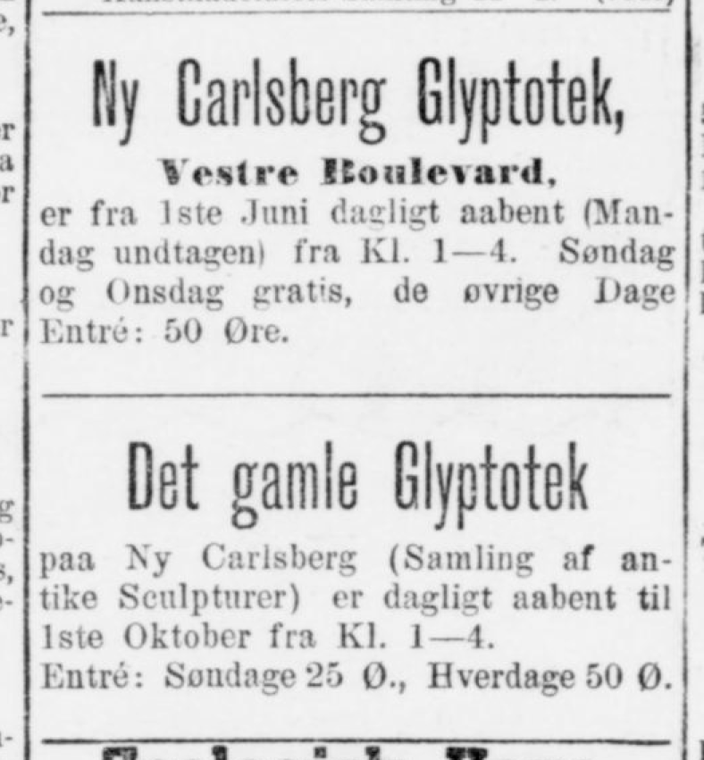 1897 ad for the inaugural exhibition, Mediestream, Det Kgl. Bibliotek | 1898 ad for the two Glyptoteks, Mediestream, Det Kgl. Bibliotek