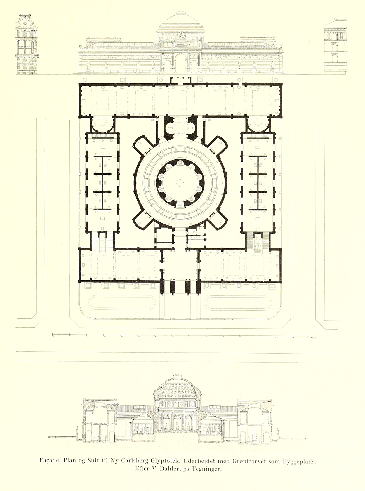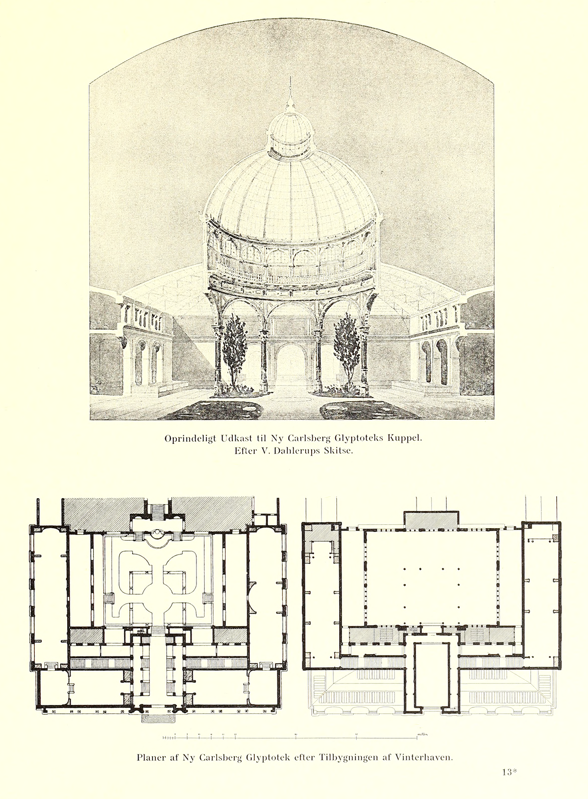 Dahlerup’s plans for Glyptoteket included a lavish dome from the beginning, but it was initially abandoned for cost reasons, which also scuppered plans to face the sides with granite and limestone rather than brick.