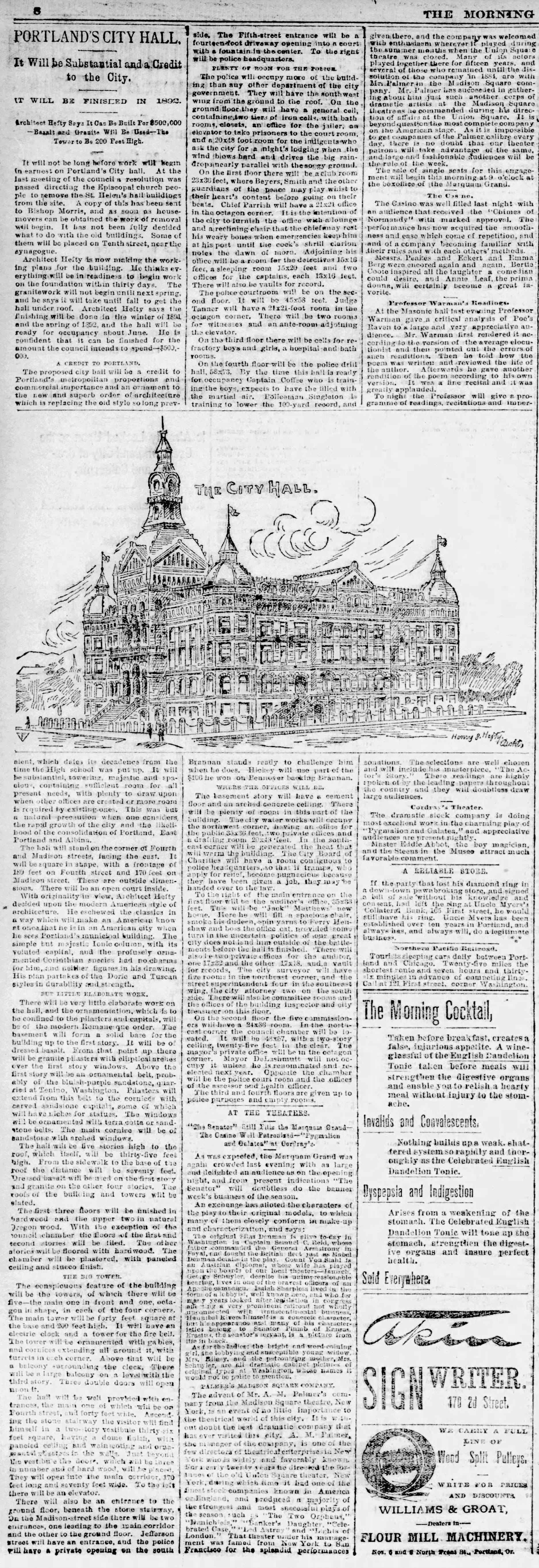 After slow progress on site selection and financing, the Portland City Council invited architects to submit plans for the design competition in spring 1890. Proposals from Hermann Steinmann and John Parkinson of Seattle won prizes, as well as Portland’s McCaw & Martin, but eclectic Swiss-American architect Henry J. Hefty won the commission. Hefty proposed an extravagant Second Empire bauble topped with a tower, and construction began in 1890.