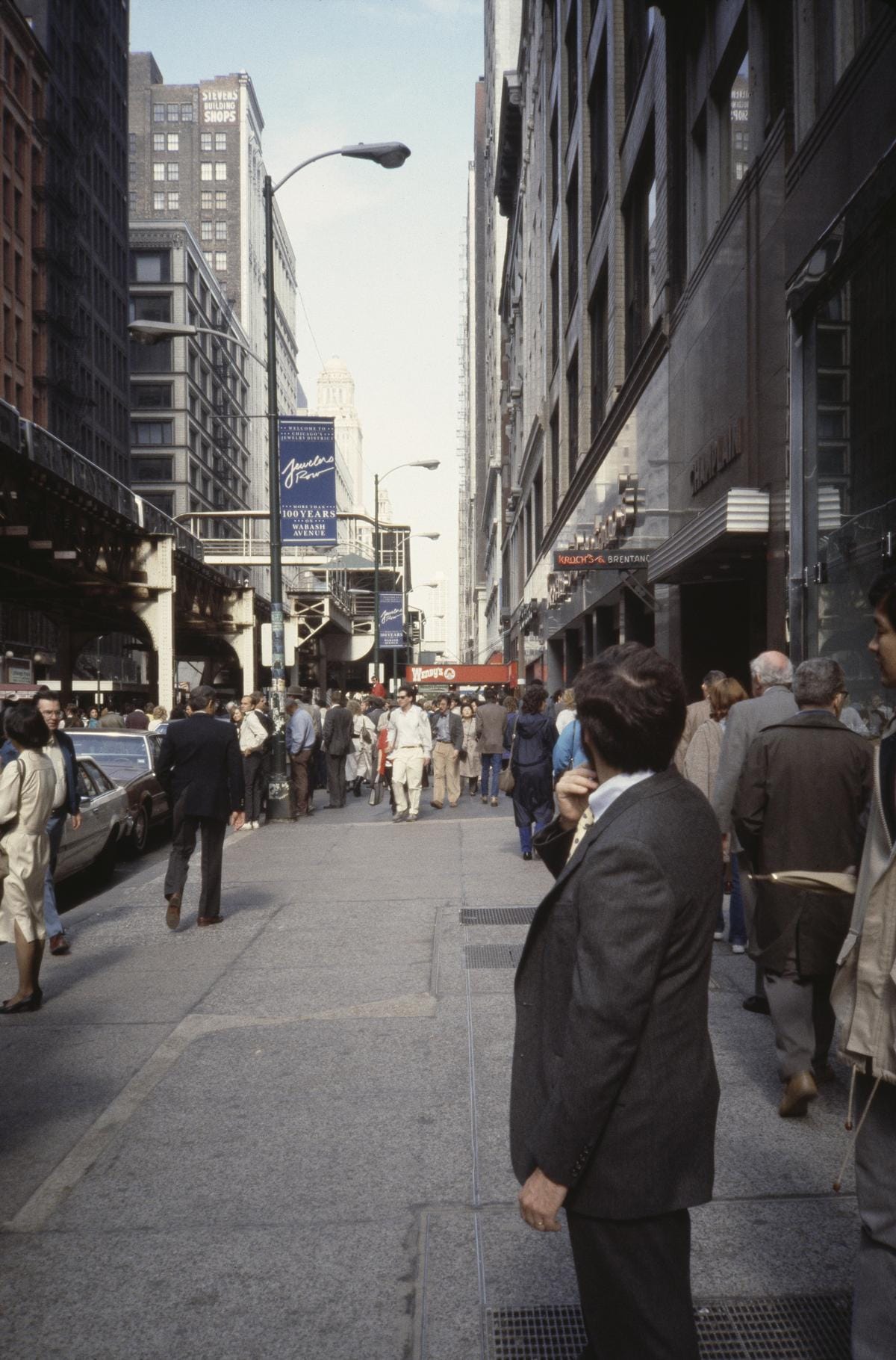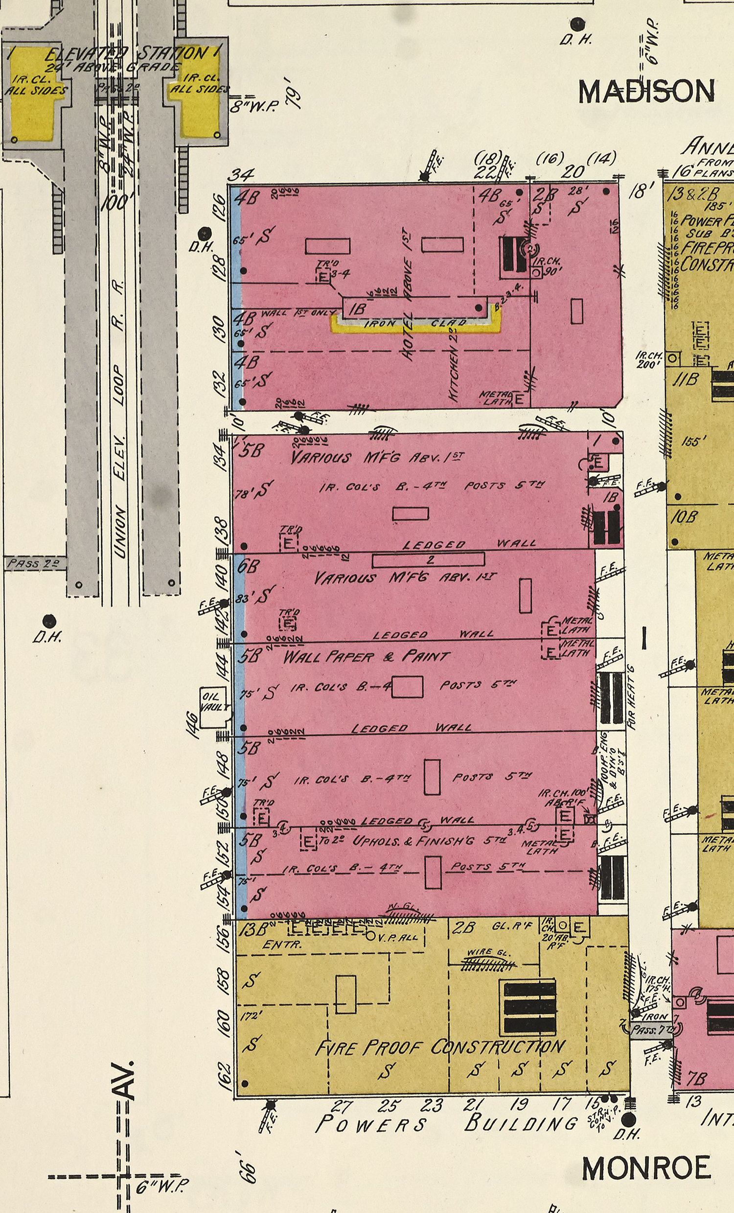 Wabash was the bustling utilitarian counterpart to the upmarket department stores of State Street one street over, even before the superstructure of the Union Loop Elevated put it into the literal shade in the 1890s. At the turn of the century, this block between Monroe and Madison typified that industrious mix of shops, light manufacturing, warehouses, and lofts.