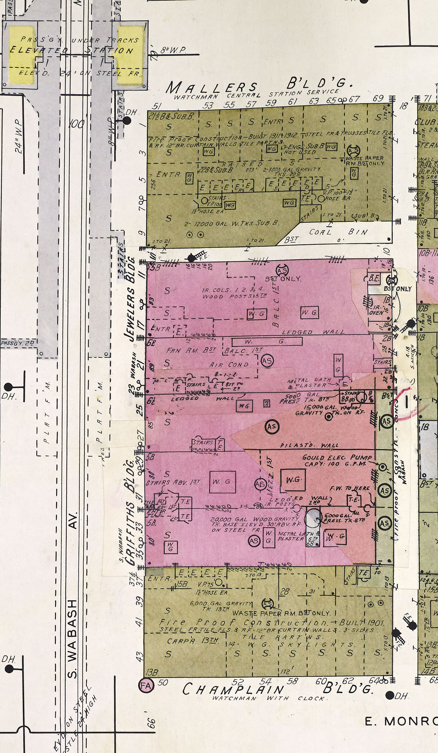 Pre-Loop photo of the S.A. Maxwell Building, Art Institute of Chicago Archives | ~1900 postcard image looking north on Wabash, Wikimedia Commons | 1906 Sanborn Fire Insurance Map | 1908, map of the fire swept region