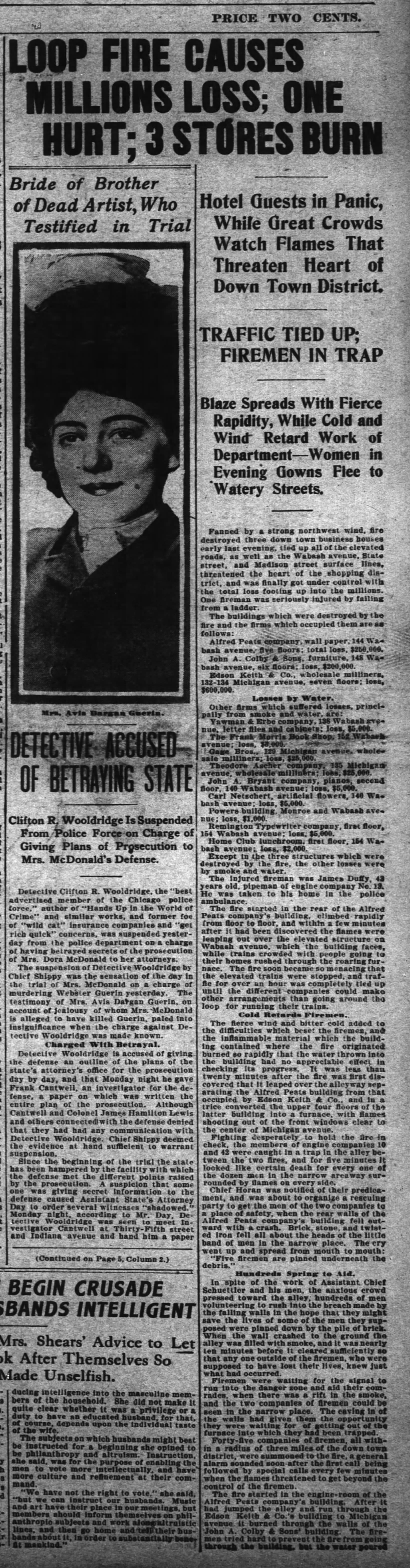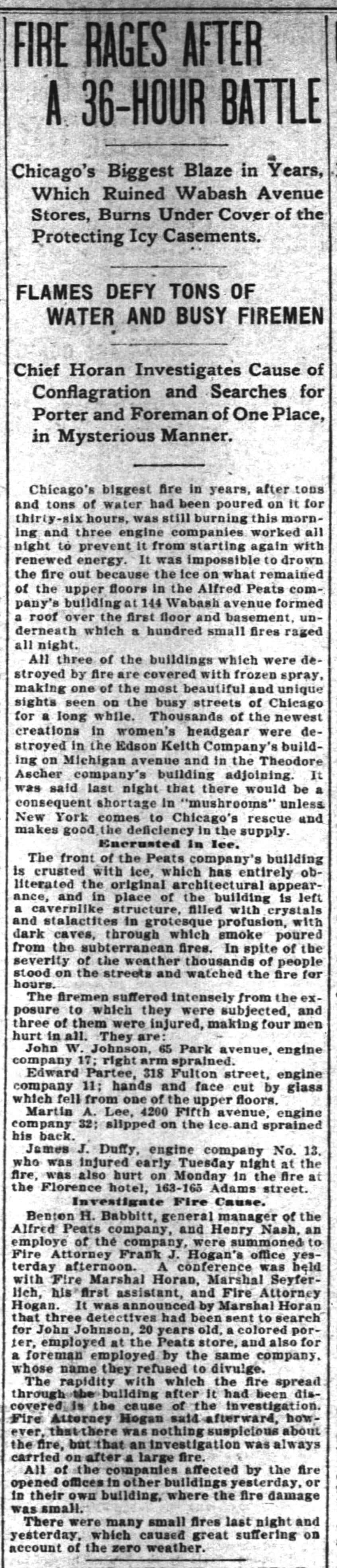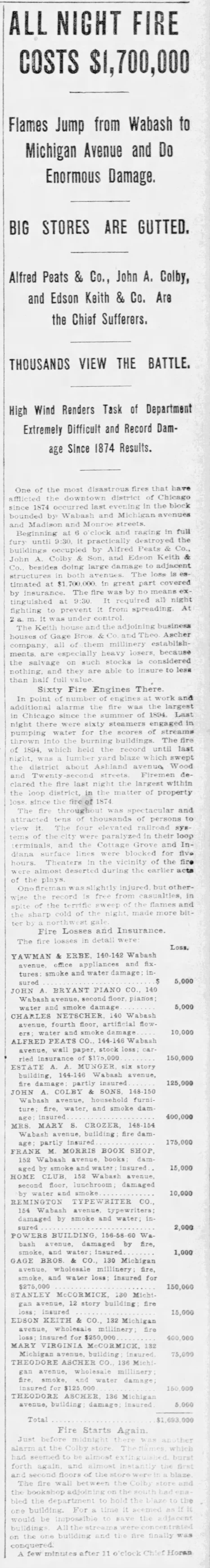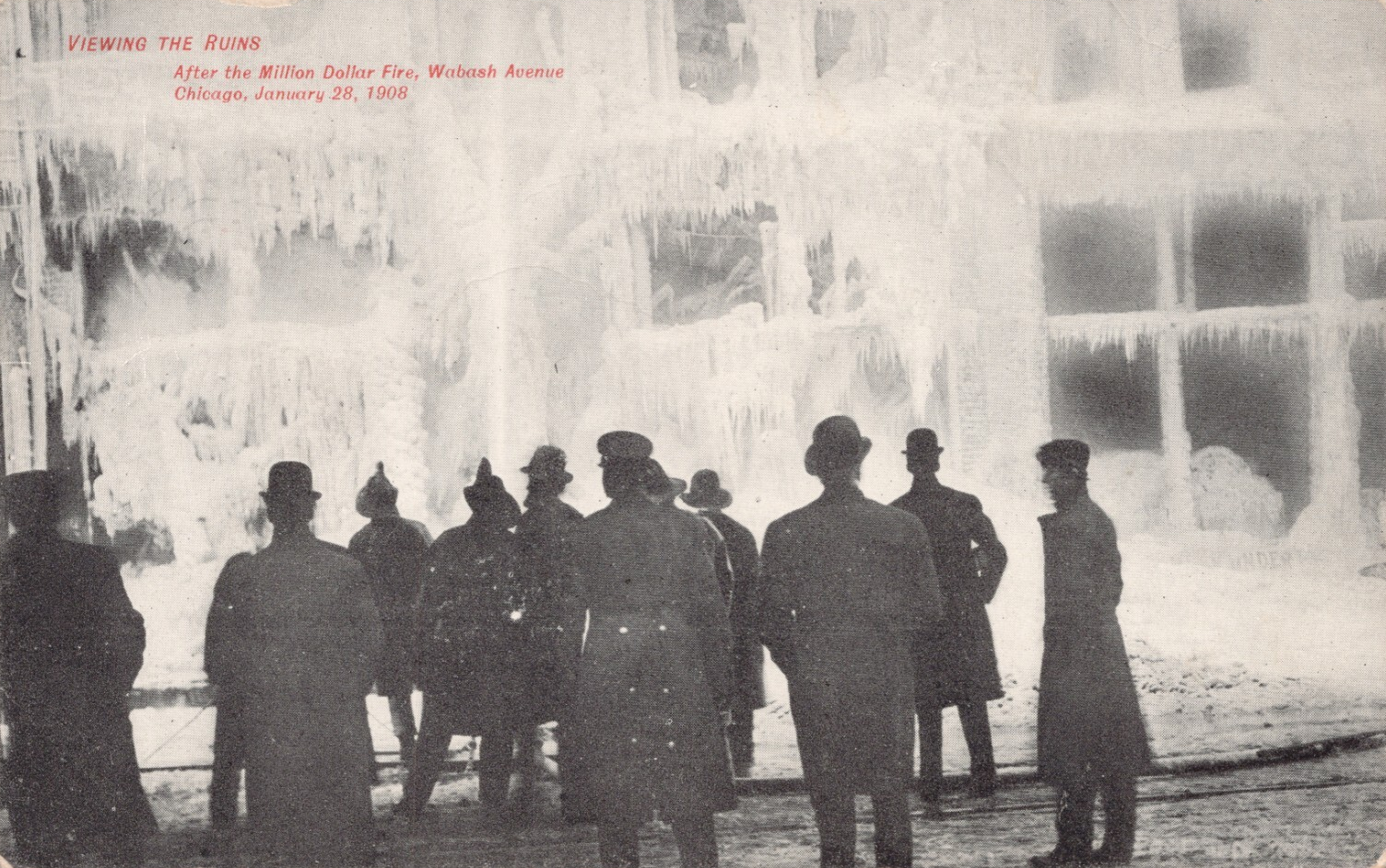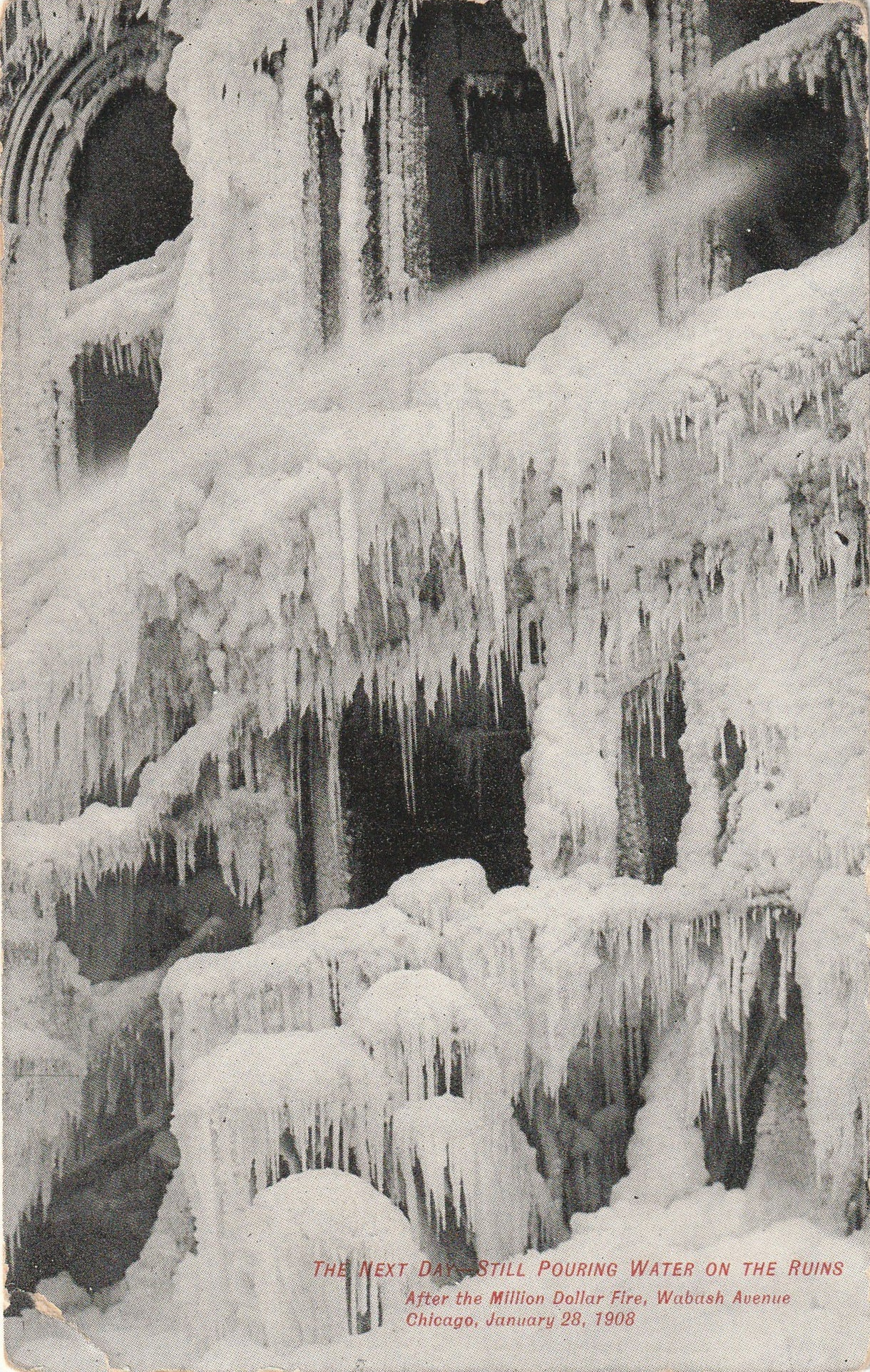 On a windy, cold Tuesday in January, 1908 a fire started in the basement of the Alfred Peats Wall Paper Company Building shortly after it closed for the night. Racing up the elevator shaft in the back of the building, the fire crossed the alleyway and set the Edson Keith Building on Michigan Avenue ablaze. Thousands—the Chicago Tribune said 50,000 and the Interocean said 15,000—congregated in Grant Park and at the Illinois Central tracks to watch as dozens of engine companies fought the blaze. The fire even threatened the Chicago Athletic Association until the winds shifted. It must have been a dry winter—this was the third serious fire in the city in three days—and this was the biggest fire downtown since the Little Chicago Fire of 1874. One difference was that the Union Loop L now ran down Wabash, and the fire department ran hoses up to the Wabash and Madison platform to fight this blaze. The front and rear facades of the Alfred Peats Building collapsed, but by 2:00am the fire was under control.