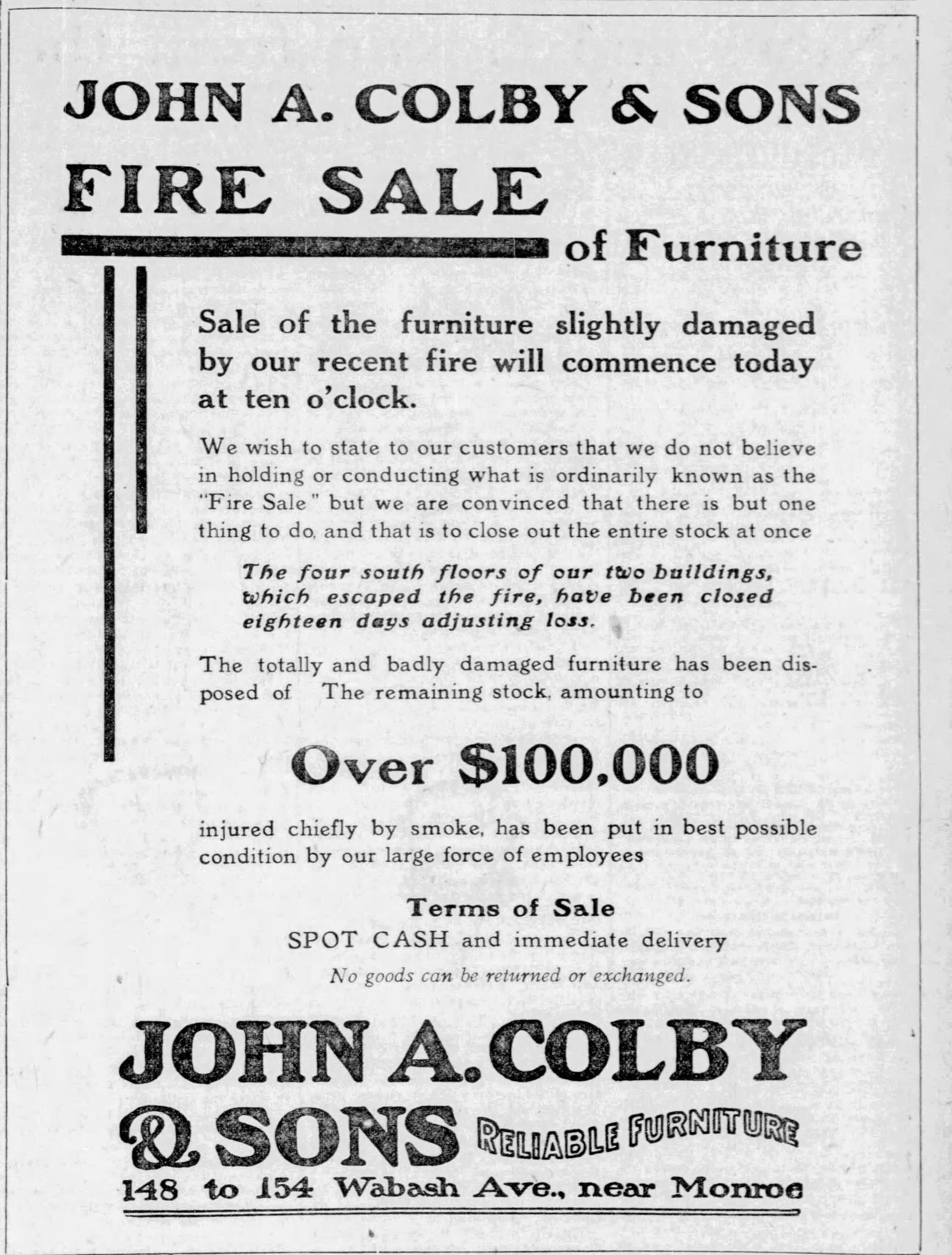 1908 newspaper photo, article, and ad for the John A. Colby & Sons fire sale | 1908, ground lease and new building for Alfred Peats | 1915, Griffiths buys the Crozer estate building | 1950 Sanborn Fire Insurance Map
