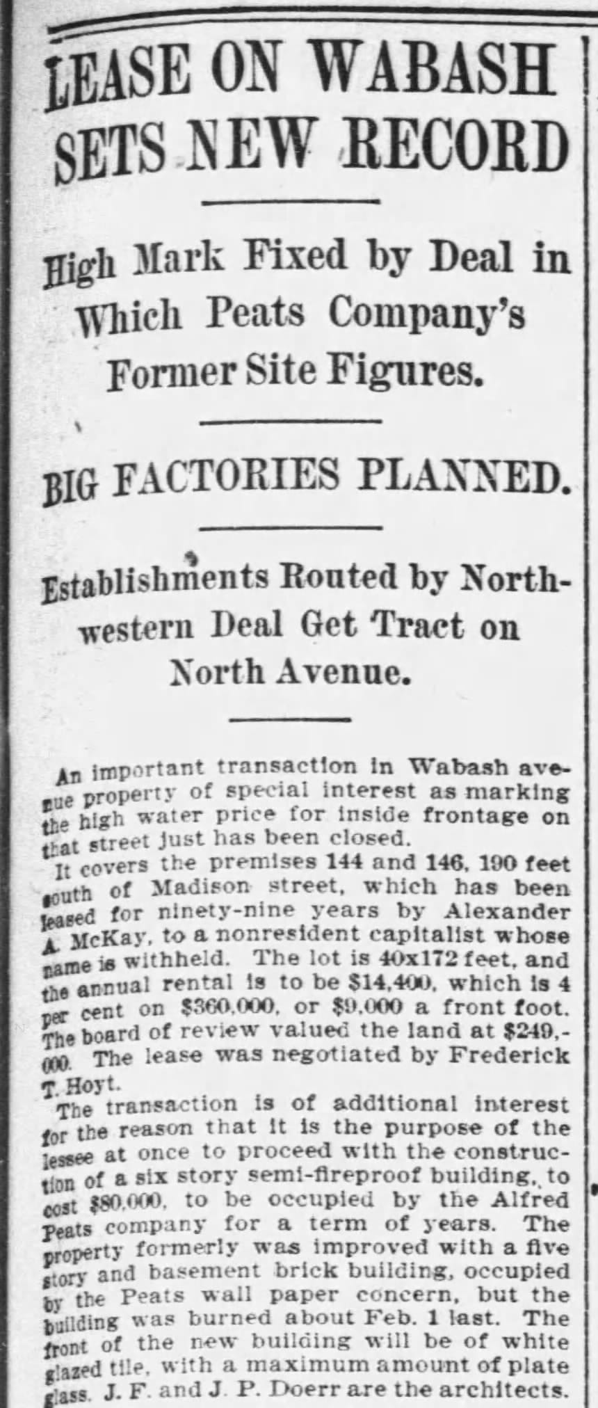 - The rebuilt Alfred Peat’s Building, 25-27 S. Wabash, housed Donchian Furniture, Grant’s Art Galleries, Utility Stationary Store, and a Walgreens (this was also the one that had an illegal book in the 1930s and 1940s)