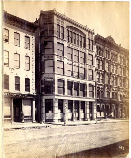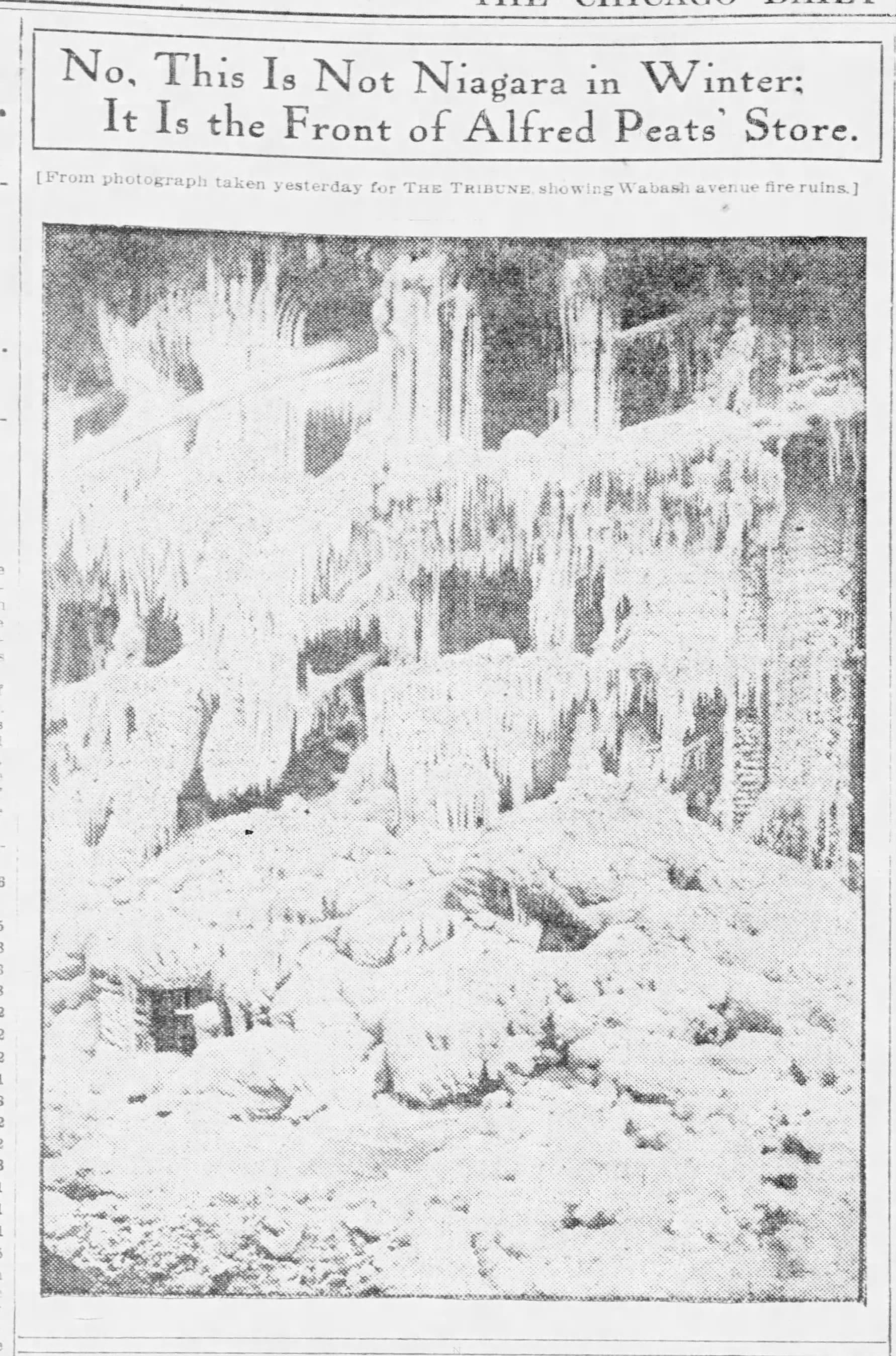 The Alfred Peats Building and John A. Colby & Sons Furniture section of the Crozen Building ended up caked in ice, at least one cast iron facade strewn onto the sidewalk. Initial losses were estimated at more than $1.7m (equivalent to $60m in 2026). Remarkably, only the Peats building was damaged beyond repair. Insurers declared the Crozen Estate Building, home to the Colby furniture store., the Morris Book Shop, and Remington Typewriters, a total loss, but as far as I can tell the owner just renovated the burned and flooded building and reopened. The Peats Building was demolished and rebuilt that same year, designed by the Doerr Bros. (the NRHP nomination and the Chicago Landmark Designation say this building was from 1872, but I’m pretty sure that’s wrong and they tore down that building after the fire).