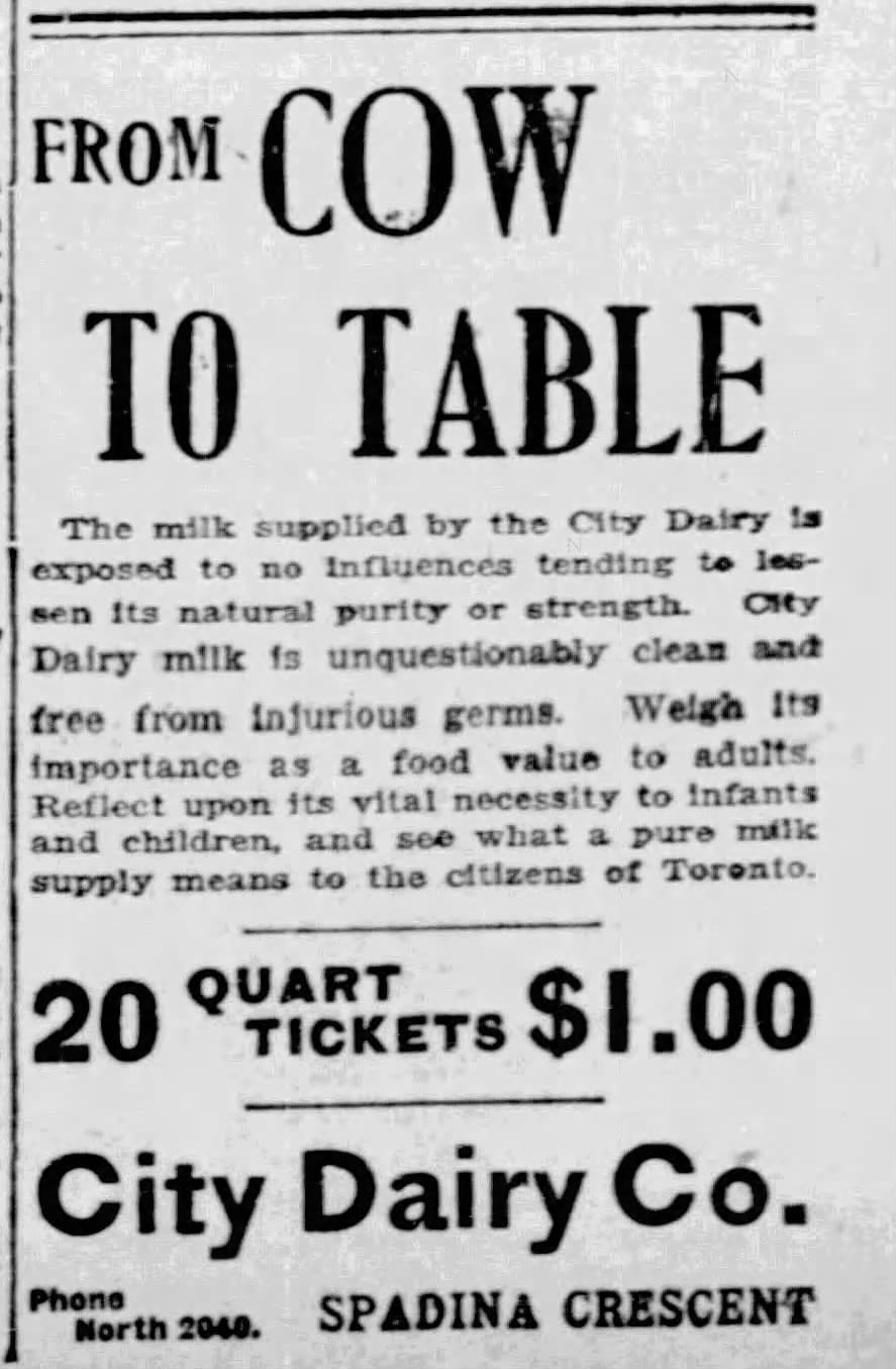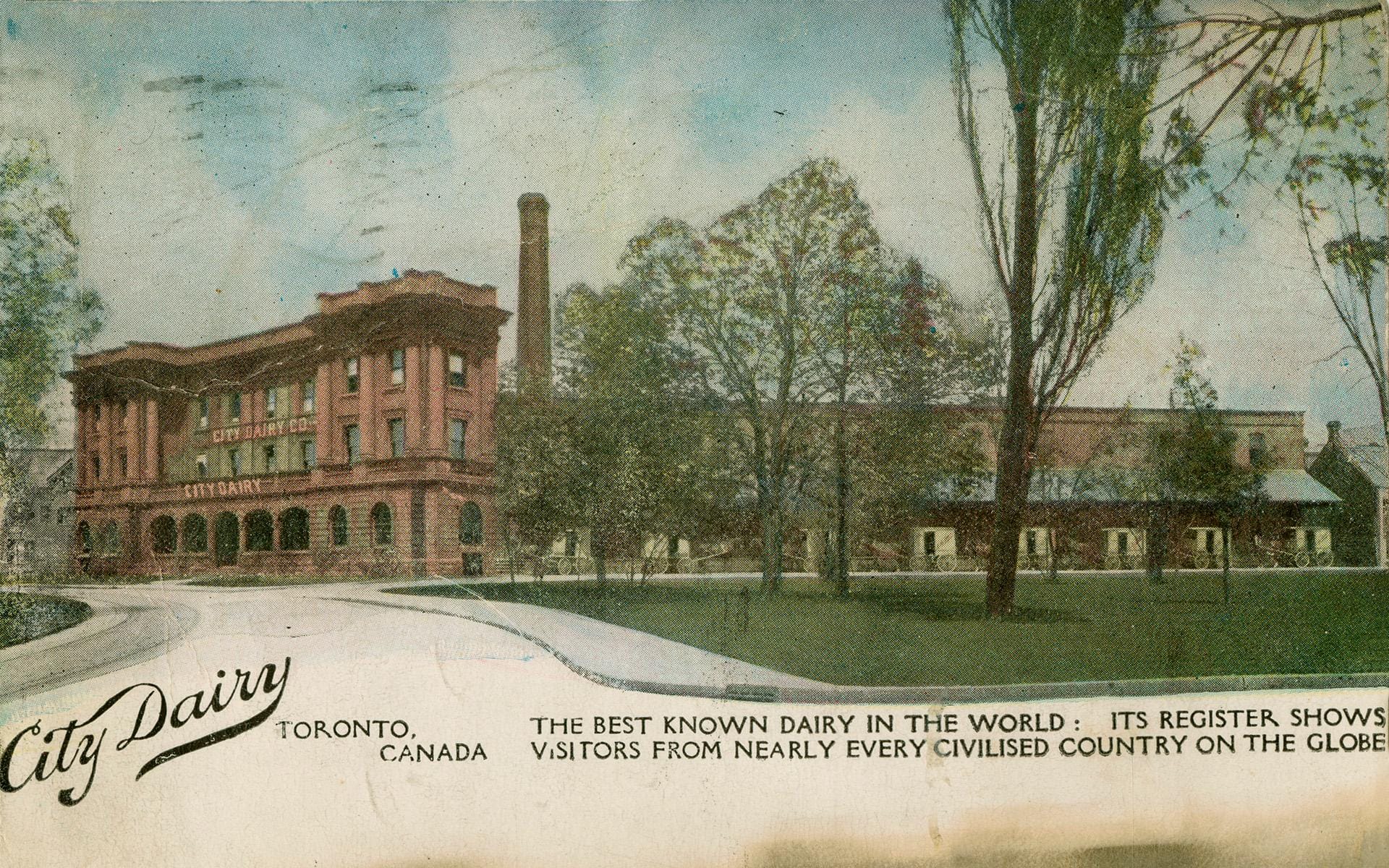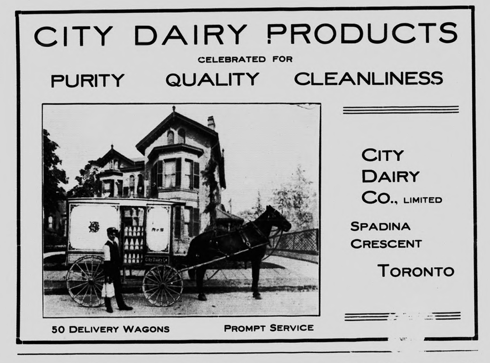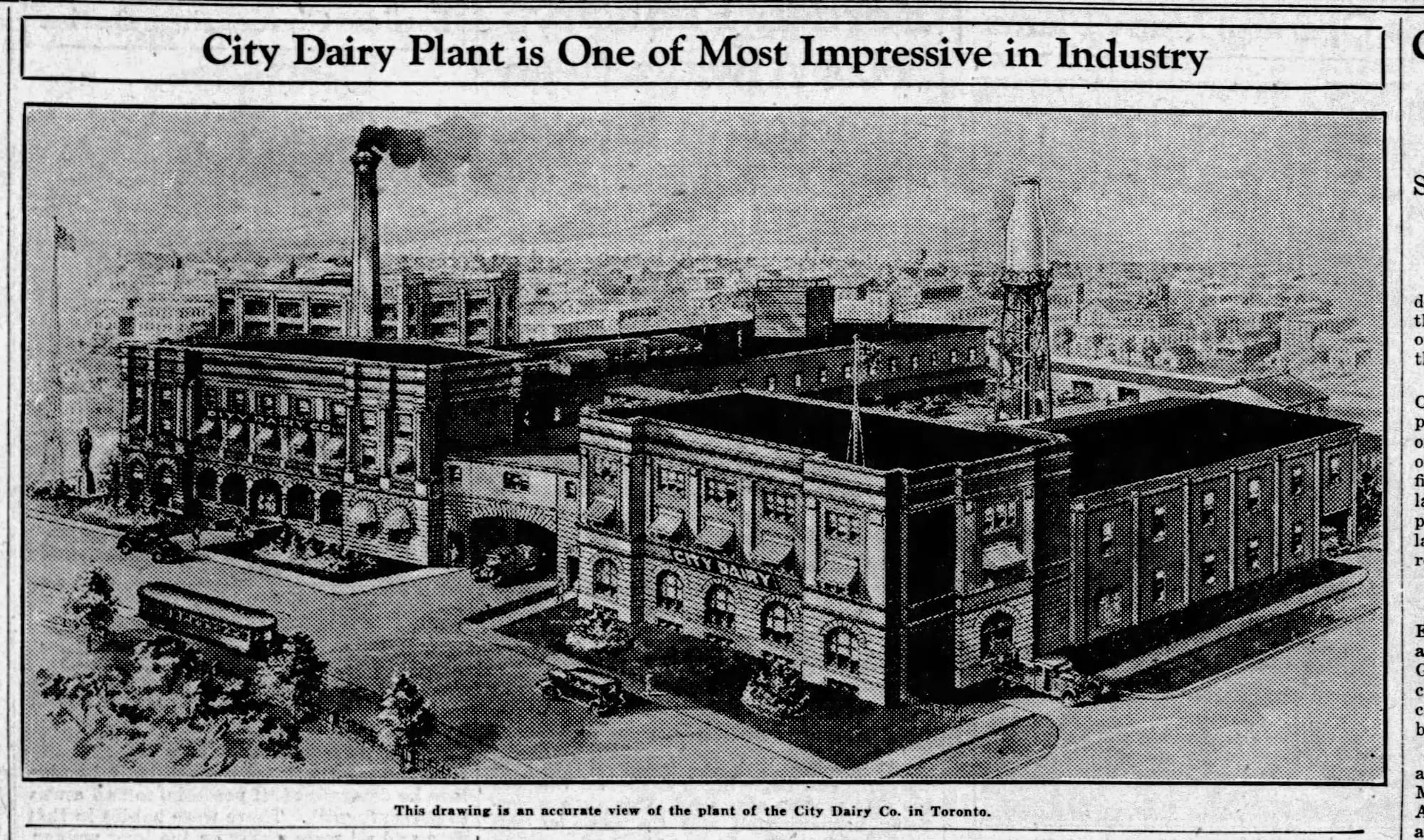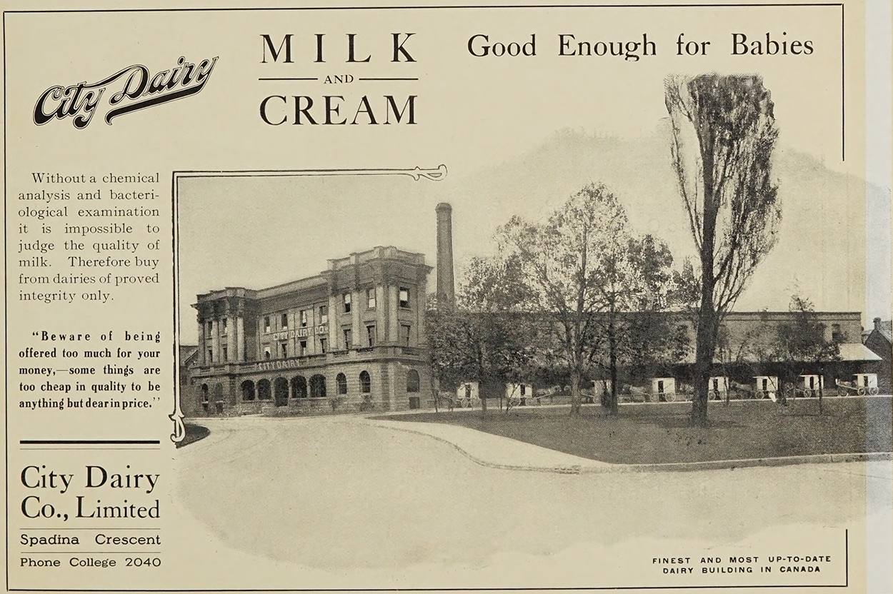 Coming in a kaleidoscope of colors and a major vector of tuberculosis, diphtheria, and typhoid, milk used to be disgusting (...not great that a particular sort of wacko—including the dipshit US Secretary of Health and Human Services—wants to kill kids and bring us back to those days!). Toronto’s City Dairy Company—founded in 1900 by Walter Massey, scion of a major industrialist family—pried open a market by changing that. Built to process milk supplied by cows from Massey’s model Dentonia Park farm, the City Dairy Co. positioned itself as the cleanest, most modern dairy plant in the British Commonwealth when it opened on Spadina Crescent in 1901, boasting about its “cow to table” milk. “Unquestionably clean” milk, “free of injurious germs” was a big deal at a time when other dairies were “colorwashing” their milk with dyes to mask spoilage and impurity and milk-borne disease was a whole category—and that was all before City Dairy installed pasteurization equipment here in 1903, the first pasteurized dairy in Toronto.