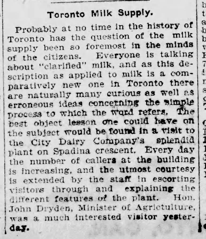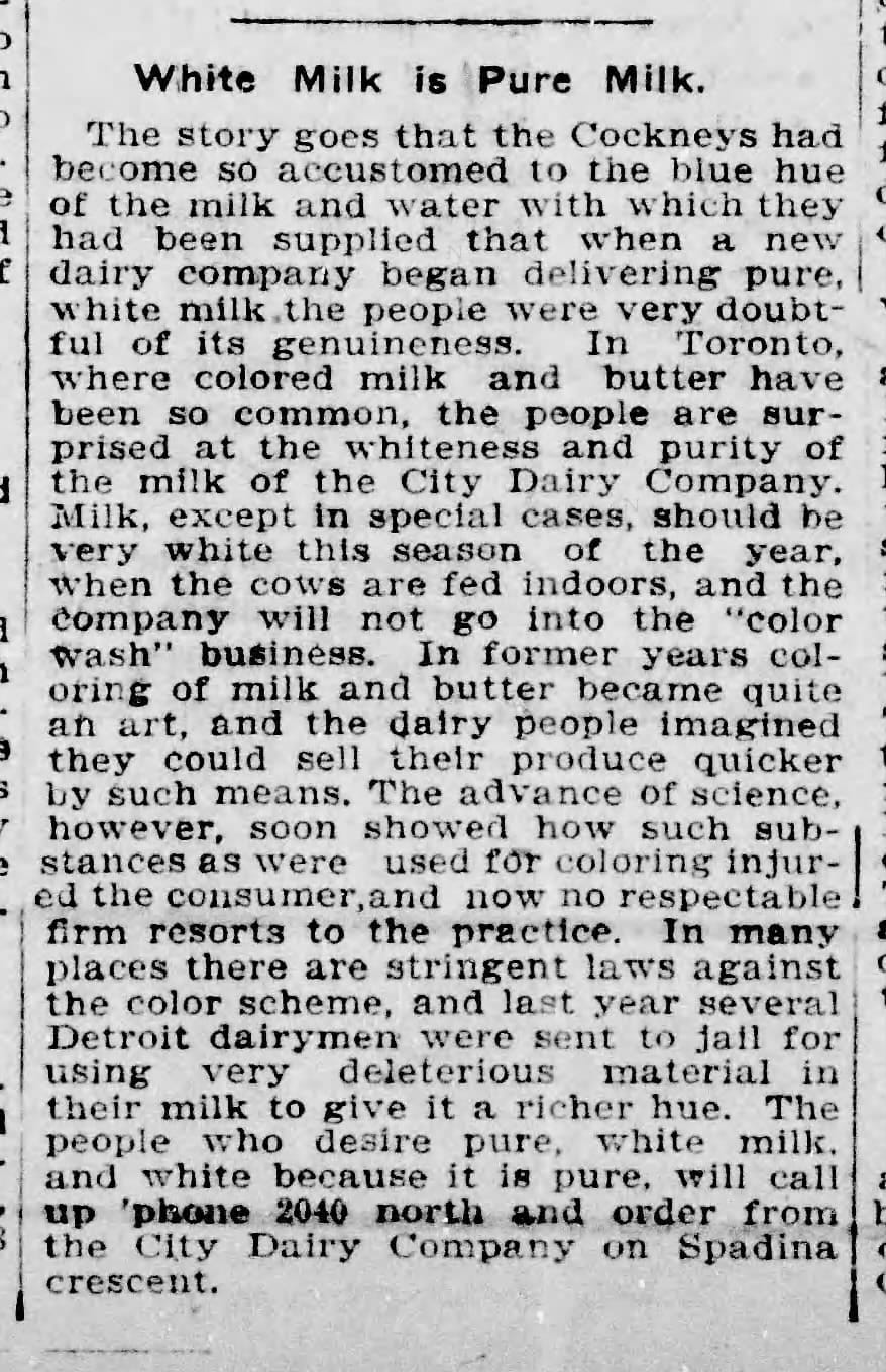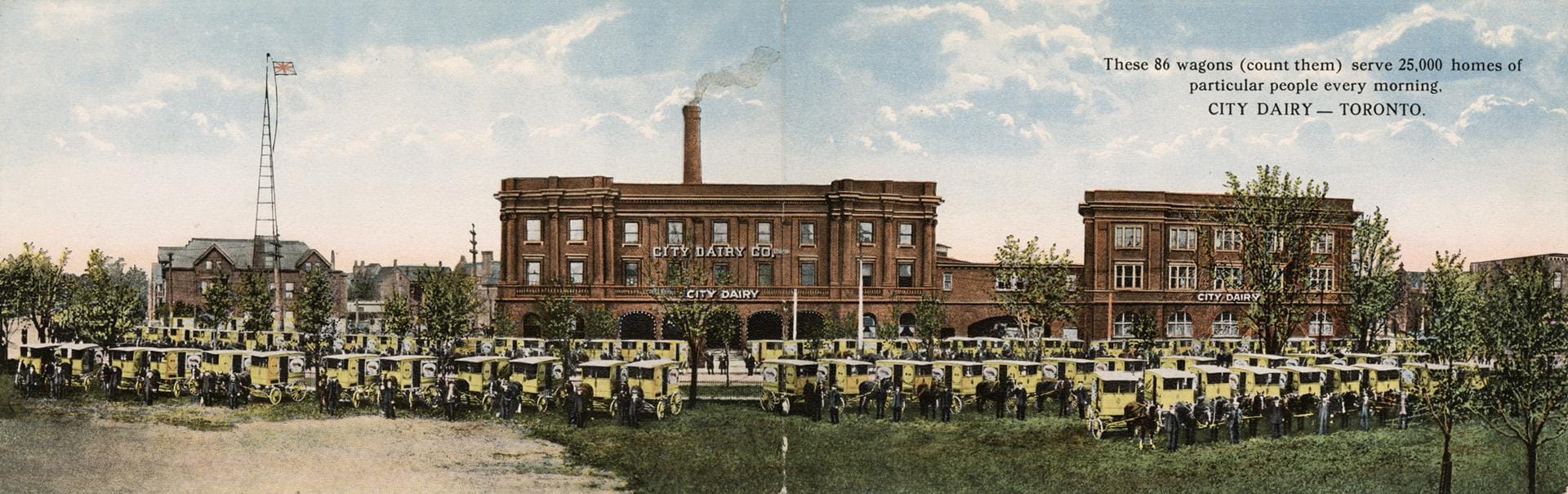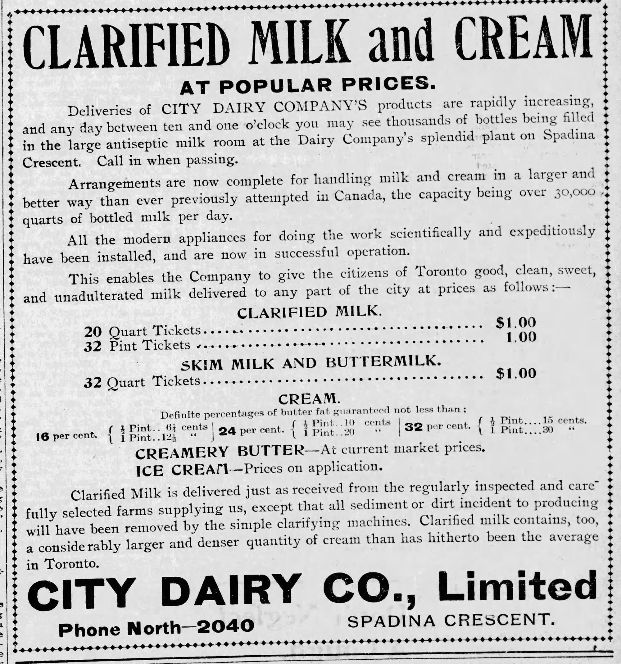 Coming in a kaleidoscope of colors and a major vector of tuberculosis, diphtheria, and typhoid, milk used to be disgusting (...not great that a particular sort of wacko—including the dipshit US Secretary of Health and Human Services—wants to kill kids and bring us back to those days!). Toronto’s City Dairy Company—founded in 1900 by Walter Massey, scion of a major industrialist family—pried open a market by changing that. Built to process milk supplied by cows from Massey’s model Dentonia Park farm, the City Dairy Co. positioned itself as the cleanest, most modern dairy plant in the British Commonwealth when it opened on Spadina Crescent in 1901, boasting about its “cow to table” milk. “Unquestionably clean” milk, “free of injurious germs” was a big deal at a time when other dairies were “colorwashing” their milk with dyes to mask spoilage and impurity and milk-borne disease was a whole category—and that was all before City Dairy installed pasteurization equipment here in 1903, the first pasteurized dairy in Toronto.