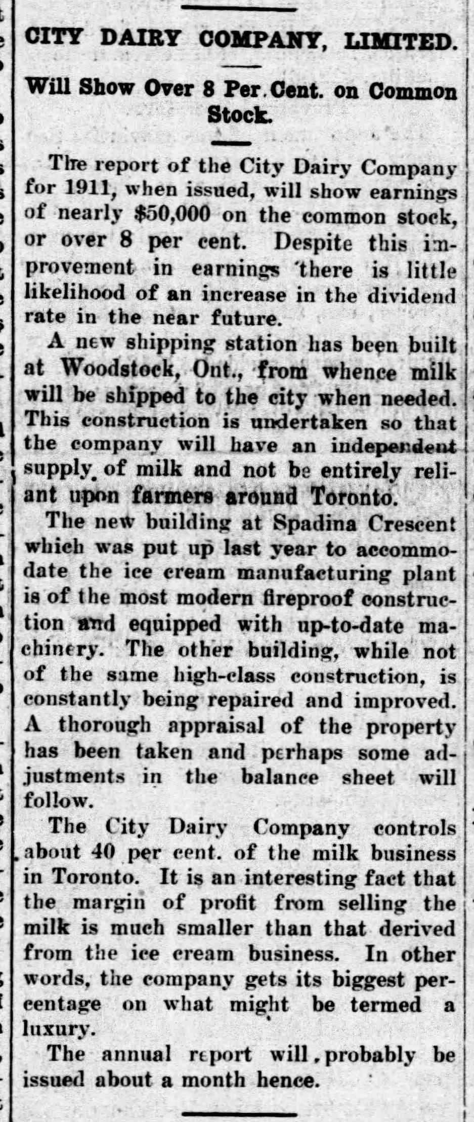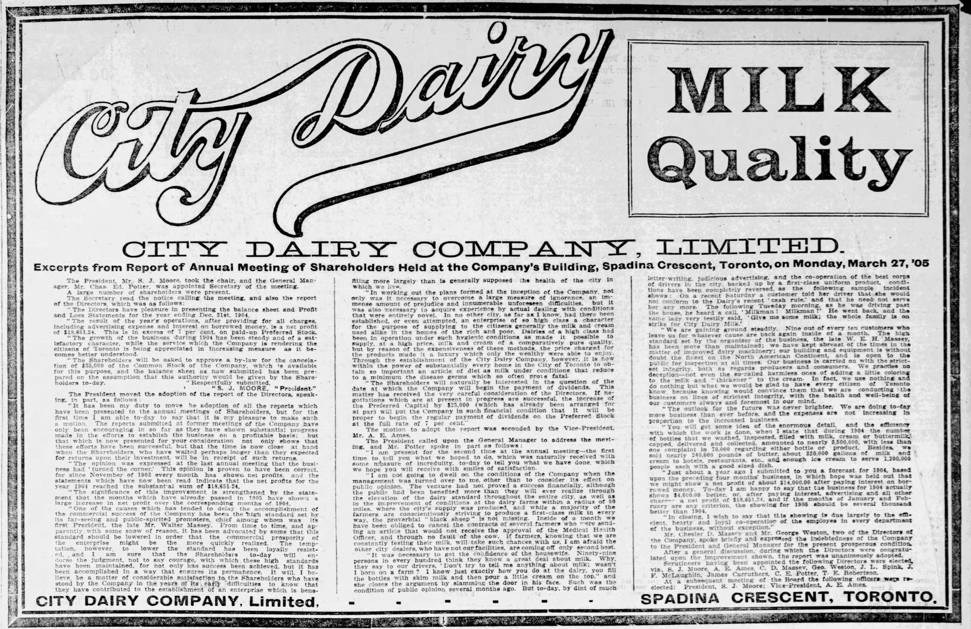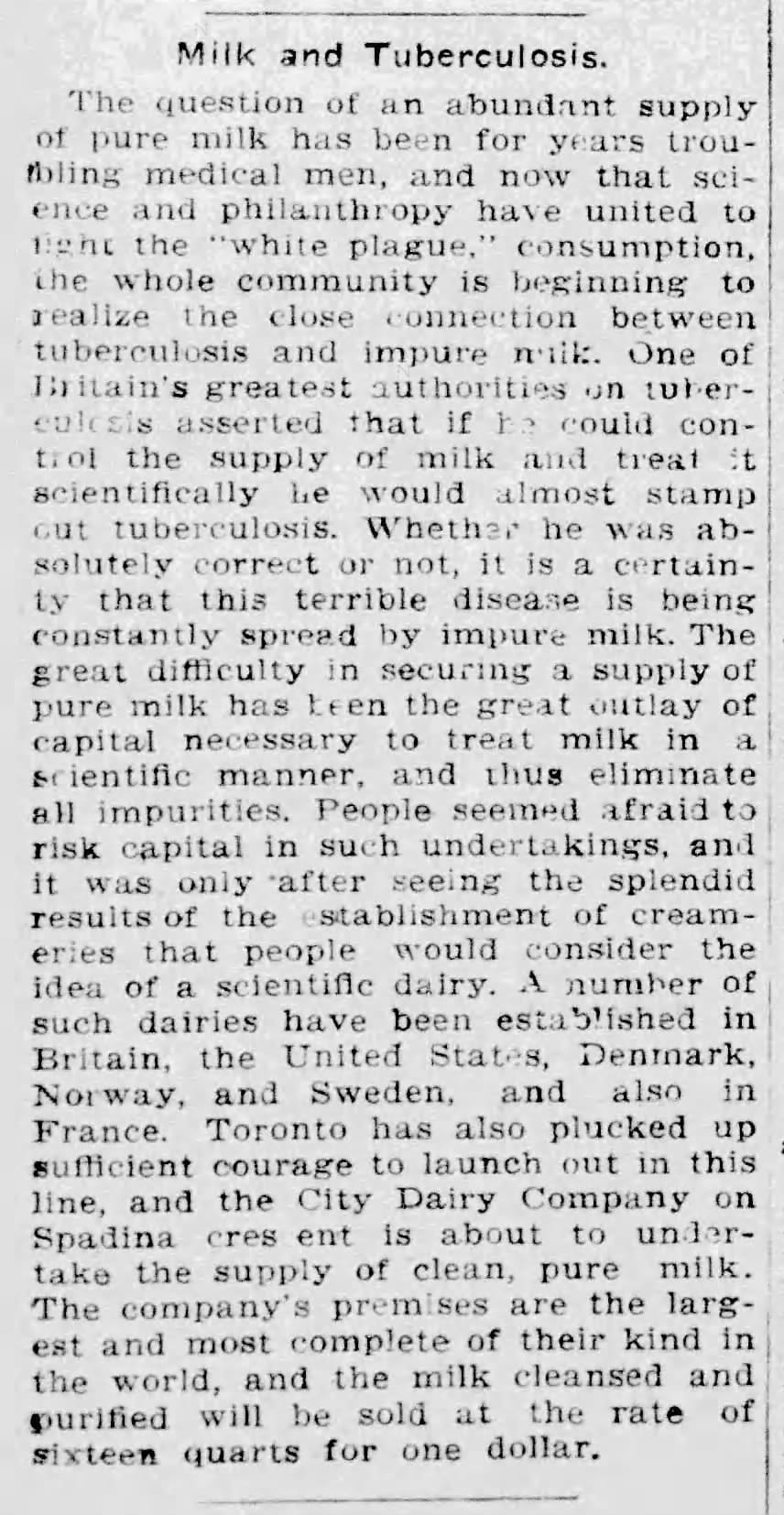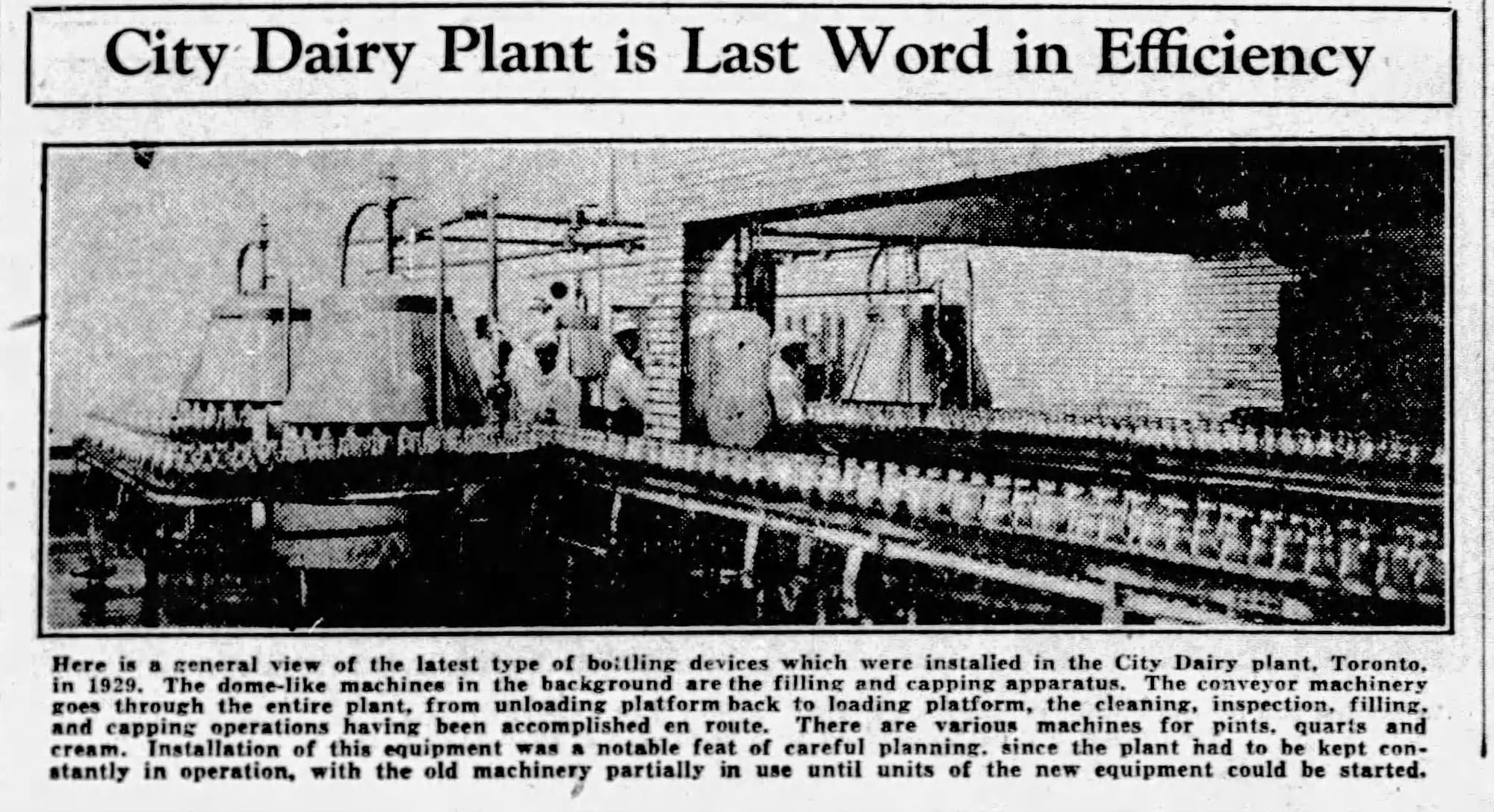 Coming in a kaleidoscope of colors and a major vector of tuberculosis, diphtheria, and typhoid, milk used to be disgusting (...not great that a particular sort of wacko—including the dipshit US Secretary of Health and Human Services—wants to kill kids and bring us back to those days!). Toronto’s City Dairy Company—founded in 1900 by Walter Massey, scion of a major industrialist family—pried open a market by changing that. Built to process milk supplied by cows from Massey’s model Dentonia Park farm, the City Dairy Co. positioned itself as the cleanest, most modern dairy plant in the British Commonwealth when it opened on Spadina Crescent in 1901, boasting about its “cow to table” milk. “Unquestionably clean” milk, “free of injurious germs” was a big deal at a time when other dairies were “colorwashing” their milk with dyes to mask spoilage and impurity and milk-borne disease was a whole category—and that was all before City Dairy installed pasteurization equipment here in 1903, the first pasteurized dairy in Toronto.