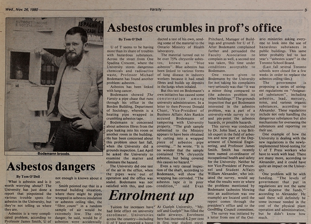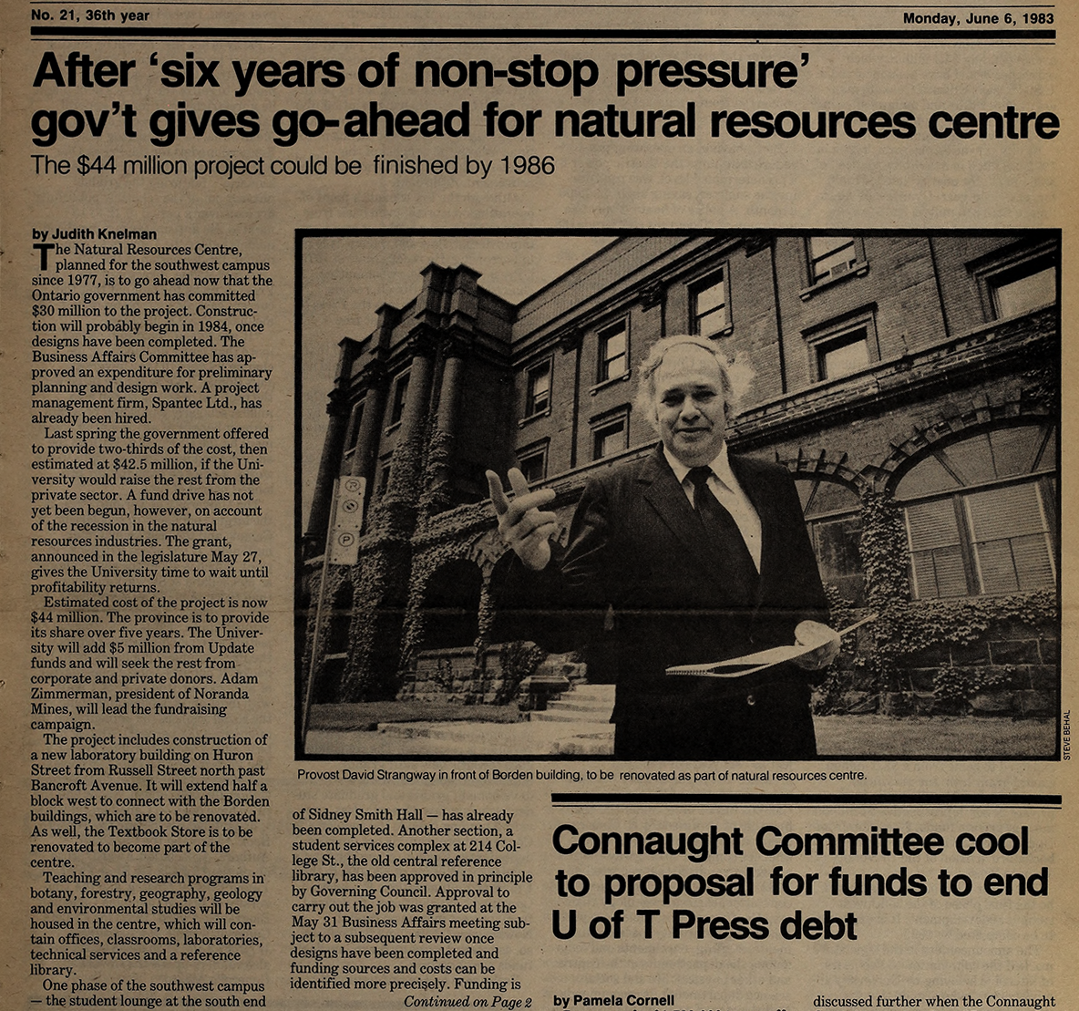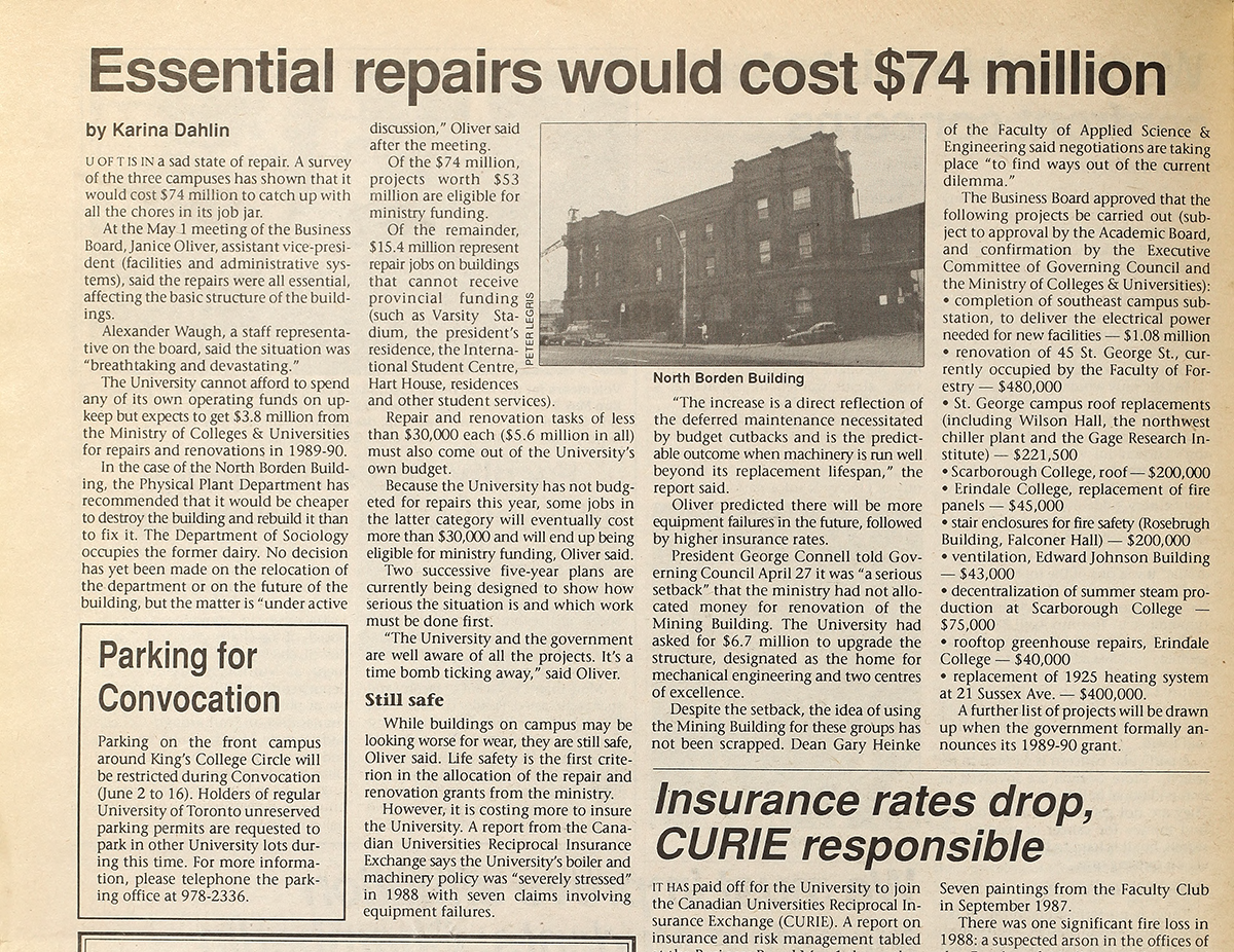 1967 in the Varsity, the Internet Archive | 1974, University of Toronto Graduate, the Internet Archive | 1980, asbestos crumbling, The Varsity, the Internet Archive | 1982, the Varsity, the Internet Archive | 1983, go-ahead for renovation, the Varsity, the Internet Archive | 1987, deteriorating conditions, the Varsity, the Internet Archive | 1987 cartoon, the Varsity, the Internet Archive | 1987, renovations nowhere in sight, the Varsity, the Internet Archive | 1989, essential repairs, the Varsity, the Internet Archive