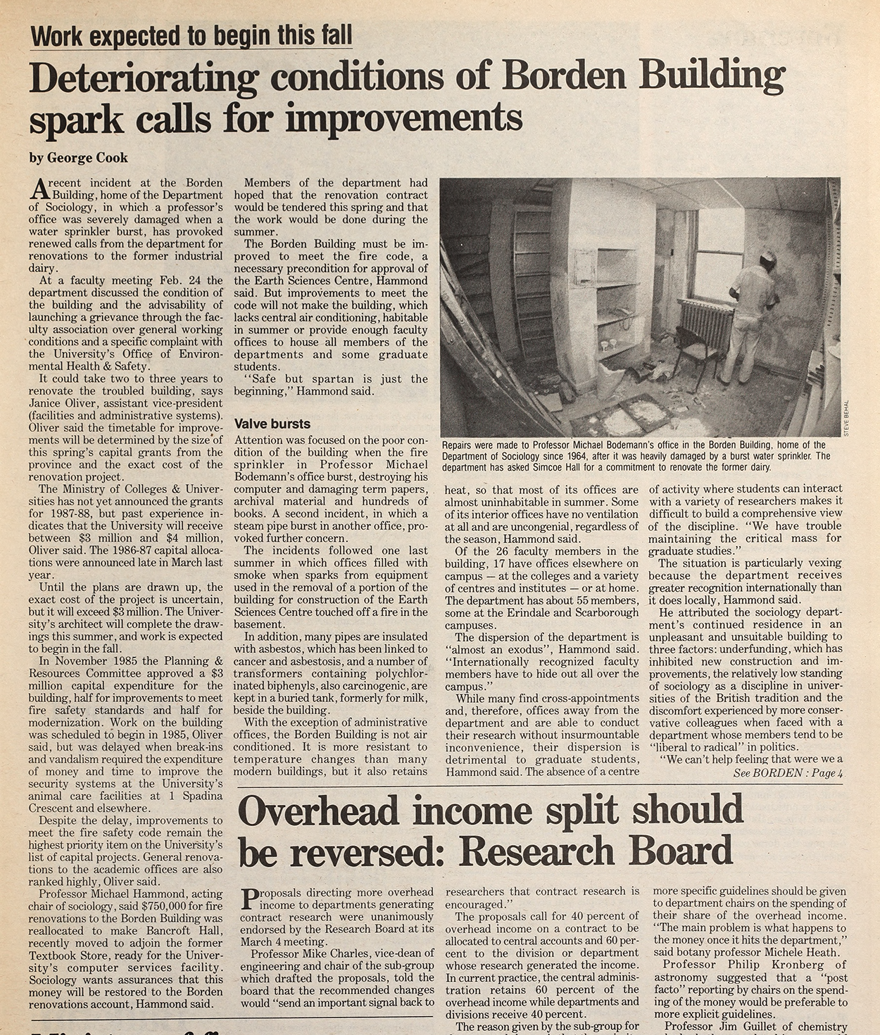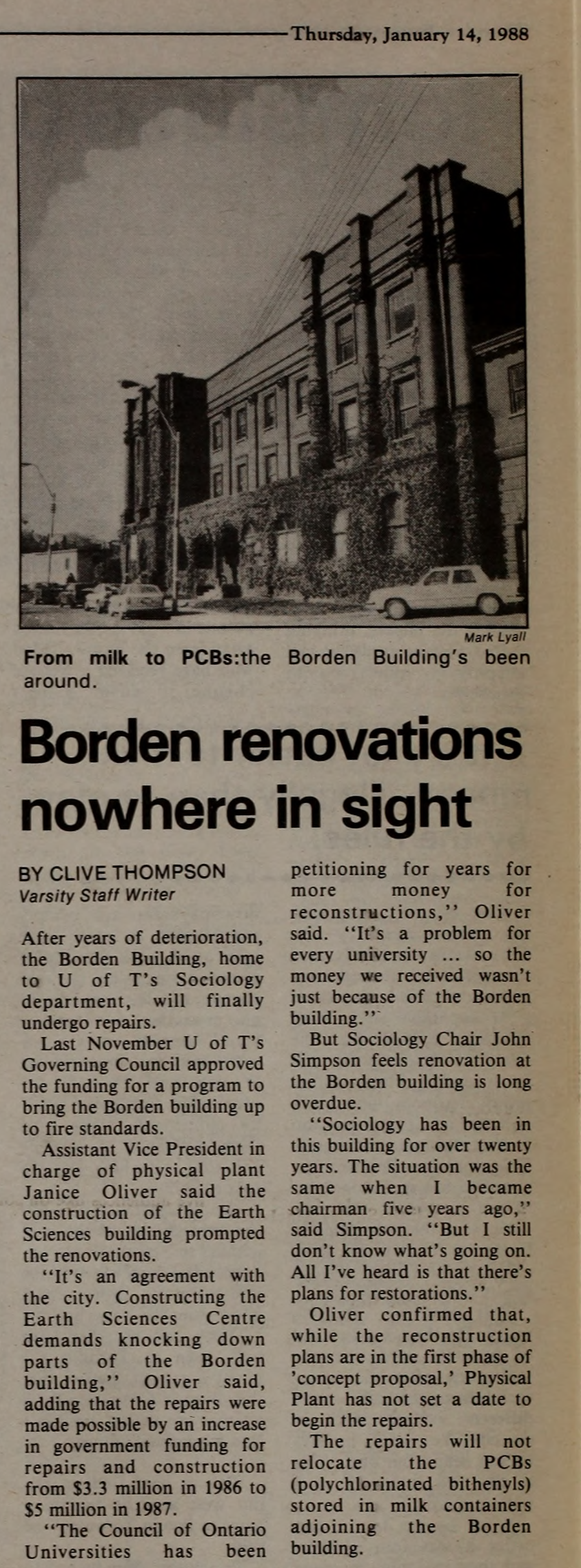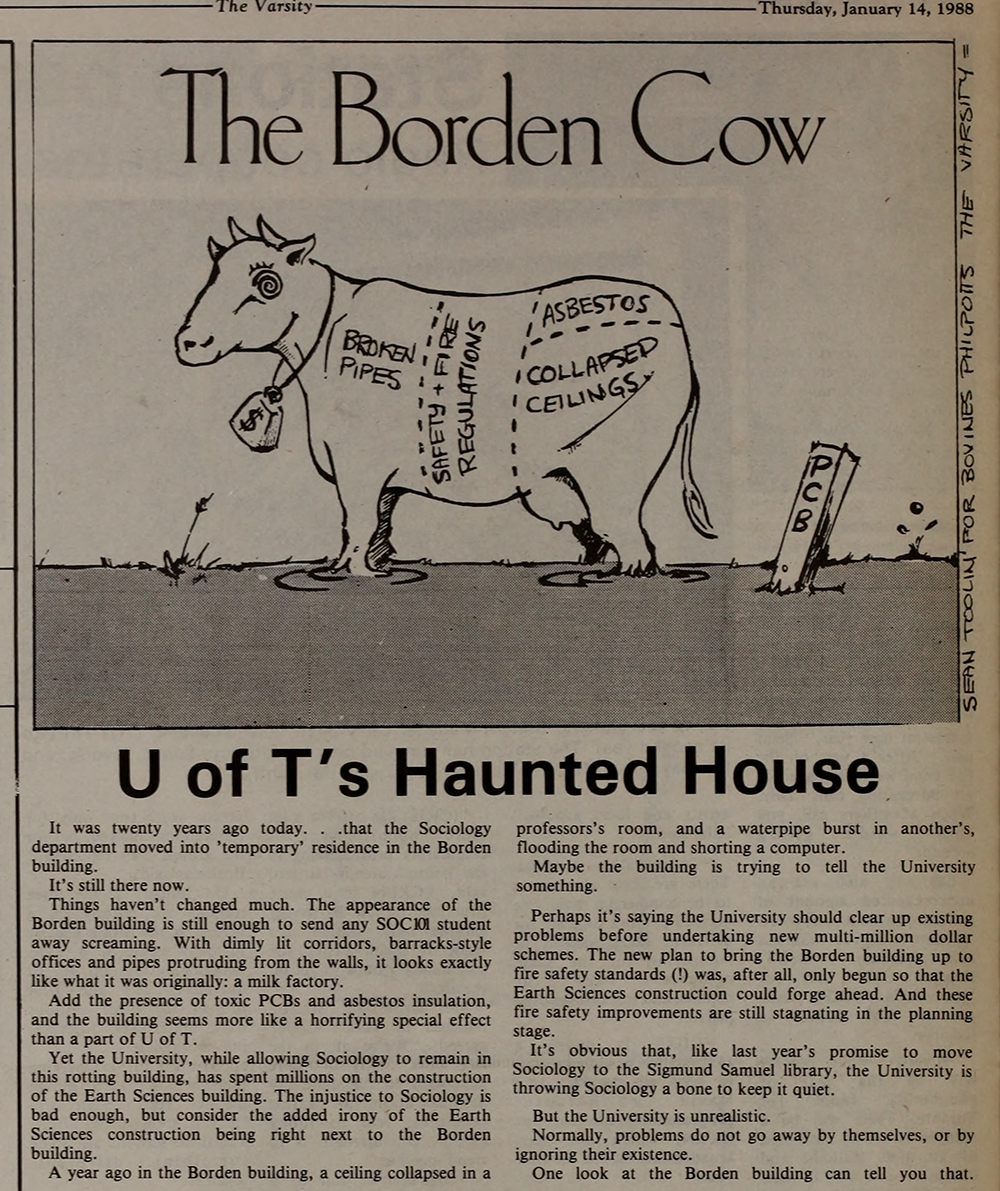 It seems like this was actually a pretty half-assed case of adaptive reuse—students and faculty did their best to avoid the crumbling Borden Buildings. Labeled “U of T’s Haunted House”, the poorly ventilated buildings were full of asbestos and PCBs, and professors sought out cross-appointments with other departments so they could have an office elsewhere. Deferred maintenance piled up, and by the late 1980s the buildings needed at least $74m in repairs. It doesn’t seem like the university ever really undertook the full-scale (and full price) restoration the buildings needed to function as useful modern academic space, instead fixing problems piecemeal when they became too serious to ignore.