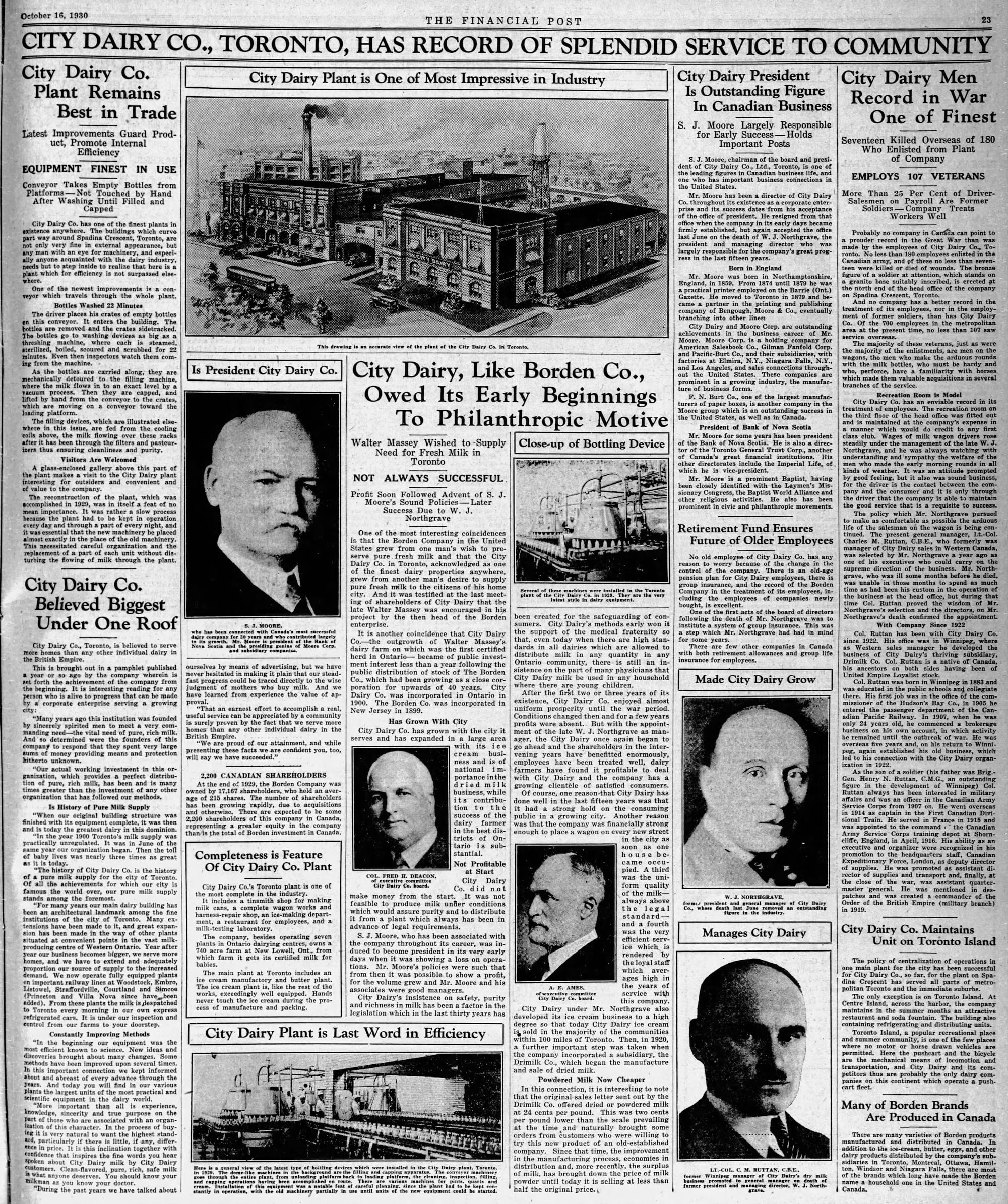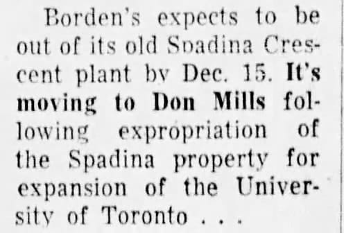 1930 articles about the City Dairy Co. complex and its acquisition by Borden | 1940 in front of the building, City of Toronto Archives | 1948 photo, City of Toronto Archives | 1962 articles about Borden's moving and University of Toronto moving in