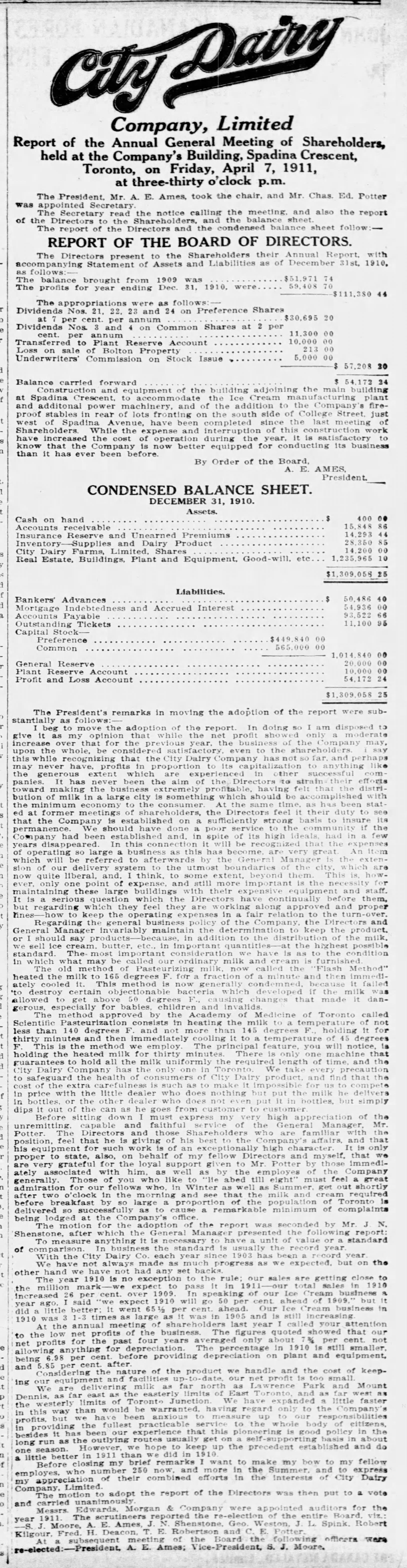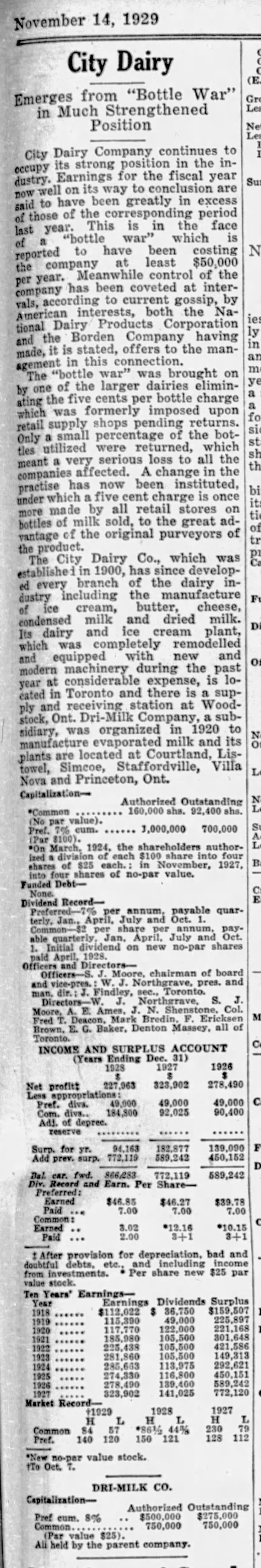 1905, 1911, and 1912 City Dairy Co. annual reports | 1929, City Dairy emerges from "bottle war" | 1930, shareholders consider Borden offer