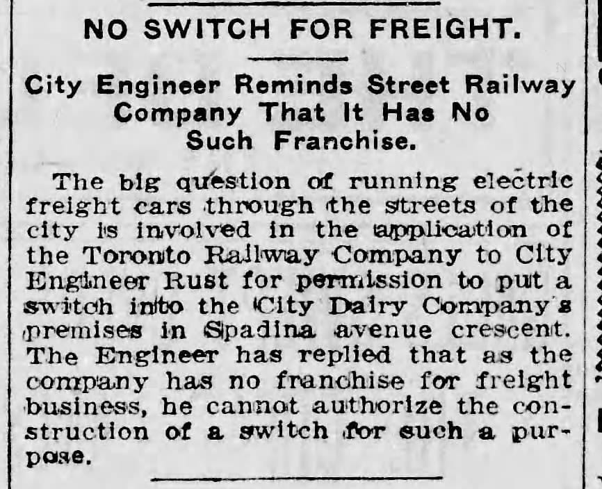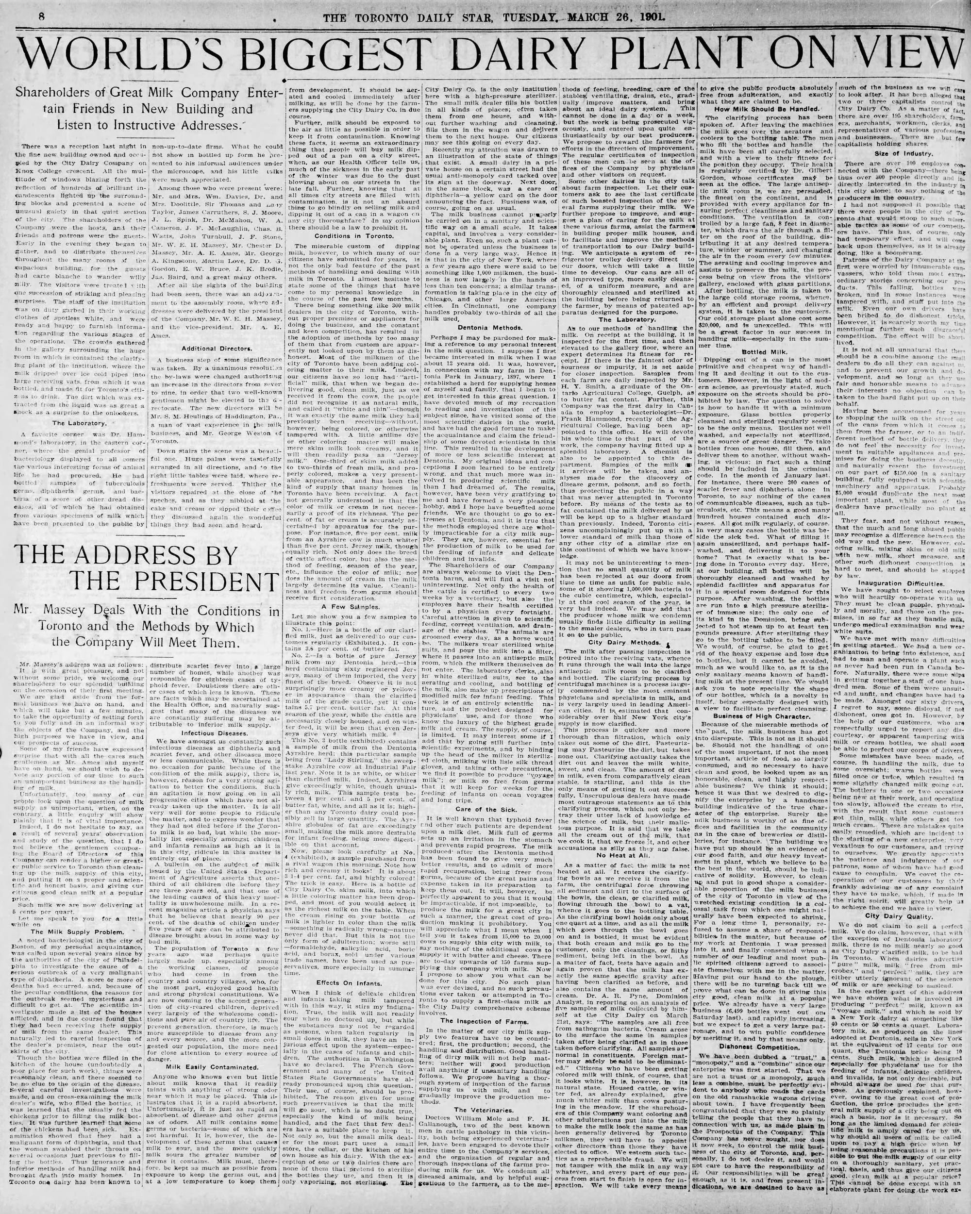 1901 construction update | 1901, full page article on the dairy plant opening | 1901 articles about proposals to haul freight to the dairy plant using the streetcar lines | 1903 photo | 1906, Digital Archive of Ontario | 1910, Digital Archive of Ontario | 1903 and 1913 fire insurance maps | 1920s, City of Toronto Archives