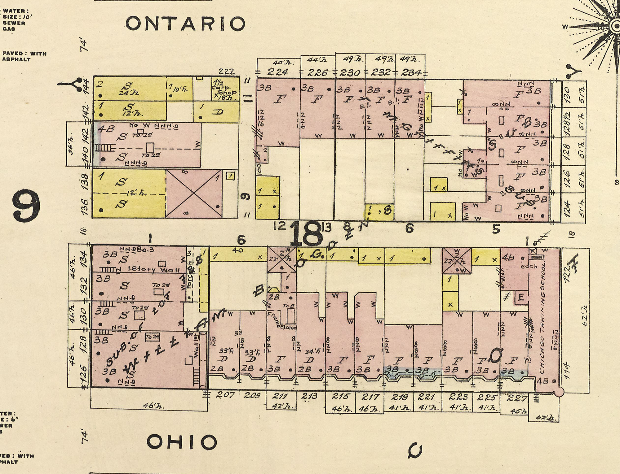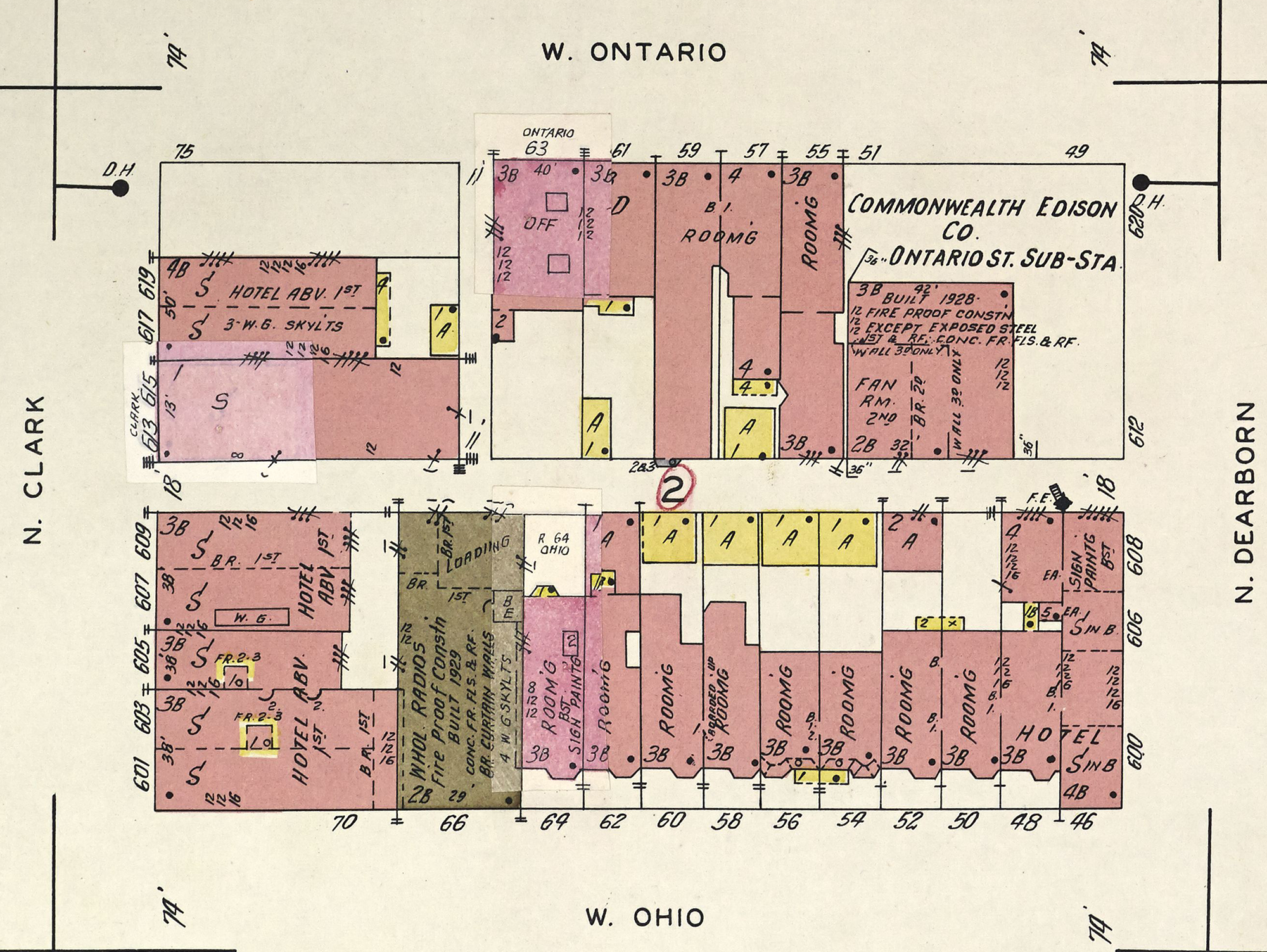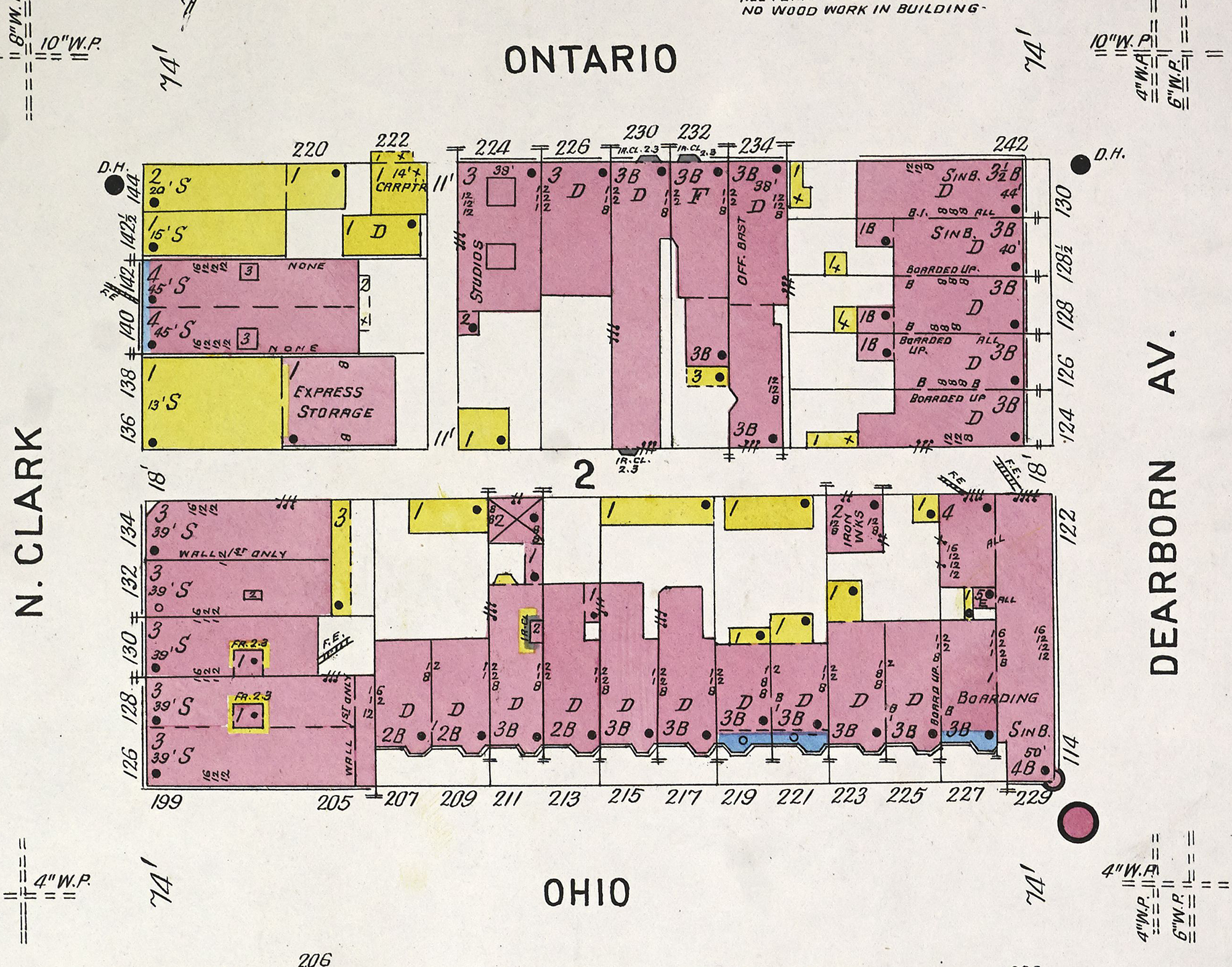 Among other tenants, it had a tavern, a clothing store, and a laundry on the first floor and apartments above. Reflecting how down the Near North Side was after the war, the tavern, with living quarters, was for sale for $5,000 from the late 1940s in the early 1950s (only $65k, adjusted for inflation).