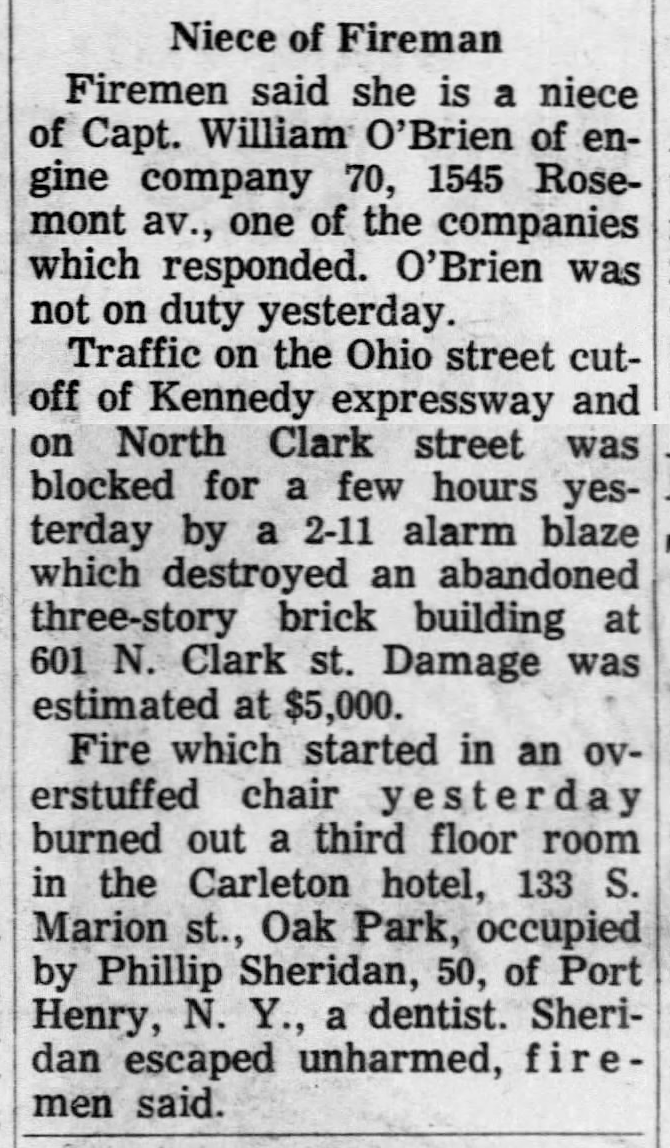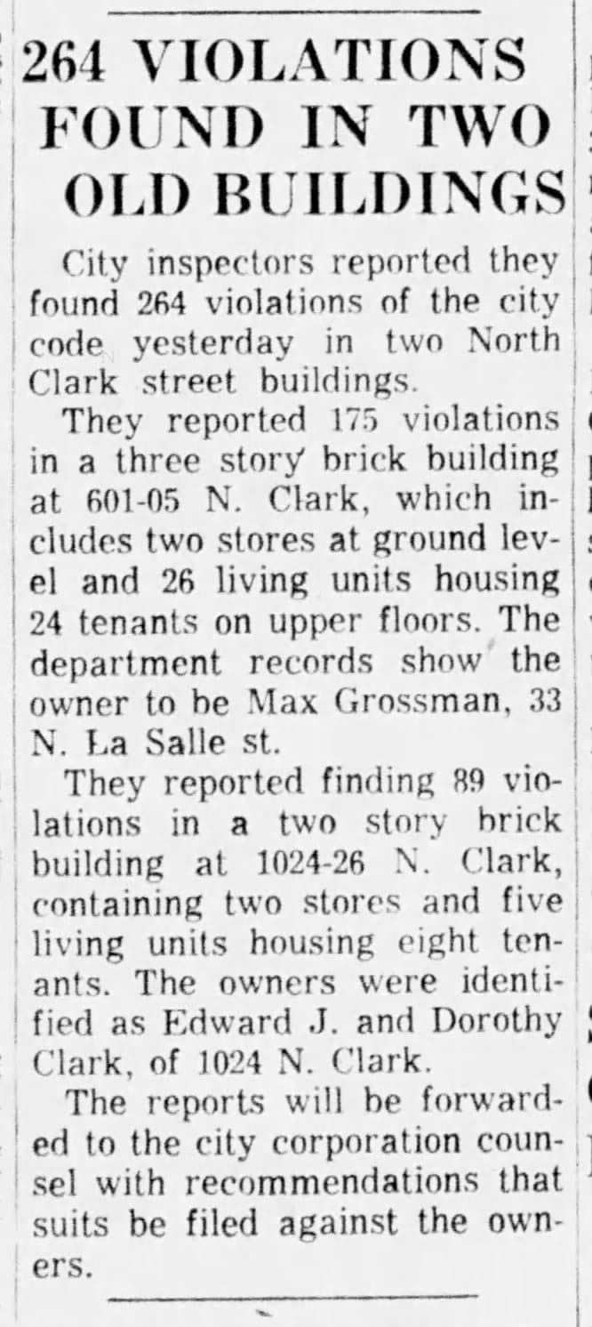 1961 article about building violations | 1964 photo of the Clark St. elevation of the building at the northeast corner of Clark and Ohio, UIC | 1964 article about the fire that gutted the building