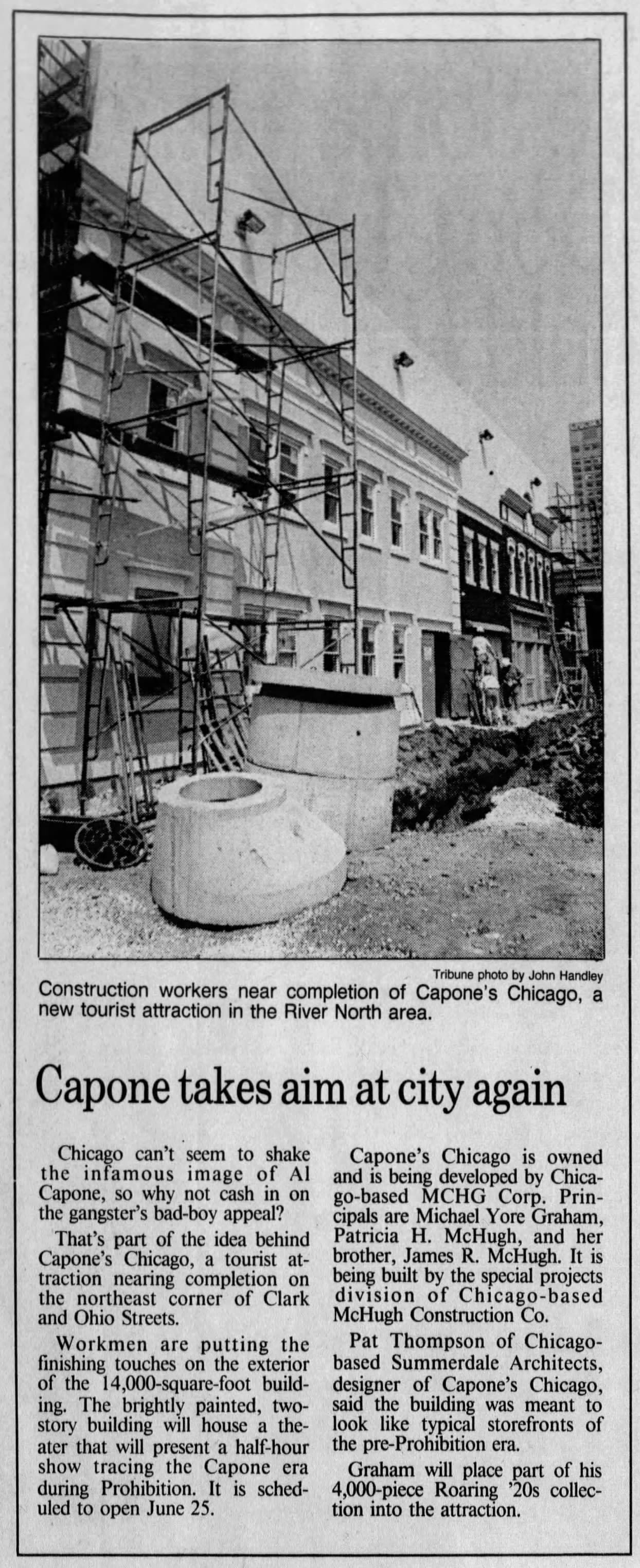 In 1964 a fire gutted the neglected building that stood at the northeast corner of Clark and Ohio. Like much of River North, this lot festered as a surface parking lot for decades, until Patricia and James McHugh (yes, those McHughs—like the construction company) teamed up with Capone collector Michael Graham in 1992 to lease the land and add another cheesy tourist attraction to this part of River North. Pumping nearly $4m into the project, they hired Summerdale Architects to design the building, basically a warehouse with a cartoonish foam facade.