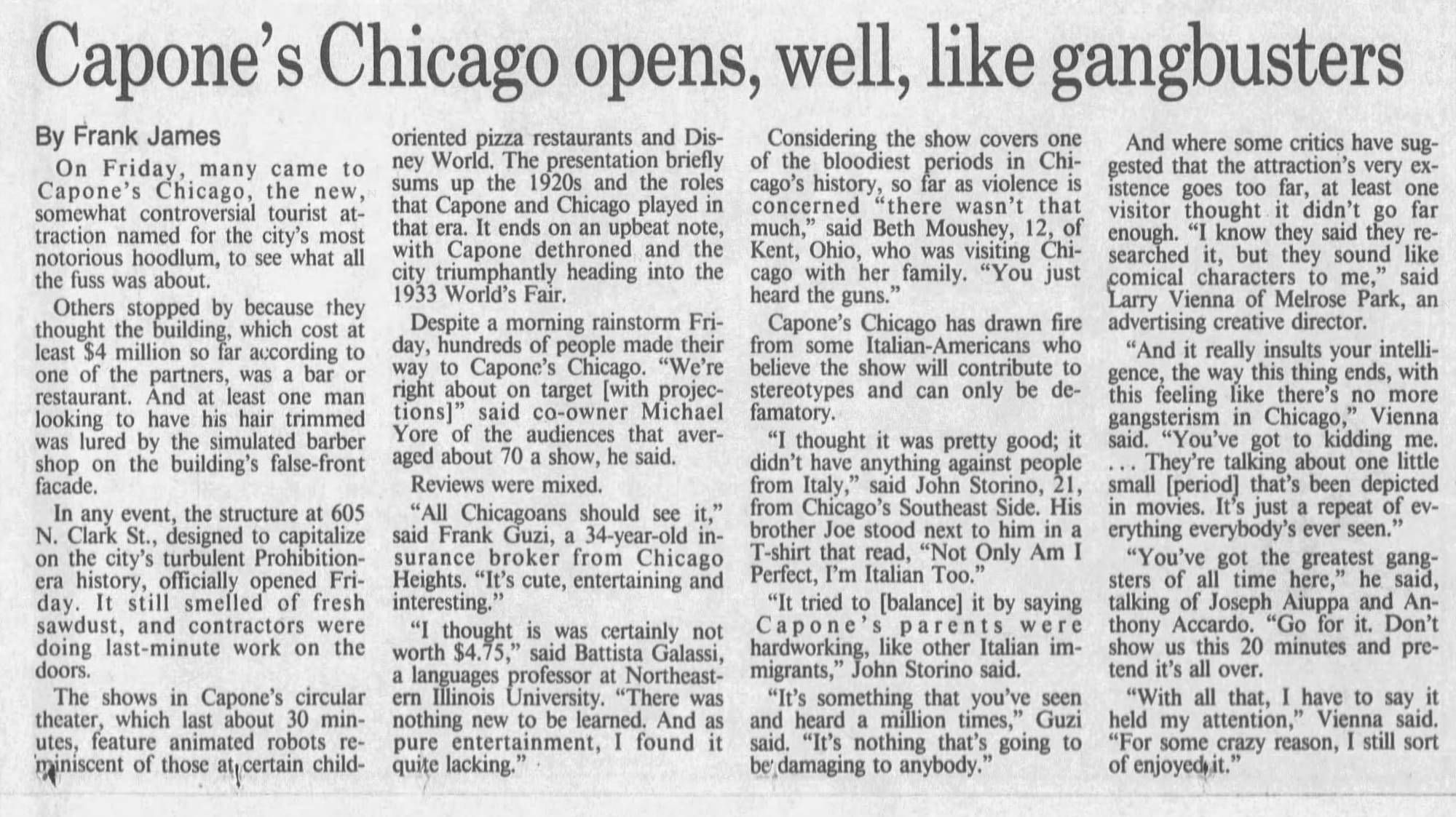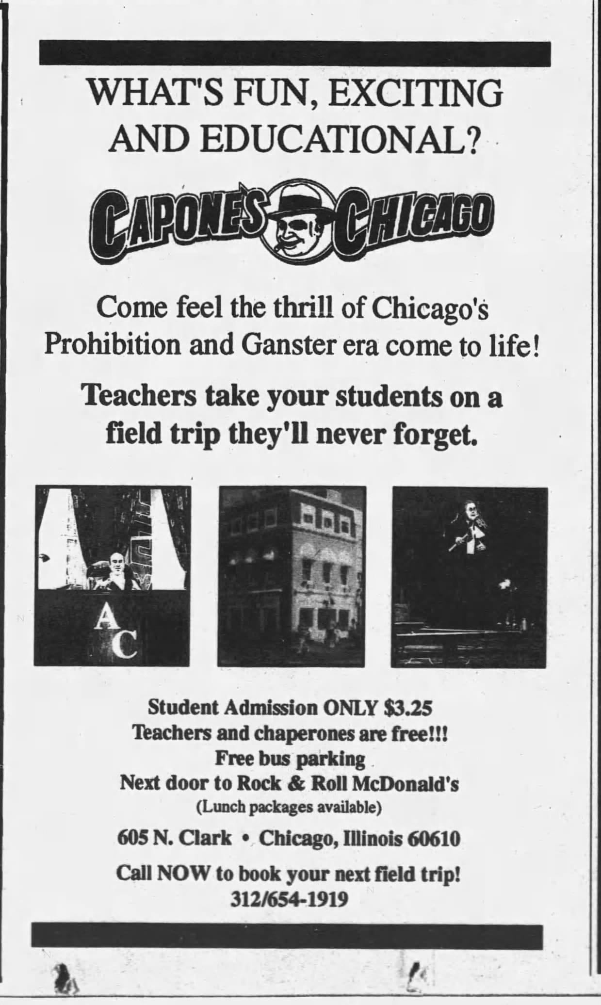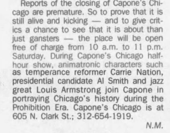 When it opened in 1993, Capone’s Chicago featured a theatre-in-the-round starring animatronic Al Capone, Carrie A. Nation, Louis Armstrong and others in a cheery 30-minute show about the history of Prohibition. The attraction also included a small museum with artifacts like the fireplace from Capone’s office in the Lexington Hotel and his hat. There was also, of course, a gift shop—the Four Deuces. Marketed towards tourists and, uh, school field trips (!?), an individual ticket cost $4.75 ($10.50 in 2025). Even writing it out it sounds like a weird concept: an awkwardly short show, can’t imagine there were many repeat customers, and—unlike its successor and so many of its neighbors—there wasn’t food service. Three years after opening, it closed, and I am SO curious where those animatronics went.