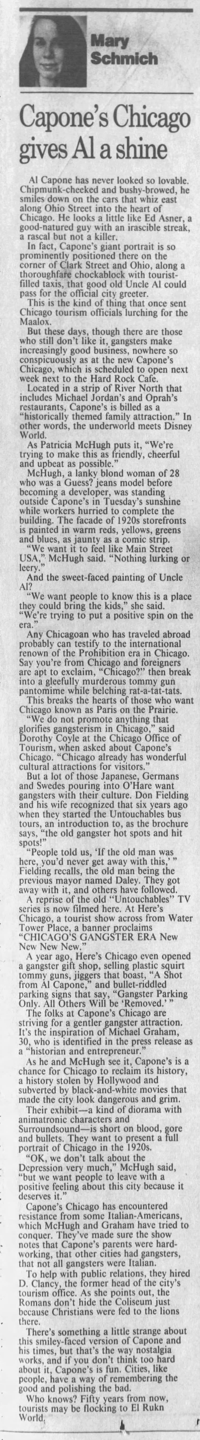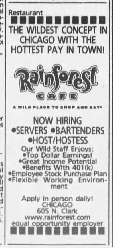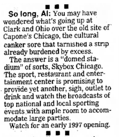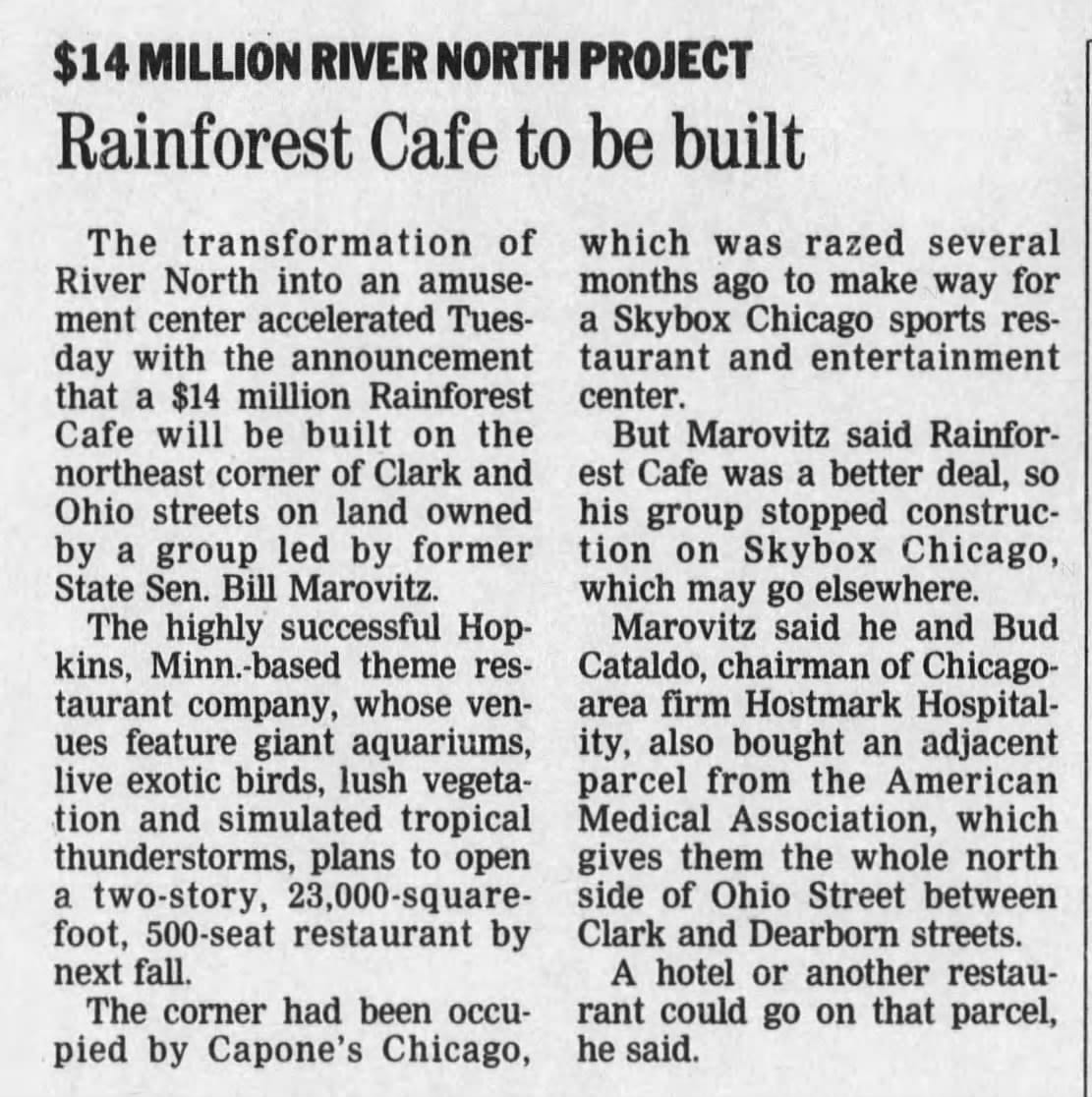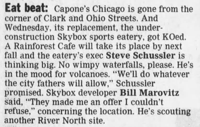 1993 field trip ad | 1996 articles about Capone's struggling and closing | 1996, C. William Brubaker photo, UIC via Chicago Collections | 1996-1997 articles about the Rainforest Cafe being built | 1998 Rainforest Cafe hiring ad
