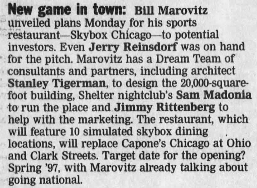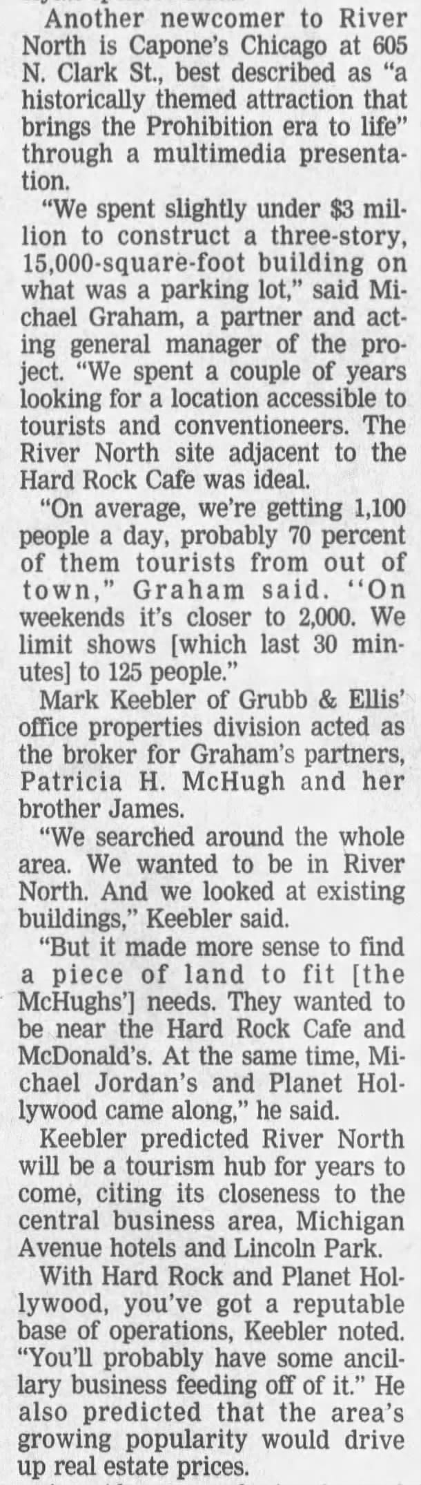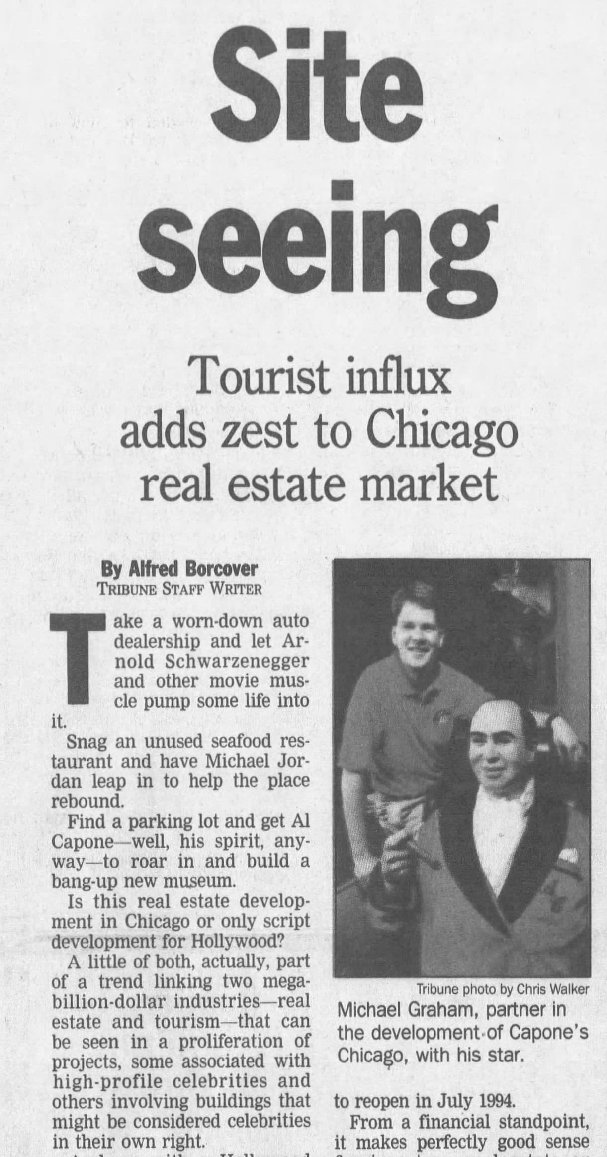 1993 field trip ad | 1996 articles about Capone's struggling and closing | 1996, C. William Brubaker photo, UIC via Chicago Collections | 1996-1997 articles about the Rainforest Cafe being built | 1998 Rainforest Cafe hiring ad