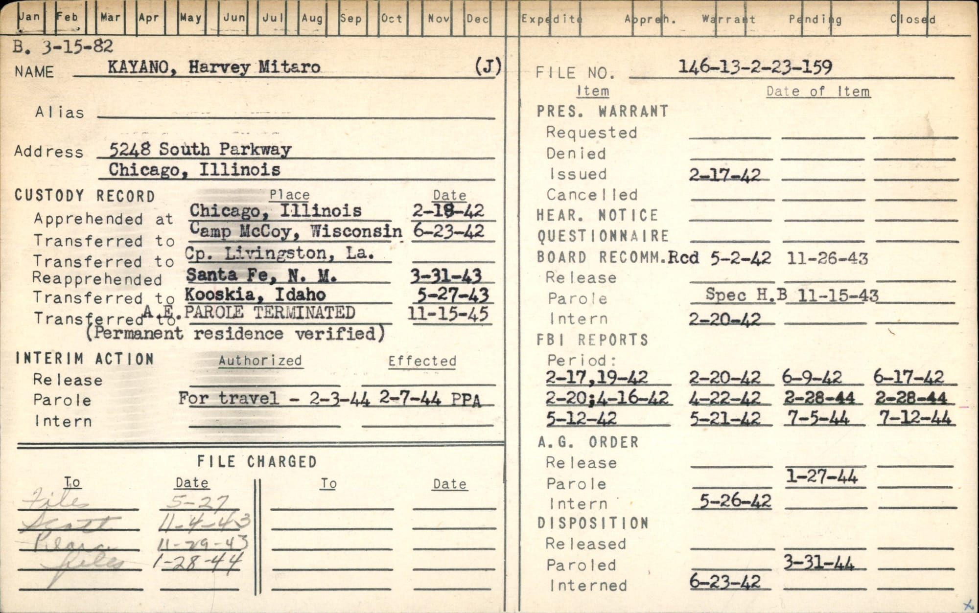 Japanese Internee Card for Harvey Mitaro Kayano, National Archives