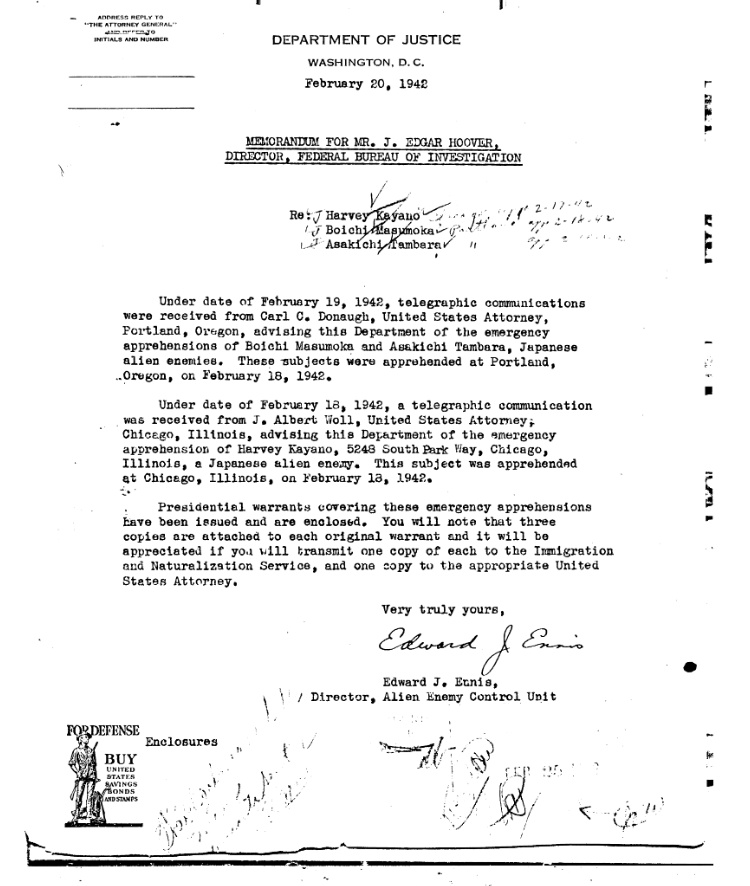 Kayano draft card | 1942 FBI memorandum on the arrest of Harvey Kayano