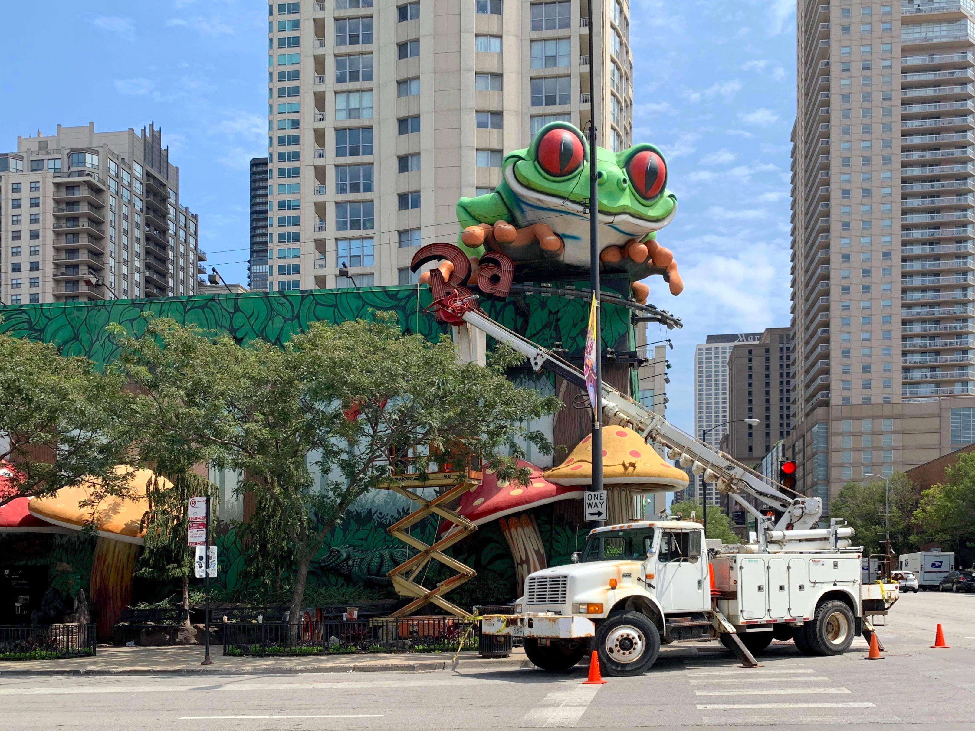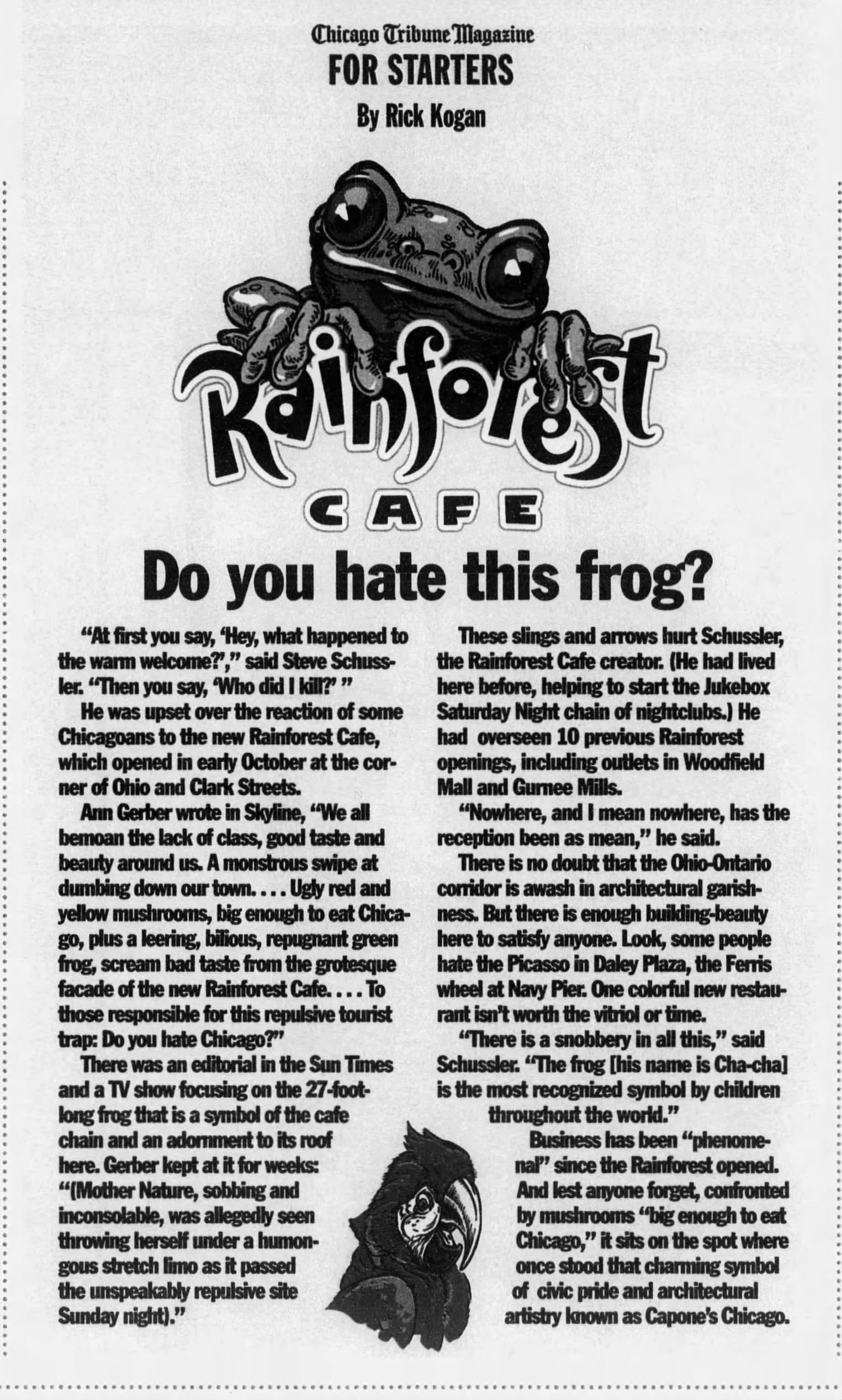 The new tenant swapped out the animatronic Al Capone for animatronic apes and the crack of bullets for claps of thunder. Probably designed by Cuningham Hamilton Quieter Architects (now the Cuningham Group) who specialized in Rainforest Cafes, the company spent more than $14m on the revamp, including $250k on the giant green frog looking down at the intersection of Clark and Ohio (its name was Cha! Cha!). The reception was, once again, decidedly negative. In a Chicago Tribune column titled, “Do you hate this frog?” Rainforest Cafe founder Steve Schussler said, “nowhere, and I mean nowhere, has the reception been as mean”.