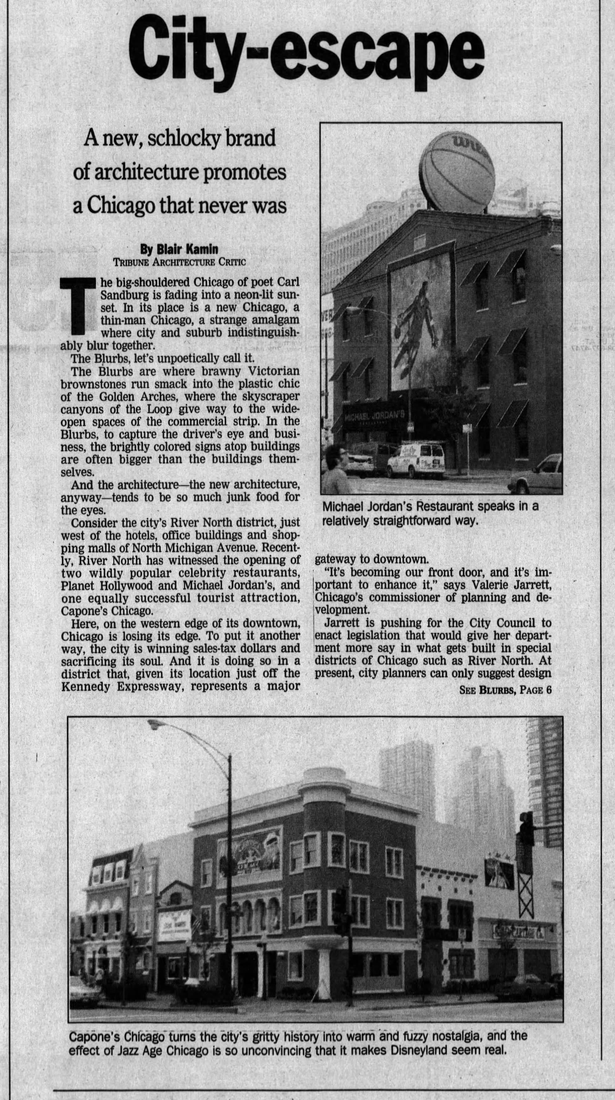 The City of Chicago and the Joint Civic Committee of Italian Americans weren’t happy with the project, thinking it made them look bad, and the city’s cultural critics hated it too. Even in a part of River North bursting with cornball establishments like Ed Debevic’s, Planet Hollywood, and the Hard Rock Cafe, Capone’s apparently stood out for its garishness. Discussing Capone’s in a hilarious 1994 Chicago Reader article—it finished 2nd in a poll of which building in the city Chicago architects would like to blow up—Summerdale architect Pat Thompson said, “these buildings are really sort of like potato chips, sort of a mass entertainment thing. There is not really a lot of serious content intended to any of that”.