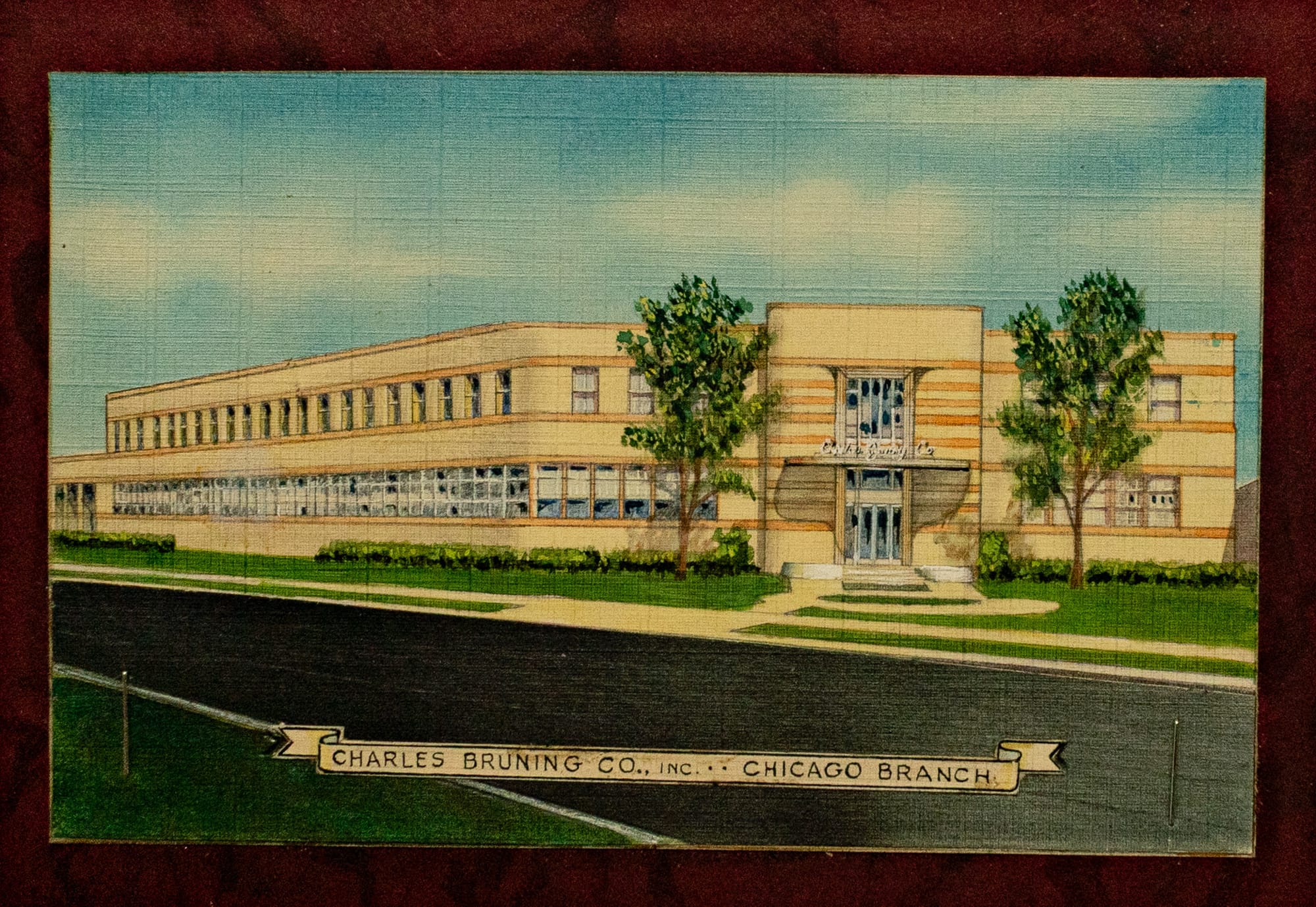 "Chicago Plant of Bruning Co. to be Doubled" and "Will Double Company's Capacity, October 1940, the Chicago Tribune | in Air Conditioning, Heating and Ventilating, 1942, the Internet Archive | in a cement ad, American Builder, 1942, the Internet Archive | Office view in a Gold Bond Acoustimetal ad, Architectural Record, 1942, USModernist |1950 Sanborn Map | 1956 articles on the new Charles Bruning Co. complex in Mt. Prospect