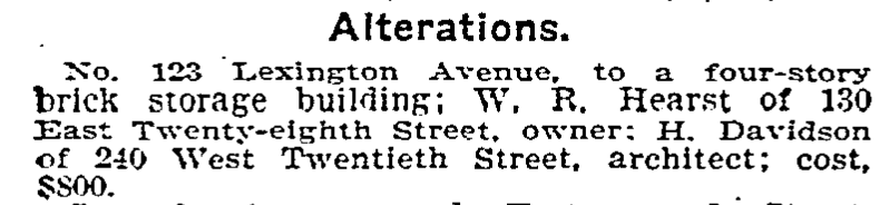 Some varying bits of evidence in contemporary sources of William Randolph Hearst's New York address from 1902-1909, including multiple political races where his address is listed at 135 E. 28th St (which is the same building as 119 Lexington Ave.), as well as a passenger manifest from 1905 where someone says there are going to work as a maid at Hearst's residence at 135 E. 28th.