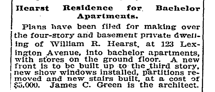 You would think an inauguration and a president's death would be enough narrative for one building, but it's New York. In 1902, newspaper baron William Randolph Hearst bought the former president's home. There's a split on whether or not he ever lived here: multiple biographies and contemporary newspaper articles suggest he did, but the New York Buildings Department and the Landmarks Preservation Commission describe suggestions that Hearst lived here as "disproven" (they do not dispute that he owned the building, however). Hearst also owned the building two doors south, 119 Lexington Ave., which is where some of the confusion stems from.