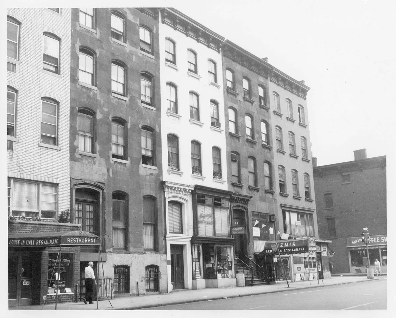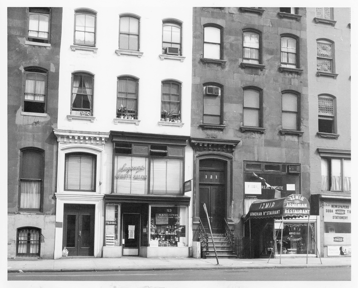 So, what's changed? Completed in 1855 as one of nine similarly-designed brownstones, surviving 170 years meant a whole lot of change. The most superficially striking change is that 123 Lexington is now faced with brick (I guess that's an upgrade–in the 1960s it was painted white). More meaningfully, under William Randolph Hearst's ownership, the first floor was turned into a garage and later a commercial space, now occupied by Kalustyan. Since the direct neighbors were basically identical, you can still see what it originally looked like (although they're somewhat altered as well). Surprisingly–since they're often the first thing to go–the cornice remains the same.