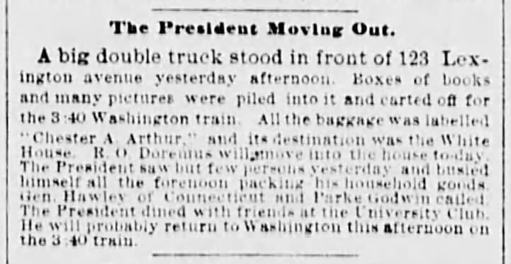 Sketch of Arthur's inauguration at 123 Lexington Ave, Wikimedia Commons | 1881 New York Times article about the administration of the oath | 1882 article about Arthur moving to the White House and out of 123 Lexington Ave.