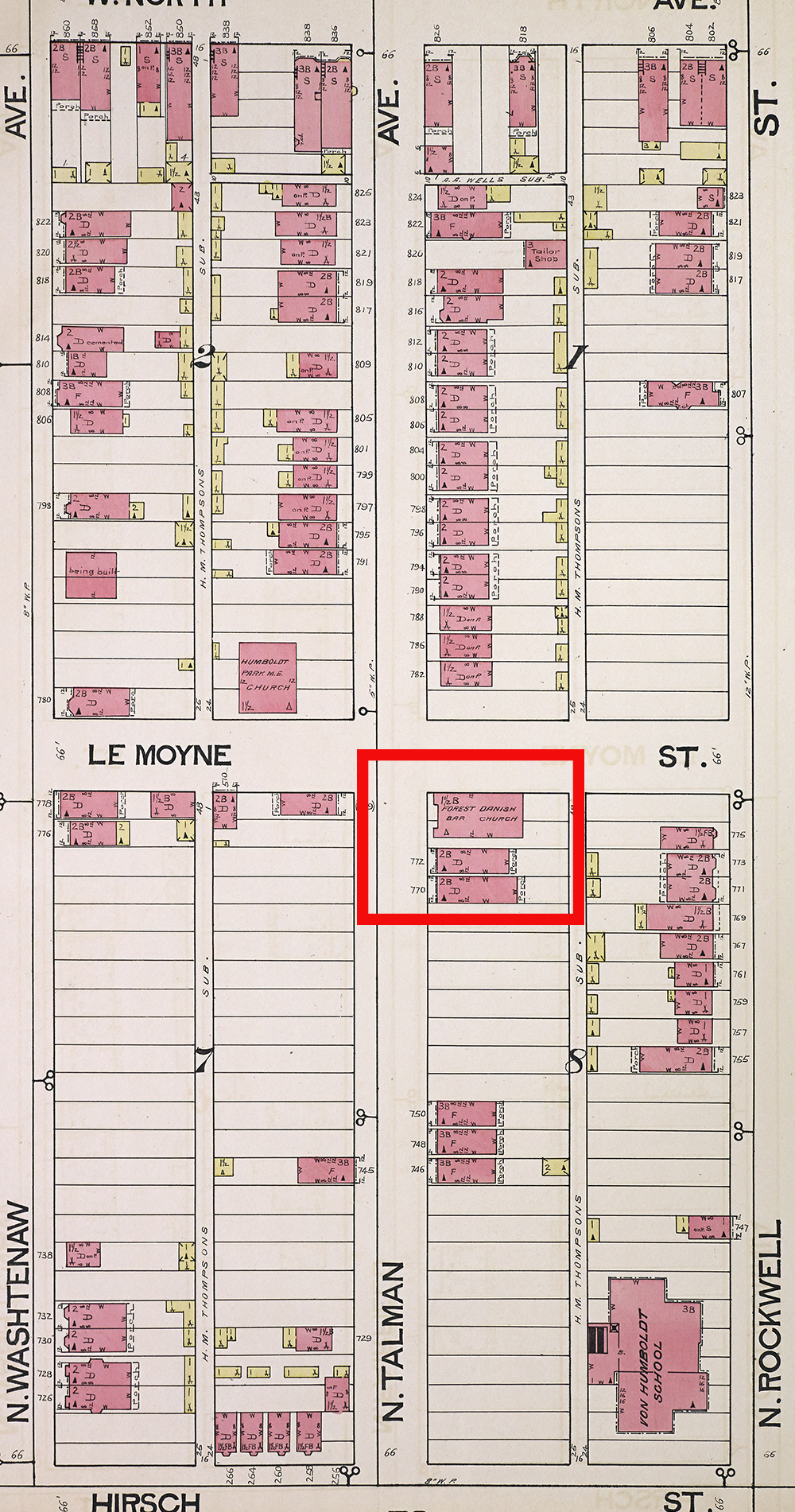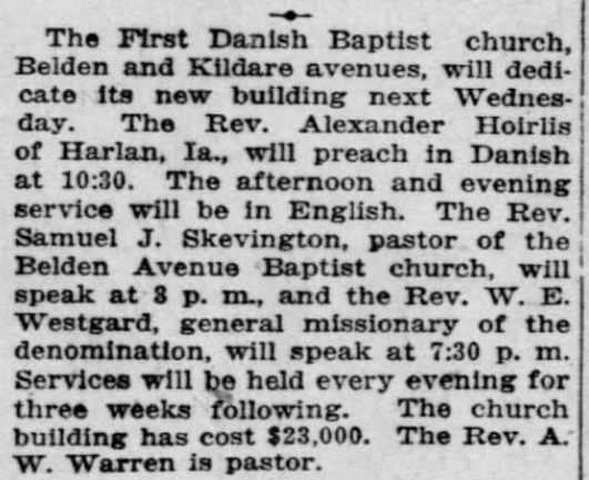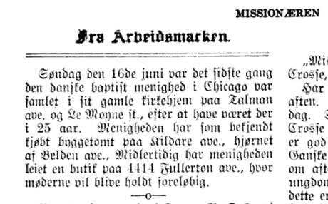 While there weren’t many Danish Baptists in Denmark, they thrived in the Midwest–in Chicago, they even started their own seminary in Morgan Park. The first Danish Baptists in Chicago organized in 1864 in present-day West Loop, and for the next few decades—punctuated by a handful of unions, closures, and new organizations—they followed Chicago’s Scandinavian population northwest to Humboldt Park. Humboldt Park was predominantly Danish and Norwegian when, under Rev. Carl Jensen, the First Danish Baptist Church of Chicago was constructed here in 1892. A handsome, sturdy brick church, architecturally it doesn’t look particularly Danish (there are at least two or three extant church buildings in Chicago that look straight out of Jutland). As the Scandinavian community continued to migrate northwest, in 1918 the congregation sold this building, constructing a new church in Hermosa at Belden & Kildare.