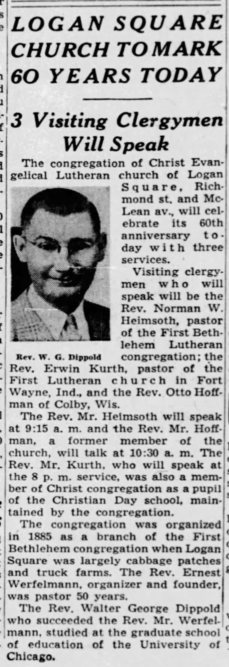 1945, 60th anniversary | 1950 fire insurance map | 1952, new pastor | 1958, free building permit for renovation, the Internet Archive | 1962, new minister | 1968, interior, Logan Square Preservation | 1970s, Illinois State Historic Preservation Office | 1975, 90th anniversary | 2008, Cook County Assessor photo