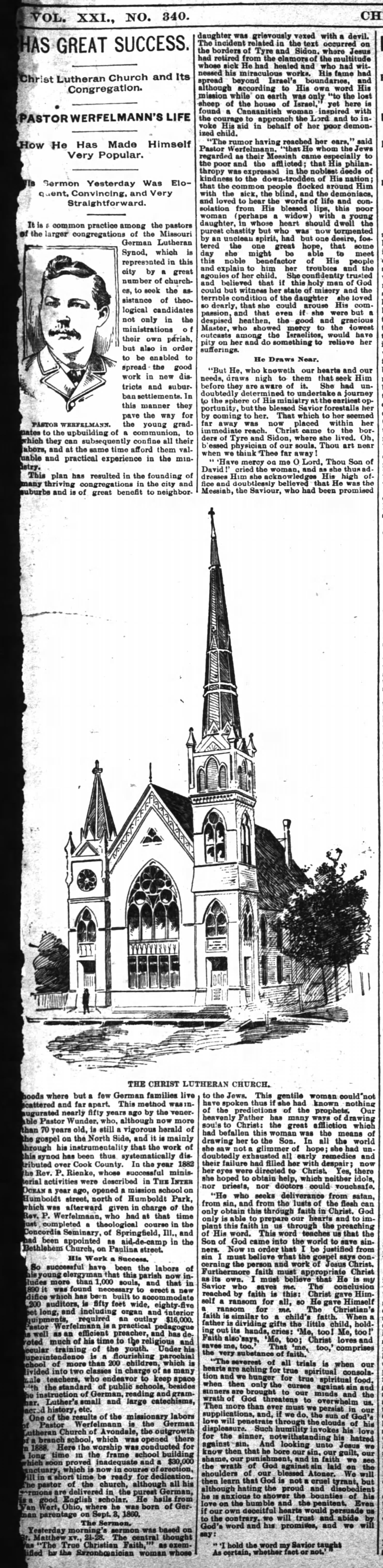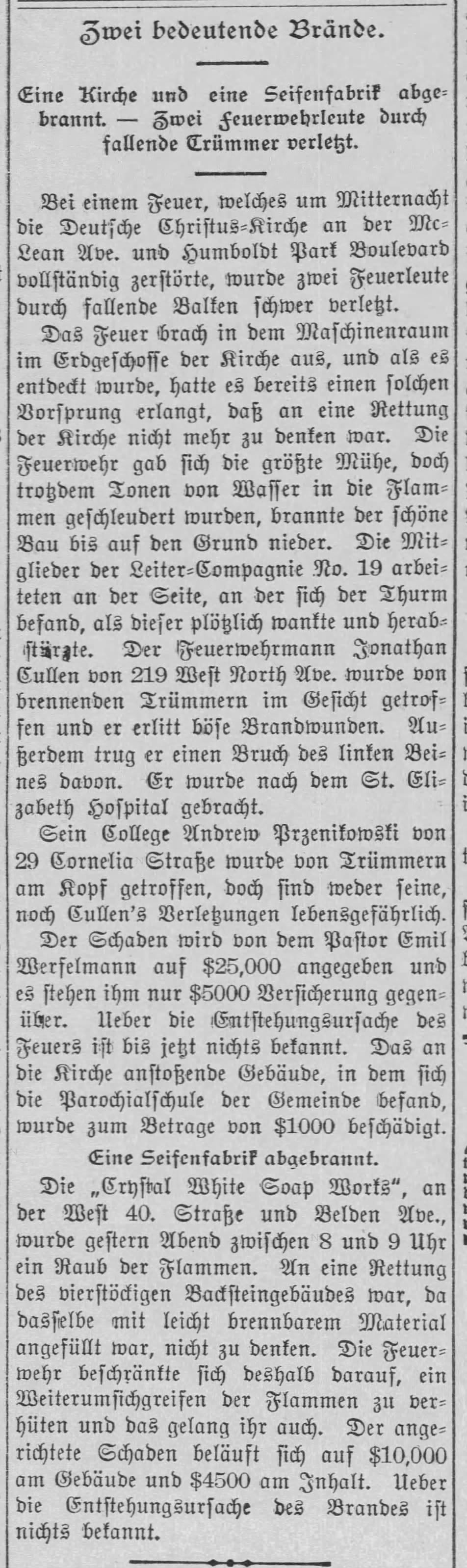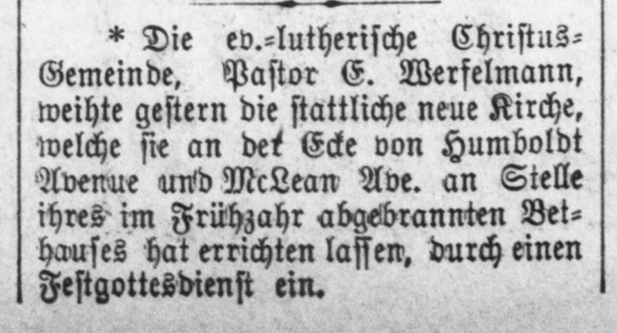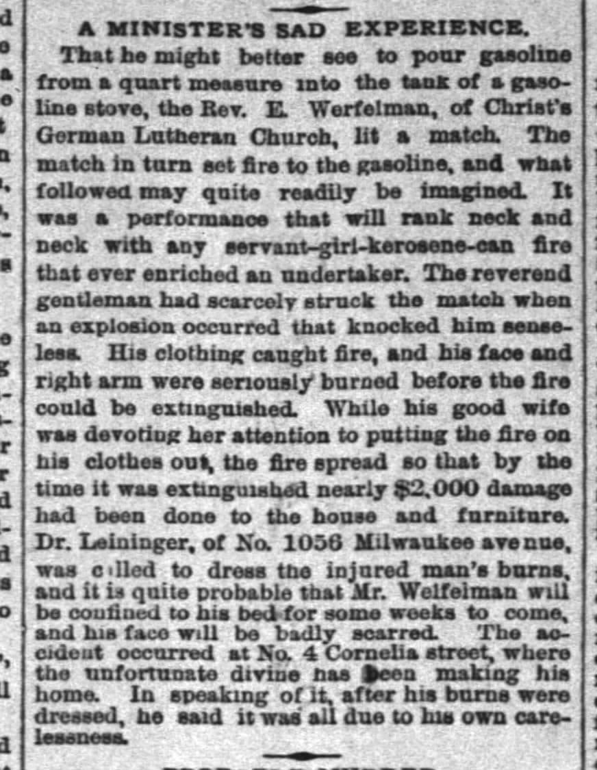 1889, Rev. Werfelmann sets himself on fire | 1896 articles about the fire in the Chicago Tribune, the Inter Ocean, and Abendblatt