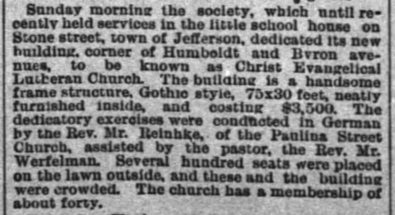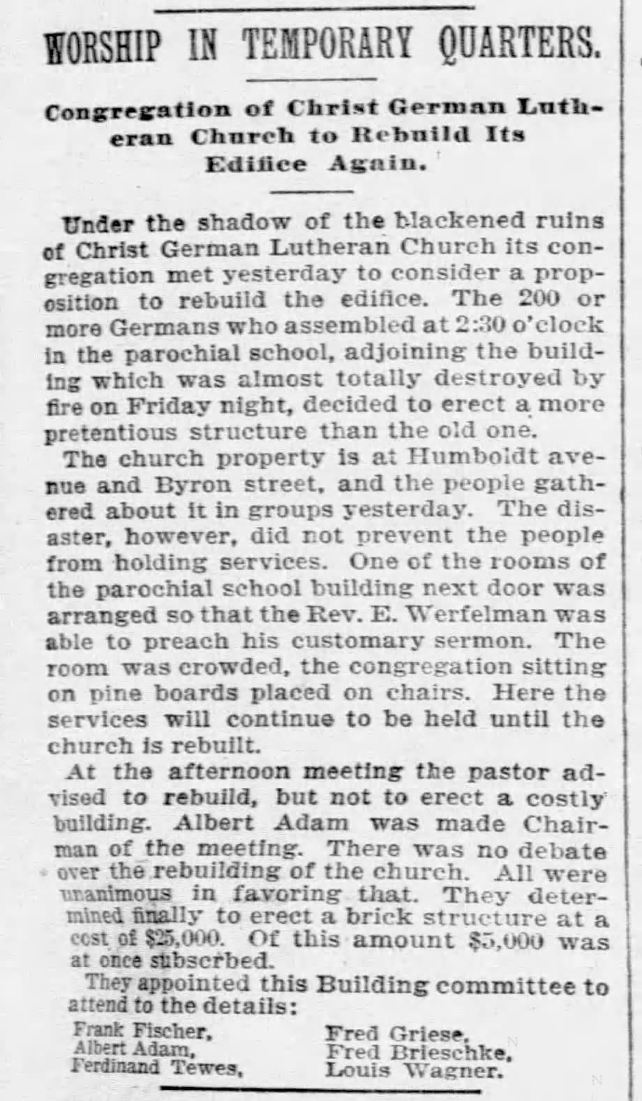1896, Flizikowski & Kaiser hired | 1896, rebuilt church dedicated, Abendpost