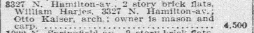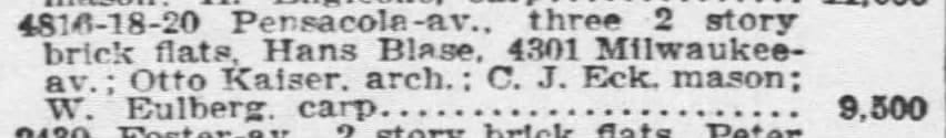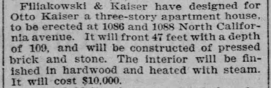 whom little is known", but it looks like Kaiser—an immigrant from Germany—had a solidly productive career designing neighborhood residential as well before dying young in 1917. North Side residential buildings designed by Kaiser include: