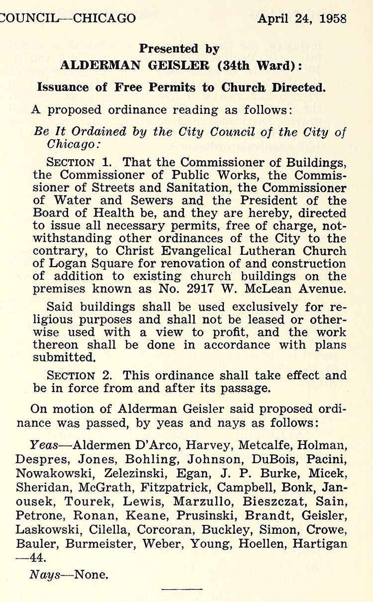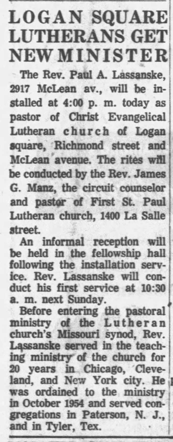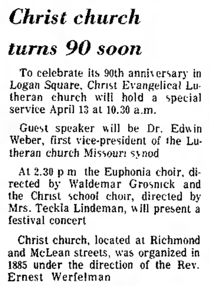 Besides the church, Christ Evangelical Lutheran—Christus Kirche—operated a school next door as well, renovating both the church building and school in 1959. Rev. Werfelmann had led Christus Kirche for 50 years before handing over to Rev. Walter G. Dippold for another couple of decades, but leadership turnover accelerated in the 1950s and 1960s—Rev. Mehlberg to Rev. Krueger to Rev. Lassanske to Rev. Feller. The congregation held services in German into the 1960s, but one of those leadership handovers ended German-language worship—a change inseparable from white flight and the demographic changes in Logan Square, but also the disappearance of the United States’ once-thriving German-language communities because of the World Wars.