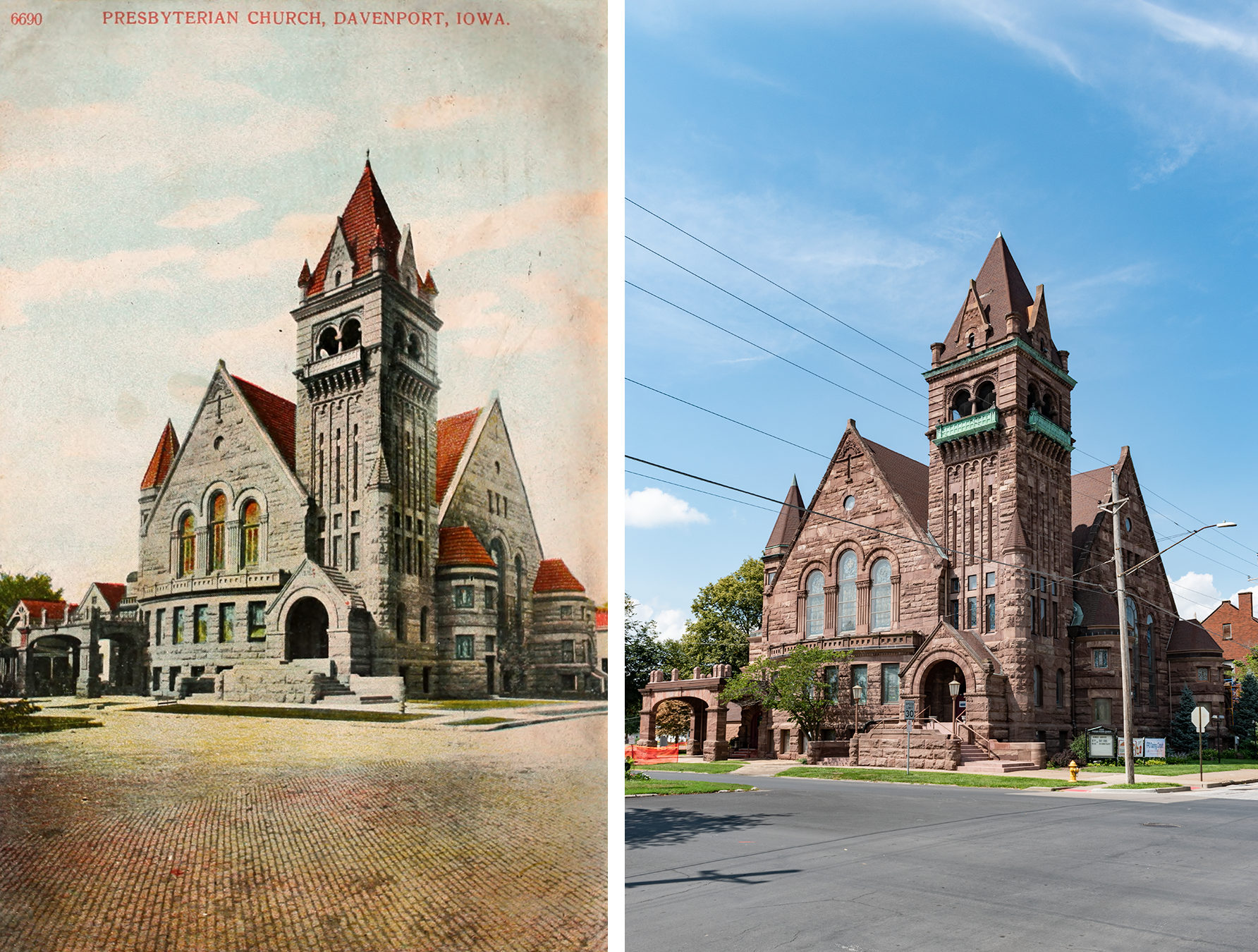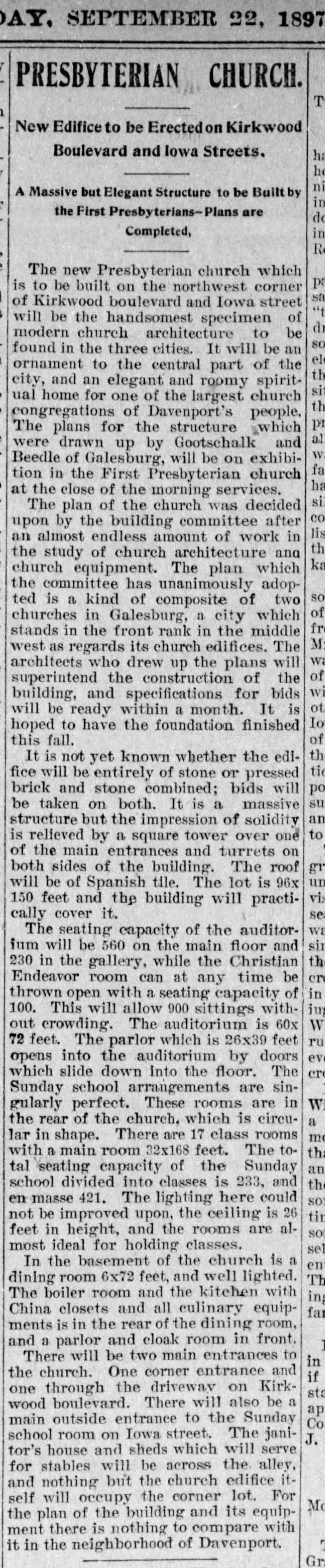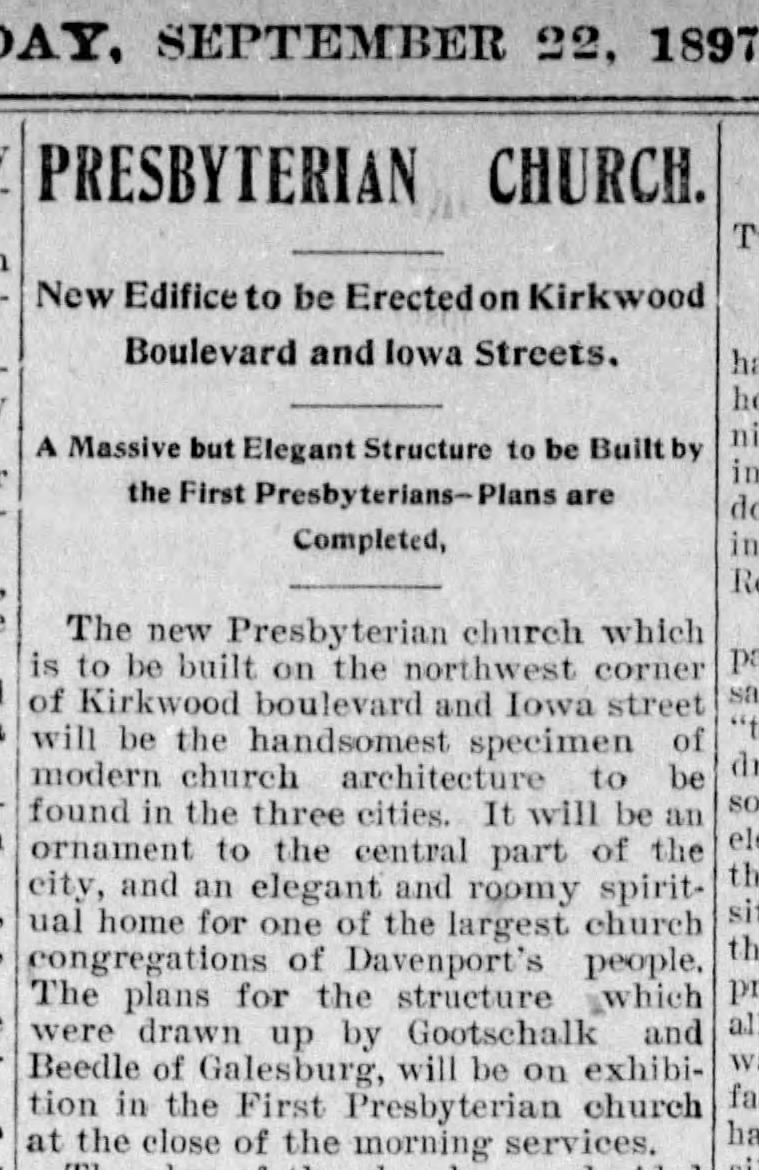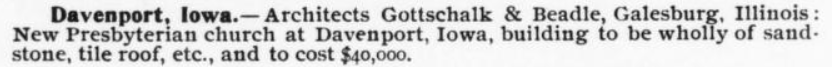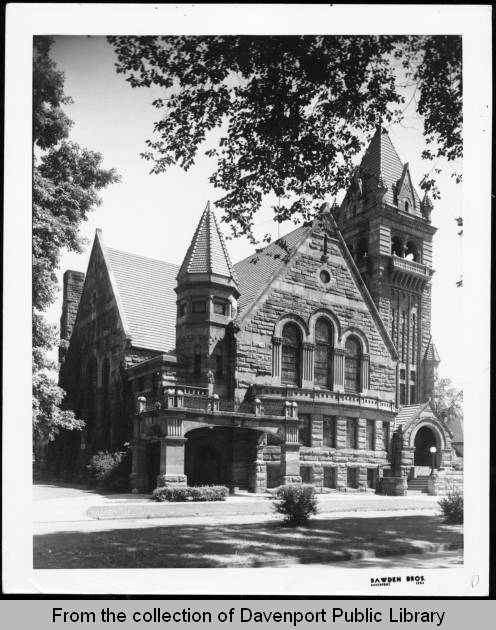 First Presbyterian was the largest Presbyterian congregation in Davenport from 1839 to 1940, with membership peaking at 1500 in 1936. The growing church hired Galesburg’s Gottschalk & Beadle to design them a monumental new home in 1897, drawing upon the firm’s design for the Central Congregational Church in their hometown, which was itself inspired by H.H. Richardson’s Trinity Church in Boston. Gottschalk wasn’t in Illinois long, but together Gottschalk & Beadle also designed Galesburg’s Carnegie Library, which spectacularly burned down in 1958. By 1900, C.E. had moved back to his native San Francisco. Beadle stuck around, designing a handful of Carnegie libraries in Illinois.
