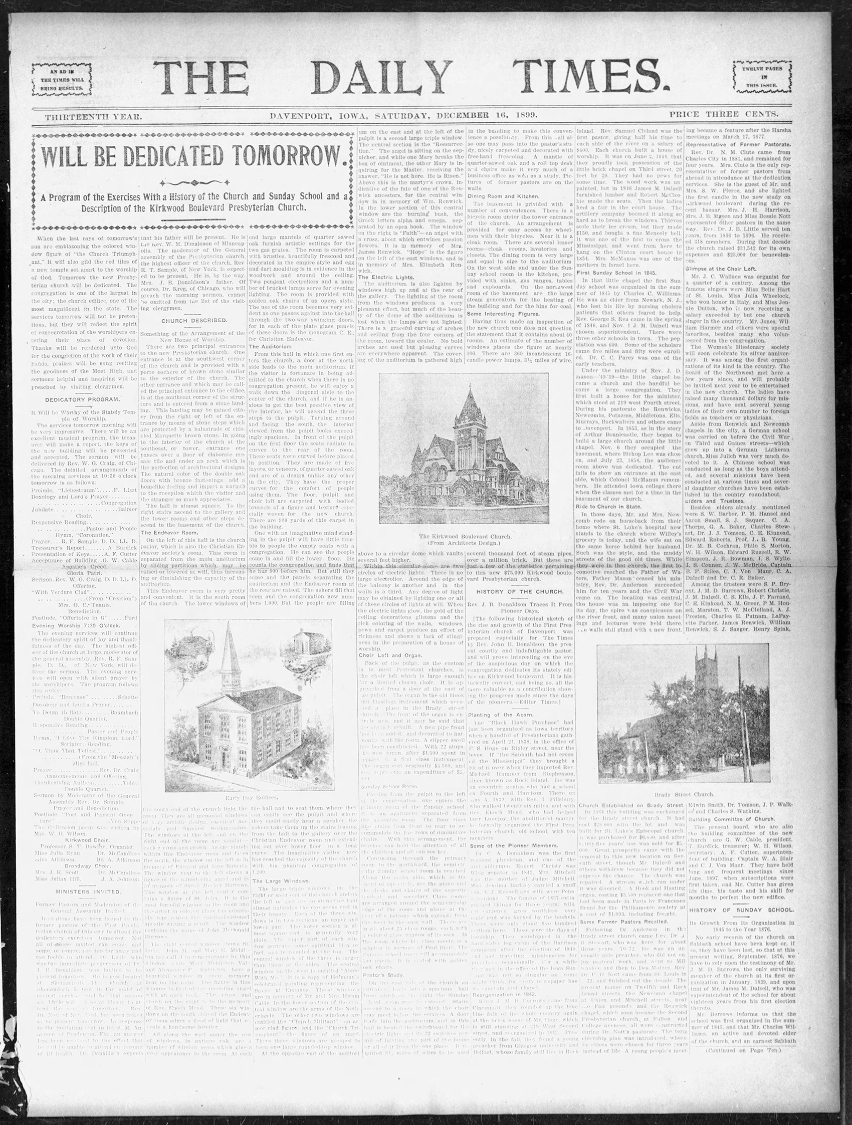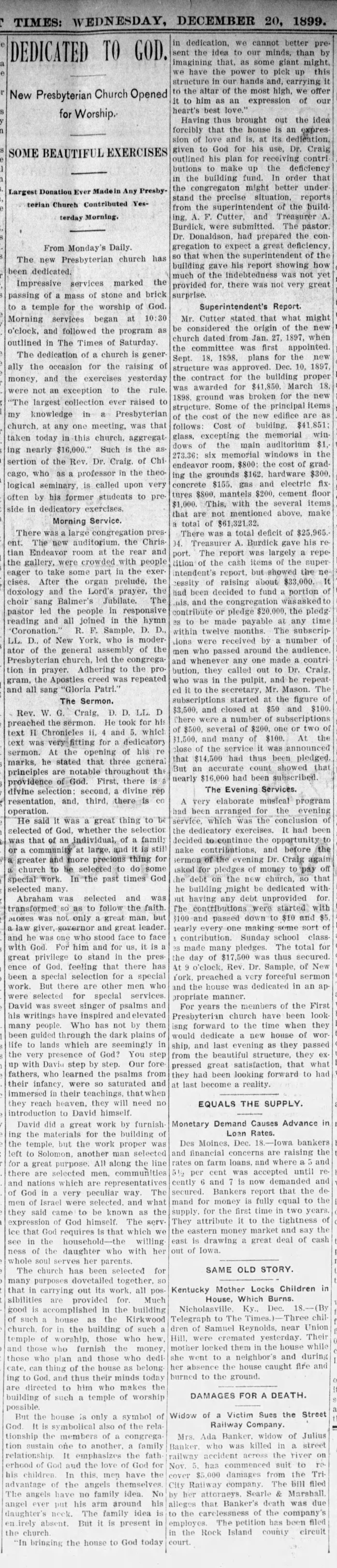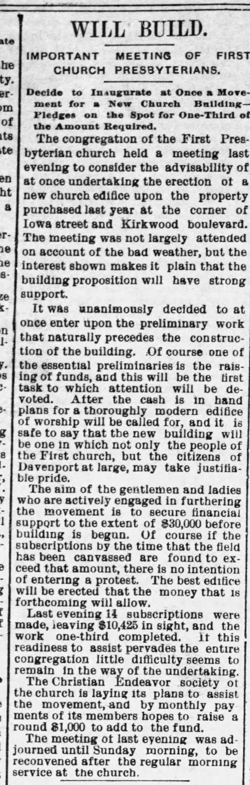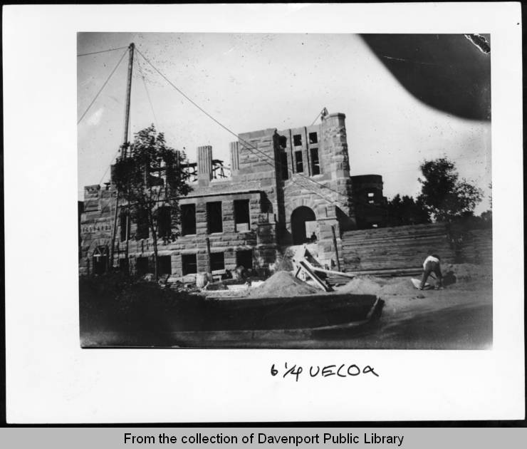 First Presbyterian was the largest Presbyterian congregation in Davenport from 1839 to 1940, with membership peaking at 1500 in 1936. The growing church hired Galesburg’s Gottschalk & Beadle to design them a monumental new home in 1897, drawing upon the firm’s design for the Central Congregational Church in their hometown, which was itself inspired by H.H. Richardson’s Trinity Church in Boston. Gottschalk wasn’t in Illinois long, but together Gottschalk & Beadle also designed Galesburg’s Carnegie Library, which spectacularly burned down in 1958. By 1900, C.E. had moved back to his native San Francisco. Beadle stuck around, designing a handful of Carnegie libraries in Illinois.