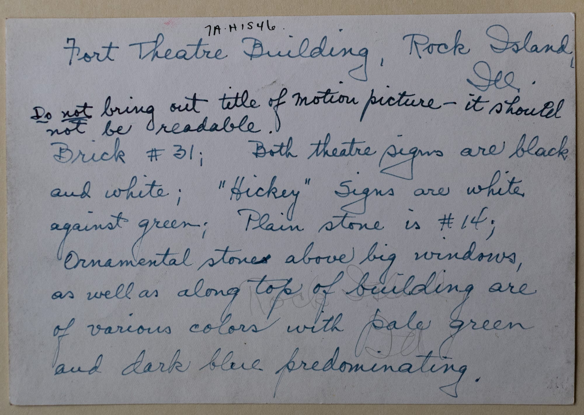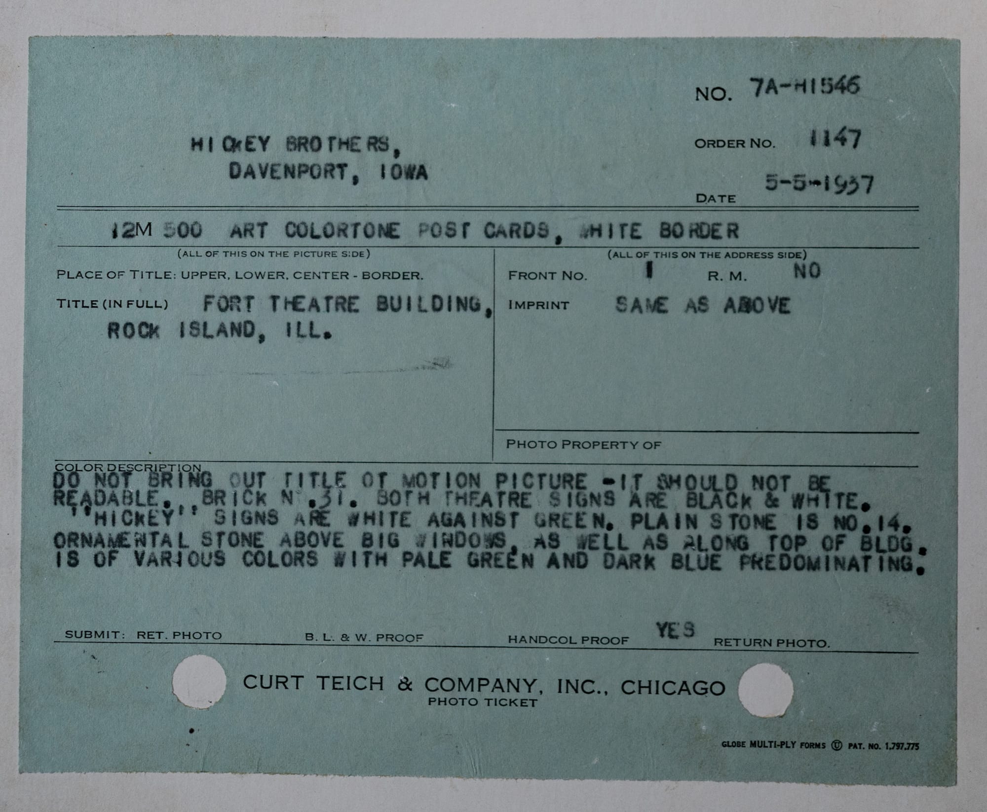 In the production file from the Curt Teich Archive at the Newberry Library, we learn that the customer—the Hickey Bros., the store visible at the corner of the theater—wanted them to make the movie info in the marquee illegible.