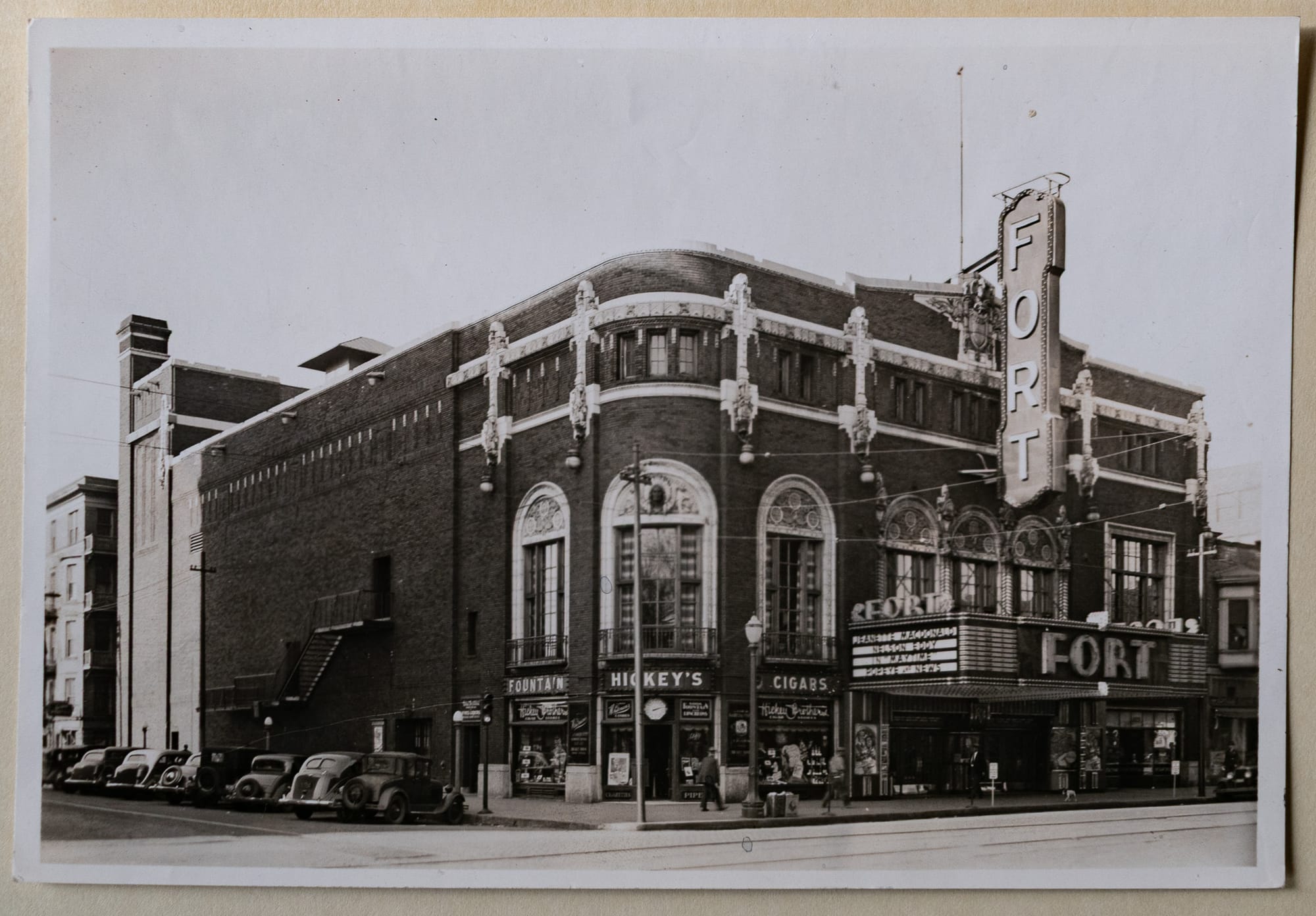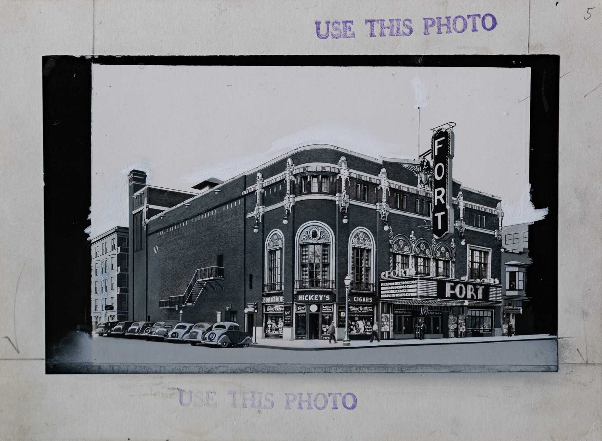 1972 article on the Fort's uncertain future; 1972 article on its opening as a Republican campaign office; 1973 ad on its reopening as an adult theater; 1973 ad and article on the controversy around the theater's screening of Deep Throat