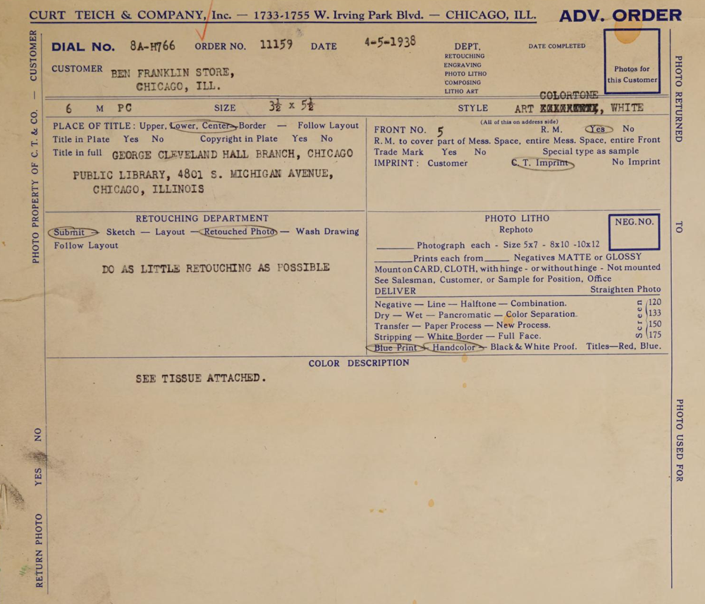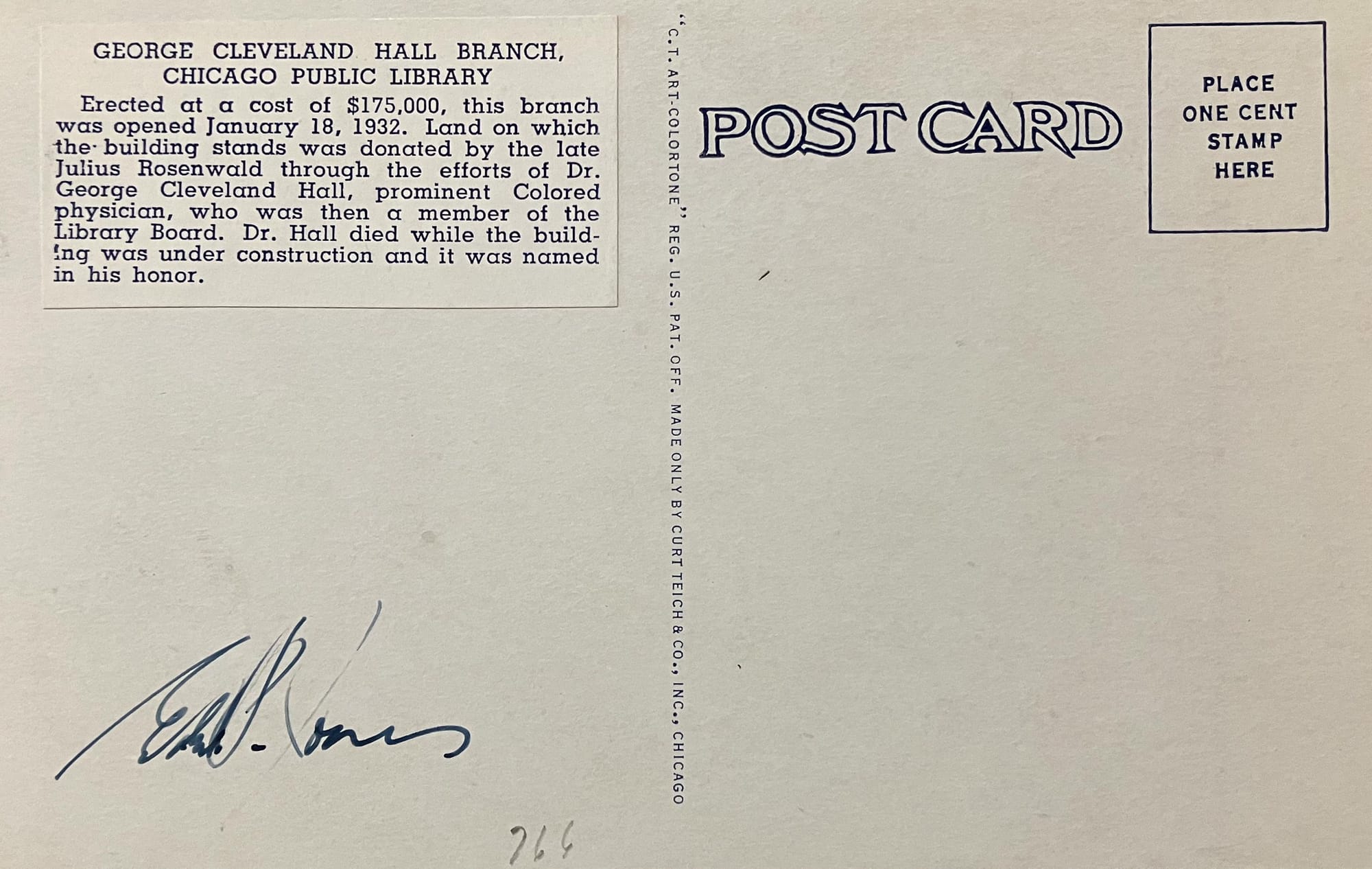 Rich set of production files in the Curt Teich Archive at the Newberry Library for this one. On the production order, we learn that it was commissioned by the Ben Franklin Store, a five-and-dime on 47th St. that was Chicago's first Black-owned department store–really shows what the Hall Branch Library meant to the community.