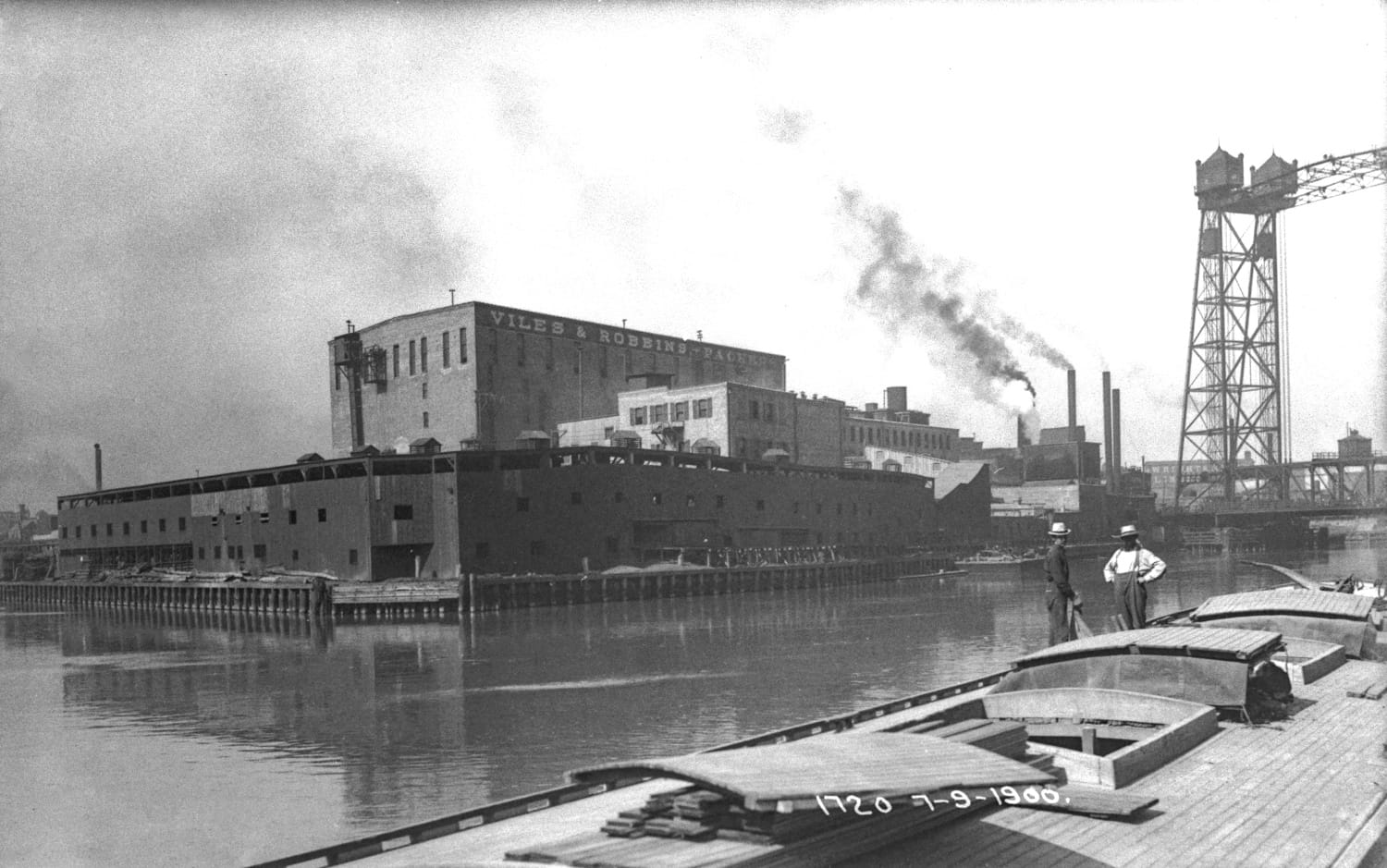 Built for the firm of Viles and Robbins in the 1880s and 1890s, then renamed Omaha Packing Co., the complex to the northwest of the Halsted Street lift bridge was one of a handful of slaughterhouses outside the Union Stockyards. With rail and river shipping delivering livestock and material, Omaha Packing Co. processed pigs, cattle, and sheep. It was eventually bought by meatpacking giant Swift & Co.