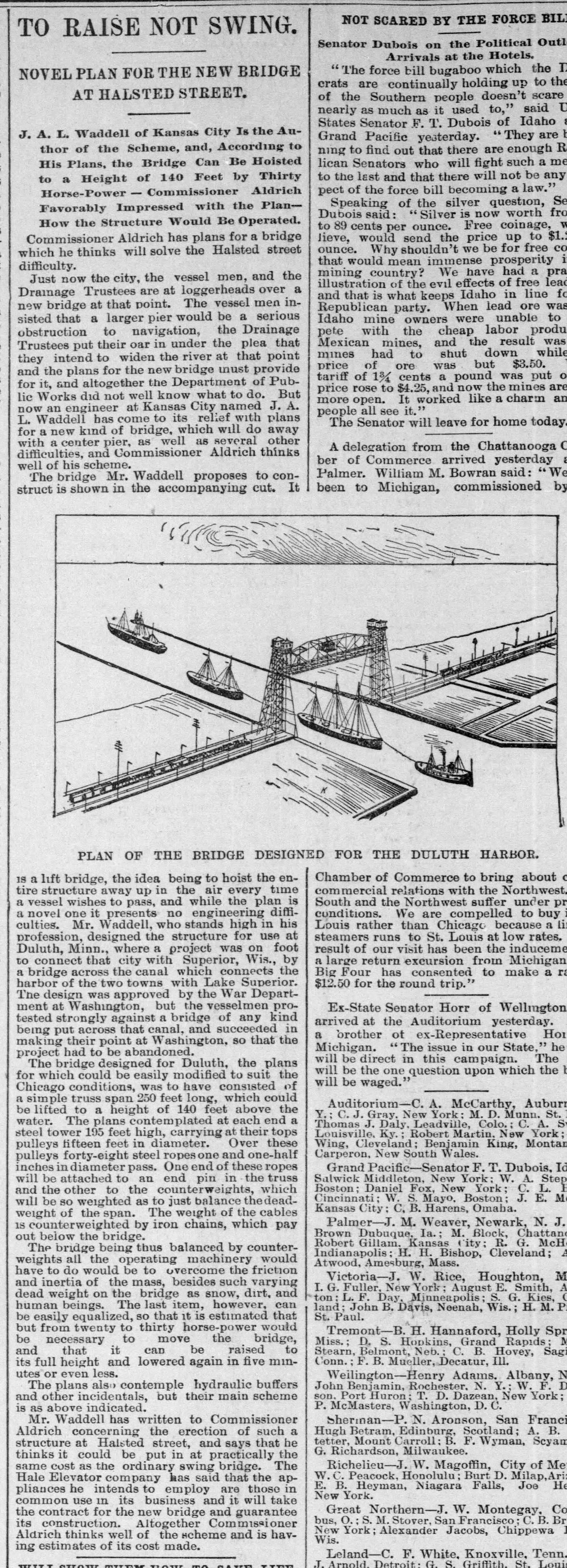 Waddell, already an established bridge builder with a host of patents to his name, had designed a novel vertical lift bridge for the Duluth Ship Canal in the 1890s, but the Department of War–charged with approving plans for all new bridges over navigable waterways to ensure they stayed "reasonably free, easy and unobstructed"–nixed it.