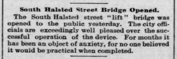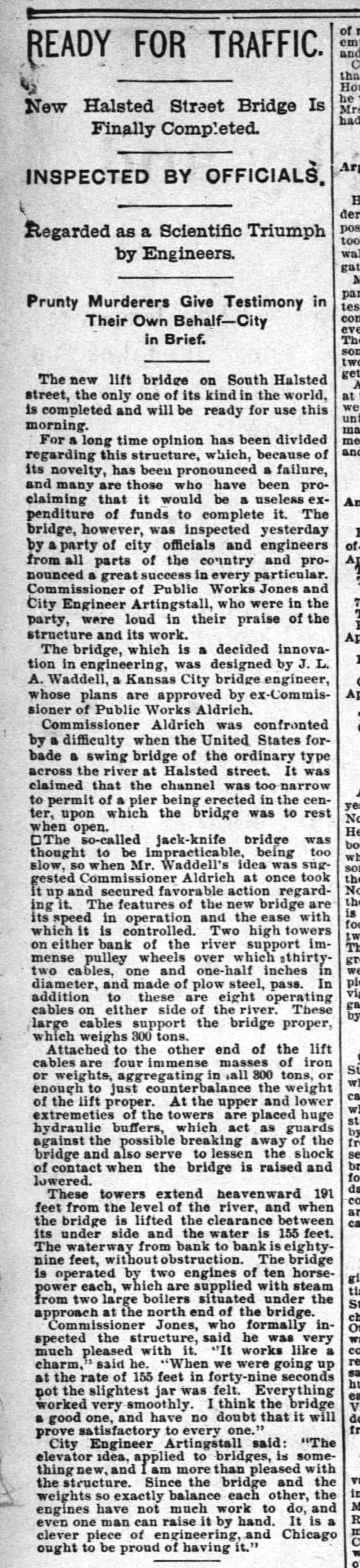 - "The Halsted Street Lift Bridge" by JAL Waddell in the American Society of Civil Engineers, 1894