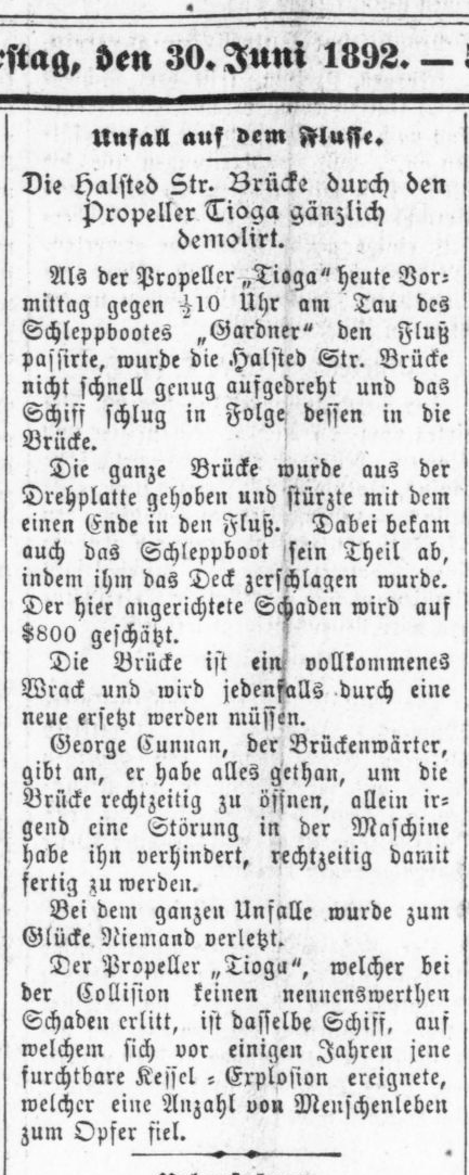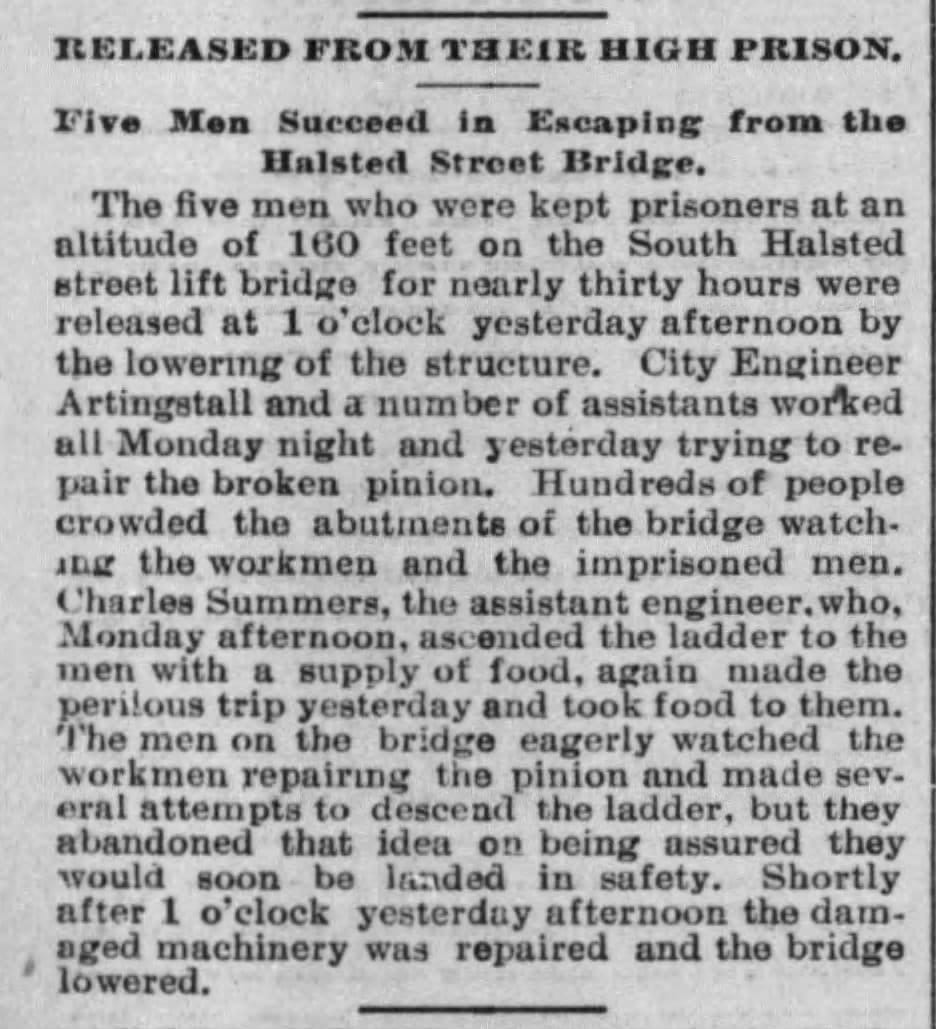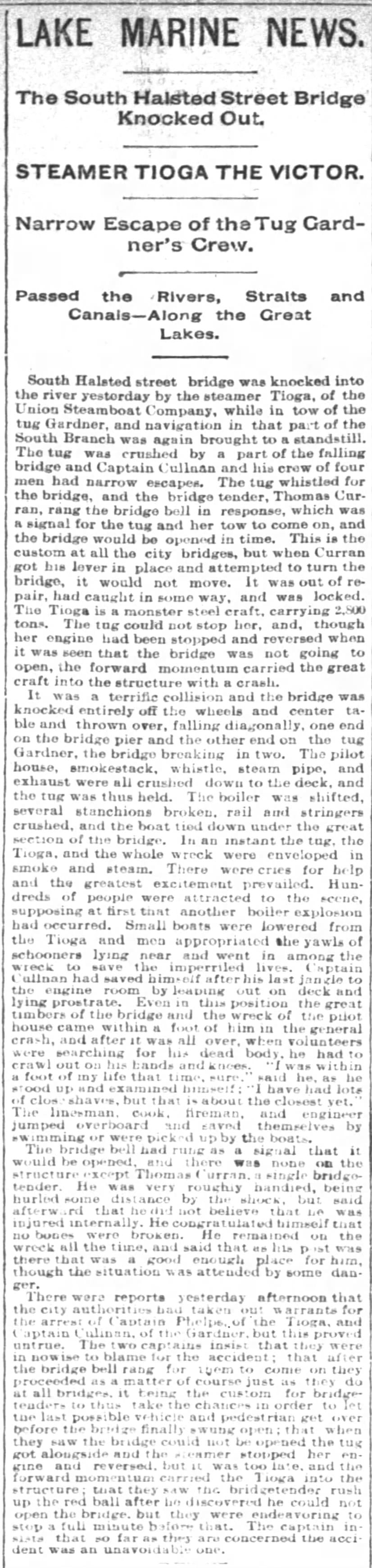 That a vertical lift bridge ended up here at all was the unlikely result of a handful of accidents and failures. First, its predeccesor–the Halsted Street Swing Bridge–was destroyed when the steamer Tioga collided with it in 1892 (the Tioga was a cursed ship–only two years prior, 30 people died when the ship caught fire).