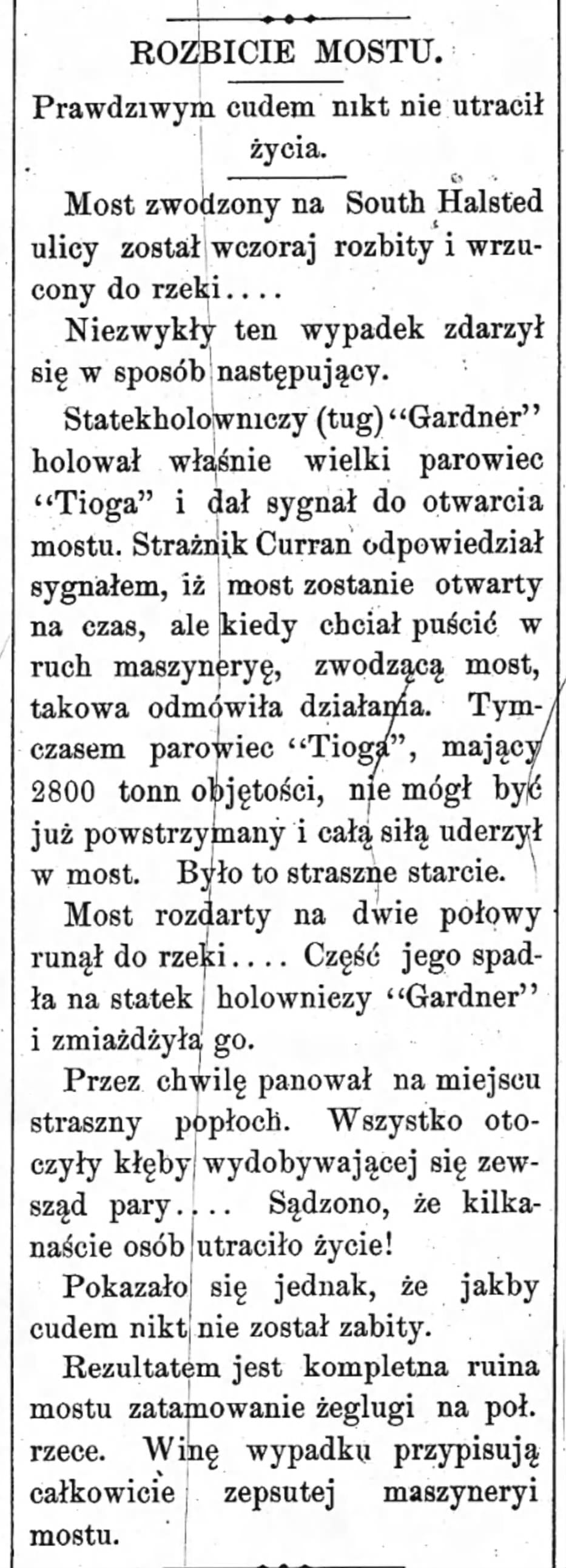 Articles about people and streetcars getting stuck on the raised lift bridge in 1894 and 1896, as well as something falling from it that year